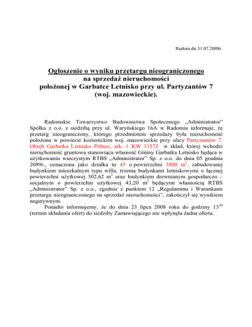 Radom,dn.31.07.2008r. Ogłoszenie o wyniku przetargu nieograniczonego na sprzedaż nieruchomości położonej w Garbatce Letnisko przy ul. Partyzantów 7 (woj. mazowieckie). Radomskie Towarzystwo Budownictwa Społecznego „Administrator” Spółka z o.o. z siedzibą przy ul. Waryńskiego 16A w Radomiu informuje, że przetarg nieograniczony, którego przedmiotem sprzedaży była nieruchomość położona w powiecie kozienickim woj. mazowieckie przy ulicy Partyzantów 7, Obręb Garbatka Letnisko Północ, ark. 1 KW 31572 w skład, której wchodzi nieruchomość gruntowa stanowiąca własność Gminy Garbatka Letnisko będąca w użytkowaniu wieczystym RTBS „Administrator” Sp. z o.o. do dnia 05 grudnia 2089r., oznaczona jako działka nr 45 o powierzchni 3800 m2, zabudowanej budynkiem mieszkalnym typu willa, trzema budynkami letniskowymi o łącznej powierzchni użytkowej 302,62 m2 oraz budynkiem drewnianym gospodarczo – socjalnym o powierzchni użytkowej 43,20 m2 będącymi własnością RTBS „Administrator” Sp. z o.o., zgodnie z punktem 12 „Regulaminu i Warunkami przetargu nieograniczonego na sprzedaż nieruchomości”, zakończył się wynikiem negatywnym. Ponadto informujemy, że do dnia 23 lipca 2008 roku do godziny 1330 (termin składania ofert) do siedziby Zamawiającego nie wpłynęła żadna oferta.