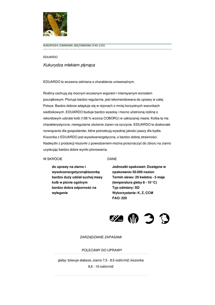 KUKURYDZA ZIARNOWA /KISZONKOWA [FAO 220] EDUARDO Kukurydza mlekiem płynąca EDUARDO to wczesna odmiana o charakterze uniwersalnym. Rośliny cechują się mocnym wczesnym wigorem i intensywnym wzrostem początkowym. Plonuje bardzo regularnie, jest rekomendowana do uprawy w całej Polsce. Bardzo dobrze adaptuje się w rejonach o mniej korzystnych warunkach siedliskowych. EDUARDO buduje bardzo wysoką i mocno ulistnioną roślinę o rekordowym udziale kolb (108 % wzorca COBORU) w zakiszanej masie. Kolba ta ma charakterystyczne, nieregularne ułożenie ziaren na szczycie. EDUARDO to doskonałe rozwiązanie dla gospodarstw, które potrzebują wysokiej jakości paszy dla bydła. Kiszonka z EDUARDO jest wysokoenergetyczna, o bardzo dobrej strawności. Nadwyżki z produkcji kiszonki z powodzeniem można przeznaczyć do zbioru na ziarno uzyskując bardzo dobre wyniki plonowania. W SKRÓCIE DANE do uprawy na ziarno i Jednostki opakowań: Dostępne w wysokoenergetycznąkiszonkę opakowaniu 50.000 nasion bardzo duży udział suchej masy Termin siewu: 20 kwietna - 5 maja kolb w plonie ogólnym (temperatura gleby 8 - 10°C) bardzo dobra odporność na Typ odmiany: SD wyleganie Wykorzystanie: K, Z, CCM FAO: 220 ZARZĄDZANIE ZAPASAMI POLECAMY DO UPRAWY gleby: toleruje słabsze, ziarno 7,5 - 8,5 roślin/m2; kiszonka 9,5 - 10 roślin/m2