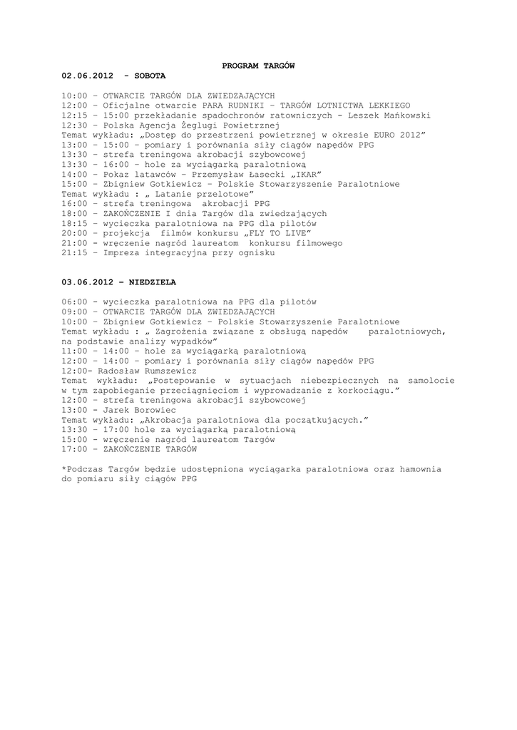 PROGRAM TARGÓW 02.06.2012 10:00 12:00 12:15 12:30 Temat 13:00 13:30 13:30 14:00 15:00 Temat 16:00 18:00 18:15 20:00 21:00 21:15 - SOBOTA – OTWARCIE TARGÓW DLA ZWIEDZAJĄCYCH – Oficjalne otwarcie PARA RUDNIKI – TARGÓW LOTNICTWA LEKKIEGO – 15:00 przekładanie spadochronów ratowniczych - Leszek Mańkowski – Polska Agencja Żeglugi Powietrznej wykładu: „Dostęp do przestrzeni powietrznej w okresie EURO 2012” – 15:00 – pomiary i porównania siły ciągów napędów PPG – strefa treningowa akrobacji szybowcowej – 16:00 – hole za wyciągarką paralotniową – Pokaz latawców – Przemysław Łasecki „IKAR” – Zbigniew Gotkiewicz – Polskie Stowarzyszenie Paralotniowe wykładu : „ Latanie przelotowe” – strefa treningowa akrobacji PPG – ZAKOŃCZENIE I dnia Targów dla zwiedzających – wycieczka paralotniowa na PPG dla pilotów – projekcja filmów konkursu „FLY TO LIVE” - wręczenie nagród laureatom konkursu filmowego – Impreza integracyjna przy ognisku 03.06.2012 – NIEDZIELA 06:00 - wycieczka paralotniowa na PPG dla pilotów 09:00 – OTWARCIE TARGÓW DLA ZWIEDZAJĄCYCH 10:00 – Zbigniew Gotkiewicz – Polskie Stowarzyszenie Paralotniowe Temat wykładu : „ Zagrożenia związane z obsługą napędów paralotniowych, na podstawie analizy wypadków” 11:00 – 14:00 – hole za wyciągarką paralotniową 12:00 – 14:00 – pomiary i porównania siły ciągów napędów PPG 12:00- Radosław Rumszewicz Temat wykładu: „Postepowanie w sytuacjach niebezpiecznych na samolocie w tym zapobieganie przeciągnięciom i wyprowadzanie z korkociągu.” 12:00 – strefa treningowa akrobacji szybowcowej 13:00 - Jarek Borowiec Temat wykładu: „Akrobacja paralotniowa dla początkujących.” 13:30 – 17:00 hole za wyciągarką paralotniową 15:00 - wręczenie nagród laureatom Targów 17:00 – ZAKOŃCZENIE TARGÓW *Podczas Targów będzie udostępniona wyciągarka paralotniowa oraz hamownia do pomiaru siły ciągów PPG