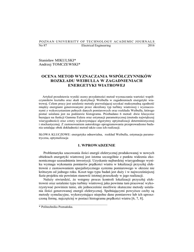 ocena metod wyznaczania współczynników rozkładu weibulla w