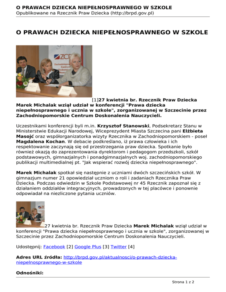 O PRAWACH DZIECKA NIEPEŁNOSPRAWNEGO W SZKOLE Opublikowane na Rzecznik Praw Dziecka (http://brpd.gov.pl) O PRAWACH DZIECKA NIEPEŁNOSPRAWNEGO W SZKOLE [1]27 kwietnia br. Rzecznik Praw Dziecka Marek Michalak wziął udział w konferencji "Prawa dziecka niepełnosprawnego i ucznia w szkole", zorganizowanej w Szczecinie przez Zachodniopomorskie Centrum Doskonalenia Nauczycieli. Uczestnikami konferencji byli m.in. Krzysztof Stanowski, Podsekretarz Stanu w Ministerstwie Edukacji Narodowej, Wiceprezydent Miasta Szczecina pani Elżbieta Masojć oraz współorganizatorka wizyty Rzecznika w Zachodniopomorskiem - poseł Magdalena Kochan. W debacie podkreślano, iż prawa człowieka i ich respektowanie zaczynają się od przestrzegania praw dziecka. Spotkanie było również okazją do zaprezentowania dyrektorom i pedagogom przedszkoli, szkół podstawowych, gimnazjalnych i ponadgimnazjalnych woj. zachodniopomorskiego publikacji multimedialnej pt. "Jak wspierać rozwój dziecka niepełnosprawnego". Marek Michalak spotkał się następnie z uczniami dwóch szczecińskich szkół. W gimnazjum numer 21 opowiedział uczniom o roli i zadaniach Rzecznika Praw Dziecka. Podczas odwiedzin w Szkole Podstawowej nr 45 Rzecznik zapoznał się z działaniem oddziałów integracyjnych, prowadzonych w tej placówce i ponownie odpowiadał na niezliczone pytania uczniów. 27 kwietnia br. Rzecznik Praw Dziecka Marek Michalak wziął udział w konferencji "Prawa dziecka niepełnosprawnego i ucznia w szkole", zorganizowanej w Szczecinie przez Zachodniopomorskie Centrum Doskonalenia Nauczycieli. Udostępnij: Facebook [2] Google Plus [3] Twitter [4] Adres URL źródła: http://brpd.gov.pl/aktualnosci/o-prawach-dzieckaniepelnosprawnego-w-szkole Odnośniki: Strona 1 z 2 O PRAWACH DZIECKA NIEPEŁNOSPRAWNEGO W SZKOLE Opublikowane na Rzecznik Praw Dziecka (http://brpd.gov.pl) [1] http://brpd.gov.pl/sites/default/files/rpd_stare/img/szczecin.jpg [2] http://facebook.com/sharer.php?u=http%3A%2F%2Fbrpd.gov.pl%2Faktualnosci %2Fo-prawach-dziecka-niepelnosprawnego-w-szkole&t=O%20PRAWACH%20D ZIECKA%20NIEPE%C5%81NOSPRAWNEGO%20W%20SZKOLE [3] https://plus.google.com/share?url=http%3A%2F%2Fbrpd.gov.pl%2Faktualnosci %2Fo-prawach-dziecka-niepelnosprawnego-w-szkole [4] http://twitter.com/intent/tweet?url=http%3A%2F%2Fbrpd.gov.pl%2Faktualnosci %2Fo-prawach-dziecka-niepelnosprawnego-w-szkole&text=O%20PRAWACH%2 0DZIECKA%20NIEPE%C5%81NOSPRAWNEGO%20W%20SZKOLE Strona 2 z 2