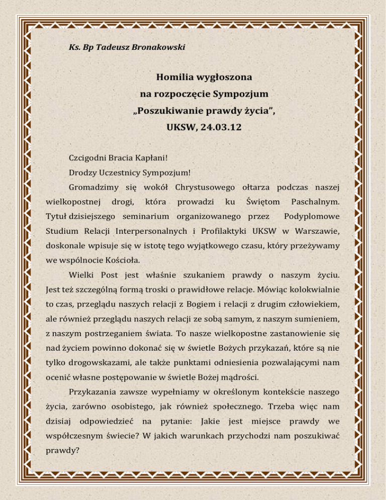 Ks. Bp Tadeusz Bronakowski Homilia wygłoszona na rozpoczęcie Sympozjum „Poszukiwanie prawdy życia”, UKSW, 24.03.12 Czcigodni Bracia Kapłani! Drodzy Uczestnicy Sympozjum! Gromadzimy się wokół Chrystusowego ołtarza podczas naszej wielkopostnej drogi, która prowadzi ku Świętom Tytuł dzisiejszego seminarium organizowanego przez Paschalnym. Podyplomowe Studium Relacji Interpersonalnych i Profilaktyki UKSW w Warszawie, doskonale wpisuje się w istotę tego wyjątkowego czasu, który przeżywamy we wspólnocie Kościoła. Wielki Post jest właśnie szukaniem prawdy o naszym życiu. Jest też szczególną formą troski o prawidłowe relacje. Mówiąc kolokwialnie to czas, przeglądu naszych relacji z Bogiem i relacji z drugim człowiekiem, ale również przeglądu naszych relacji ze sobą samym, z naszym sumieniem, z naszym postrzeganiem świata. To nasze wielkopostne zastanowienie się nad życiem powinno dokonać się w świetle Bożych przykazań, które są nie tylko drogowskazami, ale także punktami odniesienia pozwalającymi nam ocenić własne postępowanie w świetle Bożej mądrości. Przykazania zawsze wypełniamy w określonym kontekście naszego życia, zarówno osobistego, jak również społecznego. Trzeba więc nam dzisiaj odpowiedzieć na pytanie: Jakie jest miejsce prawdy we współczesnym świecie? W jakich warunkach przychodzi nam poszukiwać prawdy? Już pobieżny ogląd współczesnego świata budzi nasze zaniepokojenie. Widzimy dzisiaj wiele zjawisk, które w dużym stopniu utrudniają poszukiwanie prawdy i trwanie przy niej. Ktoś może powiedzieć, że tak było zawsze. Nasza narodowa historia, zarówno w czasach zaborów, jak i czasach komunizmu, naznaczona była zbrodniami dokonywanymi na prawdzie. Zaborcy, okupanci czy słudzy wrogiego mocarstwa poprzez cenzurę i propagandę starali się zamazywać prawdę i tworzyć swoje własne kanony myślenia i postrzegania świata w wymiarze nie tylko narodowym, ale także moralnym i religijnym. Przez pokolenia Polacy potrafili do pewnego stopnia obronić się przed tymi jawnymi atakami na prawdę. Jednak dzisiaj obserwujemy bolesny paradoks. Żyjemy w wolnym świecie, w warunkach tzw. liberalnej demokracji. Panuje rzekomo wolność słowa, a standardy medialnego świata podobno wykluczają wszelką manipulację i gwarantują obiektywizm. Rzeczywistość jest jednak inna. Żyjemy dzisiaj w nowej formie totalitaryzmu. Ten totalitaryzm wiąże się właśnie z niepodzielnym panowaniem mediów, które w istocie nie służą pokazywaniu prawdy i wyjaśnianiu świata, ale promowaniu określonych postaw, stylów życia i mód. Amerykański medioznawca Walter Lippman już wiele lat temu stworzył pojęcie agenda-setting. Opisuje ono zjawisko podejmowania w największych koncernach medialnych decyzji o tym, o czym się mówi, a o czym się milczy. Ten codzienny wybór tematów ma ogromne znaczenie dla kształtowania się opinii publicznej. Gdy przeprowadzano badania społeczne w wielu krajach, okazywało się najczęściej, że ludzie myślą o wielu zjawiskach w taki sposób, w jaki mówiły o tym media. O tym, o czym media milczą, ludzie nie mają żadnego pojęcia. Niewiele osób stawia sobie pytanie, dlaczego właśnie o takich, a nie innych tematach się mówi? Dlaczego np. dyskusja o roli Kościoła w naszym społeczeństwie zawsze inicjowana jest przez tematy kontrowersyjne, ukazujące Kościół w złym świetle? Dlaczego tak rzadko punktem wyjścia do tej dyskusji są informacje pozytywne, pokazujące np. działalność charytatywną, oświatową i społeczną Kościoła? Czy myślimy czasami, dlaczego największe media tak panicznie boją się rzetelnej rozmowy o problemach uzależnień? Dlaczego kwestie związane z pijaństwem i alkoholizmem poruszane są jedynie w przypadku jakiś ekstremalnych sytuacji, które pozwalają odbiorcom uważać, że jest to jedynie problem jakiegoś marginesu społecznego, a nie każdego z nas? A co mamy myśleć o nadmiarze informacji związanych z konsumpcją, z wygodnym życiem, z niekończącą się zabawą? Czy zastanawiamy się nad obecnością, a raczej nieobecnością języka religijnego w naszych mediach? Takich tematów i przykładów moglibyśmy przywołać dzisiaj setki. Poprzestańmy na tych kilku, które obrazują współczesną grę prawdą. Niewielka grupa ludzi wybiera tematy, którymi następnie karmione są miliony odbiorców. Te treści przyswajane są w sposób niemal podświadomy. Dzisiaj bowiem każdy z nas w ciągu jednego dnia wystawiony jest na działanie większej liczby impulsów informacyjnych, niż wielu naszych pradziadków odbierało przez całe życie. Rozumiemy zatem, jak trudne jest już nie tylko weryfikowanie tych informacji, sprawdzanie ich autentyczności, ale same porządkowanie i odrzucanie tych złych, niemądrych, grzesznych. Problemy z porządkowaniem informacji, światopoglądów, opinii, obserwowanych postaw mają ludzie dorośli i doświadczeni. Cóż zatem mówić o ludziach młodych, którzy wręcz nie są odbiorcami mediów, ale żyją w mediach. Dzięki Internetowi i nowoczesnym urządzeniom komunikacyjno-multimedialnym wielu współczesnych ludzi, właśnie najmłodszych, nie rozstaje się z mediami. Trwają w czymś, co parafrazując francuskiego socjologa Jeana Baudrillarda można nazwać „ekstazą komunikacji”. Dla nich wytwory świata mediów nie różnią się niczym od realnie istniejących zjawisk. To, co jest w telewizji i Internecie jest ich światem. Poza tym nie ma dla nich świata. Zapytajmy więc, czy i gdzie w tej multimedialnej rzeczywistości jest dzisiaj miejsce Boga? Czyż, mówiąc językiem kulturoznawców, Bóg w mediach nie został sprowadzony do roli „Wielkiego Nieobecnego”? Widzimy przecież tak silny strach mediów przed mówieniem o religii, przed Przykazaniami Bożymi. Widzimy, że w tej medialnej rzeczywistości nie rządzi prawda Ewangelii, ale pseudo-mądrości tak zwanych „celebrytów