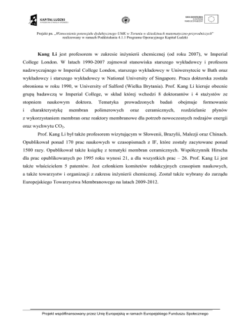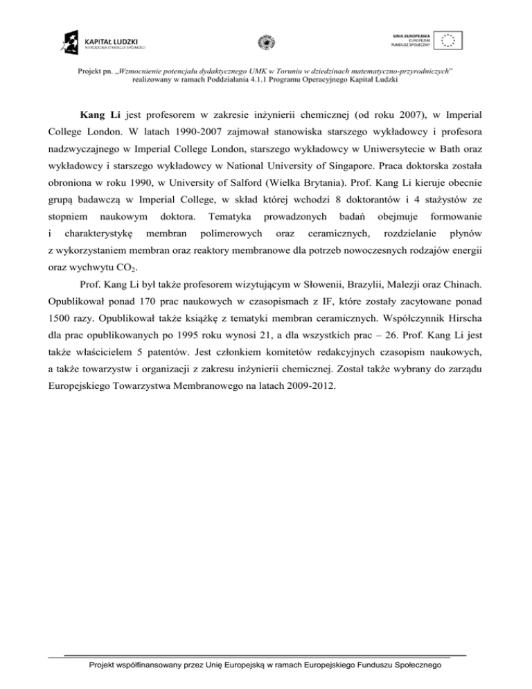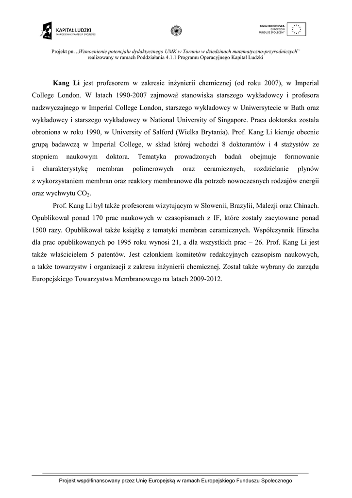 Projekt pn. „Wzmocnienie potencjału dydaktycznego UMK w Toruniu w dziedzinach matematyczno-przyrodniczych” realizowany w ramach Poddziałania 4.1.1 Programu Operacyjnego Kapitał Ludzki Kang Li jest profesorem w zakresie inżynierii chemicznej (od roku 2007), w Imperial College London. W latach 1990-2007 zajmował stanowiska starszego wykładowcy i profesora nadzwyczajnego w Imperial College London, starszego wykładowcy w Uniwersytecie w Bath oraz wykładowcy i starszego wykładowcy w National University of Singapore. Praca doktorska została obroniona w roku 1990, w University of Salford (Wielka Brytania). Prof. Kang Li kieruje obecnie grupą badawczą w Imperial College, w skład której wchodzi 8 doktorantów i 4 stażystów ze stopniem i naukowym charakterystykę doktora. membran Tematyka polimerowych prowadzonych oraz badań ceramicznych, obejmuje formowanie rozdzielanie płynów z wykorzystaniem membran oraz reaktory membranowe dla potrzeb nowoczesnych rodzajów energii oraz wychwytu CO2. Prof. Kang Li był także profesorem wizytującym w Słowenii, Brazylii, Malezji oraz Chinach. Opublikował ponad 170 prac naukowych w czasopismach z IF, które zostały zacytowane ponad 1500 razy. Opublikował także książkę z tematyki membran ceramicznych. Współczynnik Hirscha dla prac opublikowanych po 1995 roku wynosi 21, a dla wszystkich prac – 26. Prof. Kang Li jest także właścicielem 5 patentów. Jest członkiem komitetów redakcyjnych czasopism naukowych, a także towarzystw i organizacji z zakresu inżynierii chemicznej. Został także wybrany do zarządu Europejskiego Towarzystwa Membranowego na latach 2009-2012. Projekt współfinansowany przez Unię Europejską w ramach Europejskiego Funduszu Społecznego