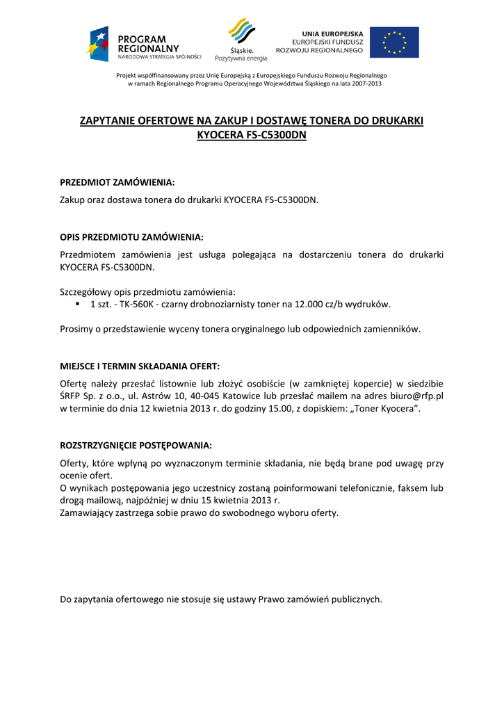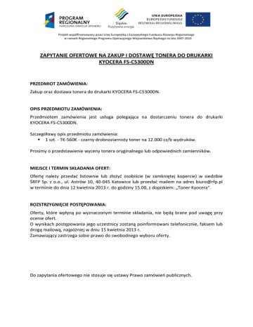 Projekt współfinansowany przez Unię Europejską z Europejskiego Funduszu Rozwoju Regionalnego w ramach Regionalnego Programu Operacyjnego Województwa Śląskiego na lata 2007-2013 ZAPYTANIE OFERTOWE NA ZAKUP I DOSTAWĘ TONERA DO DRUKARKI KYOCERA FS-C5300DN PRZEDMIOT ZAMÓWIENIA: Zakup oraz dostawa tonera do drukarki KYOCERA FS-C5300DN. OPIS PRZEDMIOTU ZAMÓWIENIA: Przedmiotem zamówienia jest usługa polegająca na dostarczeniu tonera do drukarki KYOCERA FS-C5300DN. Szczegółowy opis przedmiotu zamówienia: 1 szt. - TK-560K - czarny drobnoziarnisty toner na 12.000 cz/b wydruków. Prosimy o przedstawienie wyceny tonera oryginalnego lub odpowiednich zamienników. MIEJSCE I TERMIN SKŁADANIA OFERT: Ofertę należy przesład listownie lub złożyd osobiście (w zamkniętej kopercie) w siedzibie ŚRFP Sp. z o.o., ul. Astrów 10, 40-045 Katowice lub przesład mailem na adres [email protected] w terminie do dnia 12 kwietnia 2013 r. do godziny 15.00, z dopiskiem: „Toner Kyocera”. ROZSTRZYGNIĘCIE POSTĘPOWANIA: Oferty, które wpłyną po wyznaczonym terminie składania, nie będą brane pod uwagę przy ocenie ofert. O wynikach postępowania jego uczestnicy zostaną poinformowani telefonicznie, faksem lub drogą mailową, najpóźniej w dniu 15 kwietnia 2013 r. Zamawiający zastrzega sobie prawo do swobodnego wyboru oferty. Do zapytania ofertowego nie stosuje się ustawy Prawo zamówieo publicznych.