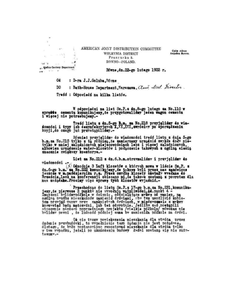 i ; t4 wr ,0 „>' Medico-Sanitary Department. AMERICAN JOINT DISTRIBUTION COMMITTEE WOLHYNIA DISTRICT P r a n c u f k a 2, ROWNO-l'OLAND. Cabl§ Adress AmjVoo ibm, Bdwne,dn.22-go lutago 1922 r. Od : D-ra J.J.Goluba.Bdwna DO : Bath-Houaa Dapartmant,farssawa,<2W/7 <4OL</. Ai>iu2ri> Tra£d : Odpowiedg na kilka liatdw. W odpowiadzi aa l i s t Sz.P.z dn.8-go lutago sa No.110 w sprawwa oamantu komunikujamy,2« przygotowalismv jadan wagon eamantw i wieeaj nie potrzabujemy.TraSd l i a t u z dn.5-go B.m. sa No.218 przyjelismy do wiadomoSoi i typy izb dazynfakcyjnych A,TX,HX,zwrdeiTW po sporzadzaniu kopji,do czego juz przystapilismy*Rdwniaz przyjelismv do wiadomoSci tre£d l i s t u z dnia 5-go b.m.za No.215 tylko z ta roznica,za samiarzamy urzadzid zwykie doi^ niatvlko w mniaj zaludnionvch miajsoowosciaeh laoz i wiecai zaludnionvch, albowiam urzadzania water-l&ozatdw i poiaczania takowyen s ogdlna aiacia znacznia zwiekszy kosztorys.Liat za No.212 z dn.6.b.n.otrz7naliSmv i przyjeliimv do wiadomos'ci .r.i LX) Odnosnia 3 Luft klozatdw o ktdrveh mowa w l i s c i a Sz.P. s dn.6-go b.m. sa No.222 komunikujamy.z'a takowa byli przaz nas zamdwiona leszcsa w m.pazdziarniku r . s . Prsaz omvike Jdozaty zftsta£y wvs3tana do Brzagcia.laoz na konferenoji obieoano mi,za takowa zostana s powrotam dla naa zazadaka.Prosimy wiec sprawe tybh KLozatow wyjasnid.Przachodzac do l i s t u Sz.P.z 17-go b.m.za No.231,komunikuiamy,ze piarwaza 3 punktv nia wvwolnia watpliwo^oi.Ad.punkt 4 Zmuszeni bvlismvpdifcola w s*cianie , oadzielaiace mvkwa od wanian, na oerdlna prosSbe mieszkaricdw zamienid dr^wiaini. abv tym umozliwid kobiapoprzedniego projaktu /wielkia pdikole/ wdwczaa nia b^lismv pawni , ze ludnosd pdz*niej sama bv zamiemia pdikole na drzwi. 06 sie tvczv powiekszenia mieszkania dla strdza przaz dodanie przvbuddwki, to wvpeinienia tego zadania nie jest pozadana, dlatego, ze bvlo postanowiono ramontowad mieszkania dla strdza t^lko w tvm wvpadku, jazeli po ukonczaniu budowy i»£ni zostana sie nie zuzvtaaum^.- Odnosnia punktu 5, to rzaozvwiScie na przadatawionyoh planaoh nia zostalo uwidoozniona jaki bvi piarwotnv atan budvnku , ta niedottadnO$d jadnak poataraav aie dopeinid. Do niektdrveh koaztorvadw juz dawno przaaianveh SzPp. dolaczvlismv opisania niezbednveh robdt, a mianowieia: przv koaztorvsaoh: Uolzimiarz-WoiviSakiaRO Udciiuga Oz*dziutvesa Maciejdwa Wvzwil Mialniov. Kosztorvav Korea i Ladwipola wkrdtca SzPp. wvdlamv.- Dr.J.J.Golub w, ••SJPrxM: EnffrPraaa R/B.