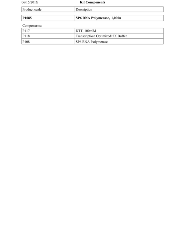 06/15/2016 Kit Components Product code Description P1085 SP6 RNA Polymerase, 1,000u Components: P117 P118 P108 DTT, 100mM Transcription Optimized 5X Buffer SP6 RNA Polymerase 43.0 strona: 1/7 Karta charakterystyki zgodnie z 1907/2006/WE, Artykuł 31 Data druku: 15.06.2016 * Aktualizacja: 02.06.2016 SEKCJA 1: Identyfikacja substancji/mieszaniny i identyfikacja spółki/przedsiębiorstwa 1.1 Identyfikator produktu Nazwa handlowa: DTT, 100mM Numer artykułu: P117 1.2 Istotne zidentyfikowane zastosowania substancji lub mieszaniny oraz zastosowania odradzane Brak dostępnych dalszych istotnych danych Zastosowanie substancji / preparatu Odczynniki laboratoryjne 1.3 Dane dotyczące dostawcy karty charakterystyki Producent/Dostawca: Promega Corporation 2800 Woods Hollow Road Madison, WI 53711 U.S.A. 1-608-274-4330 1-800-356-9526 SDS author: [email protected] Komórka udzielająca informacji: SDS autor: [email protected] 1.4 Numer telefonu alarmowego: Dla chemicznych awaryjne Tankowca, Przecieku, Pożar, narażenia, lub Wypadek wezwania CHEMTREC dnia i nocy w USA i Kanadzie: 1-800-424-9300Outside USA i Kanady: 703-527-3887 1 (zebrać zaproszenia zakwalifikowany). * SEKCJA 2: Identyfikacja zagrożeń 2.1 Klasyfikacja substancji lub mieszaniny Klasyfikacja zgodnie z rozporządzeniem (WE) nr 1272/2008 Produkt nie jest klasyfikowany zgodnie z Globalnie Zharmonizowanym Systemem Klasyfikacji i Oznakowania Chemikaliów (GHS). 2.2 Elementy oznakowania Oznakowanie zgodnie z rozporządzeniem (WE) nr 1272/2008 brak Piktogramy określające rodzaj zagrożenia brak Hasło ostrzegawcze brak Zwroty wskazujące rodzaj zagrożenia brak 2.3 Inne zagrożenia Wyniki oceny właściwości PBT i vPvB PBT: Nie nadający się do zastosowania. vPvB: Nie nadający się do zastosowania. PL (ciąg dalszy na stronie 2) 43.0 strona: 2/7 Karta charakterystyki zgodnie z 1907/2006/WE, Artykuł 31 Data druku: 15.06.2016 Aktualizacja: 02.06.2016 Nazwa handlowa: DTT, 100mM (ciąg dalszy od strony 1) * SEKCJA 3: Skład/informacja o składnikach 3.2 Charakterystyka chemiczna: Mieszaniny Opis: Produkt jest mieszanką z substancji niebezpiecznych wymienionych poniżej wraz z niepublicznego bezpiecznymi substancji. Składniki niebezpieczne: <2,00% 3483-12-3 DL-Dithiothreitol Acute Tox. 4, H302; Skin Irrit. 2, H315; Eye Irrit. 2, H319; STOT SE 3, H335 Wskazówki dodatkowe: Pełna treść przytoczonych wskazówek dotyczących zagrożeń znajduje się w rozdziale 16. * SEKCJA 4: Środki pierwszej pomocy 4.1 Opis środków pierwszej pomocy Wskazówki ogólne: Środki specjalne nie są konieczne. Po wdychaniu: Jeśli pacjent czuje się chory lub jest zaniepokojony, uzyskania porad medycznych. Po styczności ze skórą: Ogólnie produkt nie działa drażniąco na skórę. Po styczności z okiem: Płukać oczy z otwartą powieką przez kilka minut pod bieżącą wodą. Po przełknięciu: Jeśli pacjent czuje się chory lub jest zaniepokojony, uzyskania porad medycznych. 4.2 Najważniejsze ostre i opóźnione objawy oraz skutki narażenia Brak 4.3 Wskazania dotyczące wszelkiej natychmiastowej pomocy lekarskiej i szczególnego postępowania z poszkodowanym Brak dostępnych dalszych istotnych danych * SEKCJA 5: Postępowanie w przypadku pożaru 5.1 Środki gaśnicze Przydatne środki gaśnicze: CO2, proszek gaśniczy lub strumień wody. Większy pożar zwalczać strumieniem wody lub pianą odporną na działanie alkoholu. 5.2 Szczególne zagrożenia związane z substancją lub mieszaniną Nie są znane 5.3 Informacje dla straży pożarnej Brak specjalnych Brak specjalnych Specjalne wyposażenie ochronne: Środki specjalne nie są konieczne. * SEKCJA 6: Postępowanie w przypadku niezamierzonego uwolnienia do środowiska 6.1 Indywidualne środki ostrożności, sprzęt ochronny i procedury w sytuacjach awaryjnych Nie konieczne. 6.2 Środki ostrożności w zakresie ochrony środowiska: Rozcieńczyć dużą ilością wody. Nie dopuścić do przeniknięcia do kanalizacji /wód powierzchniowych /wód gruntowych. 6.3 Metody i materiały zapobiegające rozprzestrzenianiu się skażenia i służące do usuwania skażenia: Zebrać za pomocą materiału wiążącego ciecze (piasek, ziemia okrzemkowa, materiał wiążący kwasy, materiał wiążący uniwersalny, trociny). 6.4 Odniesienia do innych sekcji Nie powstają żadne materiały niebezpieczne. Informacje na temat bezpiecznej obsługi patrz rozdział 7. (ciąg dalszy na stronie 3) PL 43.0 strona: 3/7 Karta charakterystyki zgodnie z 1907/2006/WE, Artykuł 31 Data druku: 15.06.2016 Aktualizacja: 02.06.2016 Nazwa handlowa: DTT, 100mM (ciąg dalszy od strony 2) Informacje na temat utylizacji patrz rozdział 13. * SEKCJA 7: Postępowanie z substancjami i mieszaninami oraz ich magazynowanie 7.1 Środki ostrożności dotyczące bezpiecznego postępowania Środki specjalne nie są konieczne. Wskazówki dla ochrony przeciwpożarowej i przeciwwybuchowej: Produkt jest niepalny. 7.2 Warunki bezpiecznego magazynowania, w tym informacje dotyczące wszelkich wzajemnych niezgodności Składowanie: Wymagania w stosunku do pomieszczeń składowych i zbiorników: Brak szczególnych wymagań. Wskazówki odnośnie wspólnego składowania: Nie konieczne. Dalsze wskazówki odnośnie warunków składowania: Brak. 7.3 Szczególne zastosowanie(-a) końcowe Brak dostępnych dalszych istotnych danych * SEKCJA 8: Kontrola narażenia/środki ochrony indywidualnej Dodatkowe wskazówki dla wykonania urządzeń technicznych: Brak dalszych danych, patrz punkt 7. 8.1 Parametry dotyczące kontroli Składniki wraz z kontrolowanymi wartościami granicznymi zależnymi od miejsca pracy: Produkt nie zawiera znaczących ilości materiałów, których wartości graniczne musiałyby być kontrolowane pod kątem warunków miejsca pracy. Wskazówki dodatkowe: Podstawą były aktualnie obowiązujące wykazy. 8.2 Kontrola narażenia Osobiste wyposażenie ochronne: Ogólne środki ochrony i higieny: Należy przestrzegać zwyczajne środki ostrożnośc
