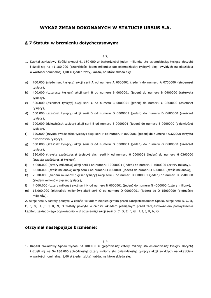 WYKAZ ZMIAN DOKONANYCH W STATUCIE URSUS S.A. § 7 Statutu w brzmieniu dotychczasowym: § 7. 1. Kapitał zakładowy Spółki wynosi 41 180 000 zł (czterdzieści jeden milionów sto osiemdziesiąt tysięcy złotych) i dzieli się na 41 180 000 (czterdzieści jeden milionów sto osiemdziesiąt tysięcy) akcji zwykłych na okaziciela o wartości nominalnej 1,00 zł (jeden złoty) każda, na które składa się: a) 700.000 (siedemset tysięcy) akcji serii A od numeru A 0000001 (jeden) do numeru A 0700000 (siedemset tysięcy), b) 400.000 (czterysta tysięcy) akcji serii B od numeru B 0000001 (jeden) do numeru B 0400000 (czterysta tysięcy), c) 800.000 (osiemset tysięcy) akcji serii C od numeru C 0000001 (jeden) do numeru C 0800000 (osiemset tysięcy), d) 600.000 (sześćset tysięcy) akcji serii D od numeru D 0000001 (jeden) do numeru D 0600000 (sześćset tysięcy), e) 900.000 (dziewięćset tysięcy) akcji serii E od numeru E 0000001 (jeden) do numeru E 0900000 (dziewięćset tysięcy), f) 320.000 (trzysta dwadzieścia tysięcy) akcji serii F od numeru F 0000001 (jeden) do numeru F 0320000 (trzysta dwadzieścia tysięcy), g) 600.000 (sześćset tysięcy) akcji serii G od numeru G 0000001 (jeden) do numeru G 0600000 (sześćset tysięcy), h) 360.000 (trzysta sześćdziesiąt tysięcy) akcji serii H od numeru H 0000001 (jeden) do numeru H 0360000 (trzysta sześćdziesiąt tysięcy), i) 4.000.000 (cztery milionów) akcji serii I od numeru I 0000001 (jeden) do numeru I 4000000 (cztery miliony), j) 6.000.000 (sześć milionów) akcji serii J od numeru J 0000001 (jeden) do numeru J 6000000 (sześć milionów), k) 7.500.000 (siedem milionów pięćset tysięcy) akcji serii K od numeru K 0000001 (jeden) do numeru K 7500000 (siedem milionów pięćset tysięcy), l) 4.000.000 (cztery miliony) akcji serii N od numeru N 0000001 (jeden) do numeru N 4000000 (cztery miliony), m) 15.000.000 (piętnaście milionów) akcji serii O od numeru O 00000001 (jeden) do O 15000000 (piętnaście milionów). 2. Akcje serii A zostały pokryte w całości wkładem niepieniężnym przed zarejestrowaniem Spółki. Akcje serii B, C, D, E, F, G, H, ,I, J, K, N, O zostały pokryte w całości wkładem pieniężnym przed zarejestrowaniem podwyższenia kapitału zakładowego odpowiednio w drodze emisji akcji serii B, C, D, E, F, G, H, I, J, K, N, O. otrzymał następujące brzmienie: § 7. 1. Kapitał zakładowy Spółki wynosi 54 180 000 zł (pięćdziesiąt cztery miliony sto osiemdziesiąt tysięcy złotych) i dzieli się na 54 180 000 (pięćdziesiąt cztery miliony sto osiemdziesiąt tysięcy) akcji zwykłych na okaziciela o wartości nominalnej 1,00 zł (jeden złoty) każda, na które składa się: a) 700.000 (siedemset tysięcy) akcji serii A od numeru A 0000001 (jeden) do numeru A 0700000 (siedemset tysięcy), n) 400.000 (czterysta tysięcy) akcji serii B od numeru B 0000001 (jeden) do numeru B 0400000 (czterysta tysięcy), o) 800.000 (osiemset tysięcy) akcji serii C od numeru C 0000001 (jeden) do numeru C 0800000 (osiemset tysięcy), p) 600.000 (sześćset tysięcy) akcji serii D od numeru D 0000001 (jeden) do numeru D 0600000 (sześćset tysięcy), q) 900.000 (dziewięćset tysięcy) akcji serii E od numeru E 0000001 (jeden) do numeru E 0900000 (dziewięćset tysięcy), r) 320.000 (trzysta dwadzieścia tysięcy) akcji serii F od numeru F 0000001 (jeden) do numeru F 0320000 (trzysta dwadzieścia tysięcy), s) 600.000 (sześćset tysięcy) akcji serii G od numeru G 0000001 (jeden) do numeru G 0600000 (sześćset tysięcy), t) 360.000 (trzysta sześćdziesiąt tysięcy) akcji serii H od numeru H 0000001 (jeden) do numeru H 0360000 (trzysta sześćdziesiąt tysięcy), u) 4.000.000 (cztery milionów) akcji serii I od numeru I 0000001 (jeden) do numeru I 4000000 (cztery miliony), v) 6.000.000 (sześć milionów) akcji serii J od numeru J 0000001 (jeden) do numeru J 6000000 (sześć milionów), w) 7.500.000 (siedem milionów pięćset tysięcy) akcji serii K od numeru K 0000001 (jeden) do numeru K 7500000 x) 4.000.000 (cztery miliony) akcji serii N od numeru N 0000001 (jeden) do numeru N 4000000 (cztery miliony), y) 15.000.000 (piętnaście milionów) akcji serii O od numeru O 00000001 (jeden) do O 15000000 (piętnaście (siedem milionów pięćset tysięcy), milionów), z) 4 100 000 (cztery miliony sto tysięcy) akcji serii P od numeru P 0000001 (jeden) do P 4100000 (cztery miliony sto tysięcy), aa) 8 900 000 (osiem milionów dziewięćset tysięcy) akcji serii Q od numeru Q 0000001 (jeden) do Q 8900000 (osiem milionów dziewięćset tysięcy). 2. Akcje serii A zostały pokryte w całości wkładem niepieniężnym przed zarejestrowaniem Spółki. Akcje serii B, C, D, E, F, G, H, ,I, J, K, N, O, P, Q zostały pokryte w całości wkładem pieniężnym przed zarejestrowaniem podwyższenia kapitału zakładowego odpowiednio w drodze emisji akcji serii B, C, D, E, F, G, H, I, J, K, N, O, P, Q.