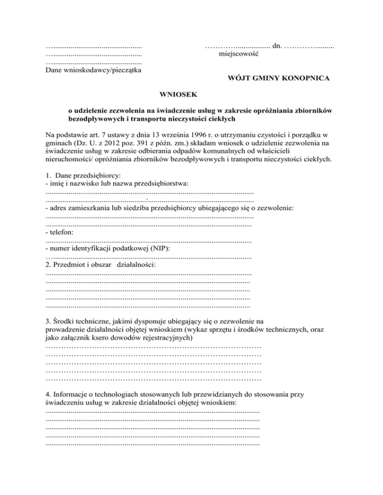 ….............................................. ….............................................. ….............................................. Dane wnioskodawcy/pieczątka ………….................. dn. ………….......... miejscowość WÓJT GMINY KONOPNICA WNIOSEK o udzielenie zezwolenia na świadczenie usług w zakresie opróżniania zbiorników bezodpływowych i transportu nieczystości ciekłych Na podstawie art. 7 ustawy z dnia 13 września 1996 r. o utrzymaniu czystości i porządku w gminach (Dz. U. z 2012 poz. 391 z późn. zm.) składam wniosek o udzielenie zezwolenia na świadczenie usług w zakresie odbierania odpadów komunalnych od właścicieli nieruchomości/ opróżniania zbiorników bezodpływowych i transportu nieczystości ciekłych. 1. Dane przedsiębiorcy: - imię i nazwisko lub nazwa przedsiębiorstwa: ............................................................................................................ ....................................................:....................................................... - adres zamieszkania lub siedziba przedsiębiorcy ubiegającego się o zezwolenie: ............................................................................................................ ........................................................................................................... - telefon: ........................................................................................................... - numer identyfikacji podatkowej (NIP): …....................................................................................................... 2. Przedmiot i obszar działalności: ........................................................................................................... .......................................................................................................... .......................................................................................................... .......................................................................................................... .......................................................................................................... 3. Środki techniczne, jakimi dysponuje ubiegający się o zezwolenie na prowadzenie działalności objętej wnioskiem (wykaz sprzętu i środków technicznych, oraz jako załącznik ksero dowodów rejestracyjnych) ………………………………………………………………………… ………………………………………………………………………… ………………………………………………………………………… ………………………………………………………………………… ………………………………………………………………………… 4. Informacje o technologiach stosowanych lub przewidzianych do stosowania przy świadczeniu usług w zakresie działalności objętej wnioskiem: ............................................................................................................... ............................................................................................................... ............................................................................................................... ............................................................................................................... ............................................................................................................... 5. Proponowane zabiegi z zakresu ochrony środowiska i ochrony sanitarnej planowane po zakończeniu działalności: ............................................................................................................... ............................................................................................................... ............................................................................................................... ............................................................................................................... ............................................................................................................... ............................................................................................................... 6. Termin podjęcia działalności: ….......................................................................................................... 6a. Zamierzony czas prowadzenia działalności: ............................................................................................................. 8. Wypełnia przedsiębiorca ubiegający się o zezwolenie na opróżnianie zbiorników bezodpływowych: - stacja zlewna, która będzie odbierać nieczystości ciekłe (nazwa, adres) …………………………………………………………………………… …………………………………………………………………………… ...................................... podpis Załączniki: l. Aktualne zaświadczenie o braku zaległości w podatkowych lub stwierdzające stan zaległości (druk z Urzędu Skarbowego) 2. Aktualne zaświadczenie o niezaleganiu w opłacaniu składek na ubezpieczenie zdrowotne lub społeczne (z ZUS-u) 3. Dokument potwierdzający gotowość odbioru nieczystości ciekłych przez stację zlewną (umowa) 4. Odpis z rejestru przedsiębiorców (wpis do KRS) 5. Kserokopie dowodów rejestracyjnych pojazdów z potwierdzeniem przeprowadzanych badań technicznych 6. Dokument potwierdzający prawo własności do gruntu, gdzie jest zaplecze techniczne (akt notarialny) 7. Kserokopia nadania NIP 8. Kserokopia nadania nr REGON 9. Potwierdzenie wniesienia opłaty skarbowej w wysokości 107,00 zł (zgodnie z zał. do ustawy o opłacie skarbowej z dnia 16.11.2006 r. Dz. U. Nr 225, poz. 1636 ze zm.— część III, pkt 41 i 42) Wszystkie załączniki należy ponumerować i poświadczyć na zgodnoś