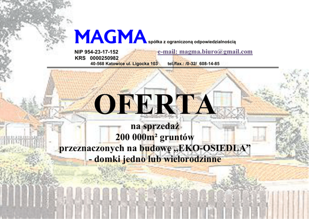 MAGMA NIP 954-23-17-152 KRS 0000250982 spółka z ograniczoną odpowiedzialnością e-mail: [email protected] 40-568 Katowice ul. Ligocka 103 tel./fax.: /0-32/ 608-14-85 OFERTA na sprzedaż 200 000m² gruntów przeznaczonych na budowę „EKO-OSIEDLA” - domki jedno lub wielorodzinne 1 bezpośrednio przy Parku Krajobrazowym „Żabie Doły”, w tym zbiorniki wodne, naturalnie zarybione i z trzech stron otoczone terenami zielonymi w odległości 100m od drogi (ulica Siemianowicka) Bytom- Kraków (przez Siemianowice). I. 1. Miejscowość- Miasto Bytom ulica Siemianowicka 98. 2. Sprzedający – MAGMA Sp. z o.o. 40-568 Katowice „EuroCentrum” ul. Ligocka 103, tel/fax; (0-32) 608–14-85, tel. kom. 0 507-592-030 lub 0 501-325-052. 3. Właściciel Spółki MAGMA – Ing. Stefan Labaš – Ready Company-Koszyce, Słowacja. 2 4. Grunty poza terenem górniczym. II. MAGMA Spółka z o.o. prowadzi uzgodnienia z miastem Bytom, dotyczące budowy Osiedla Mieszkaniowego zwanego „EKO-OSIEDLE”. Istniejące uzbrojenie: 1.Woda- jest zgoda na podłączenie do magistrala Ø 400. 2.Kanalizacja- jest zgoda na przyłącze do ulicy Siemianowickiej. 3.Energia elektryczna- jest zgoda na 4,5 MW. 4. Gaz ziemny- jest zgoda na przyłącze do ulicy Siemianowickiej. 5. Ciepło- jest zgoda na podłączenie do magistrali w granicy naszego terenu. Ilość bez ograniczeń – przewidywane zapotrzebowanie 2,5MW. 3 III. Na powierzchni 50% gruntów zalega około 1 000 000ton piasku dolomitowego, który jest eksploatowany na budowę przebiegającej obok (5km) autostrady A1 - Warszawa – Wiedeń. Grunt będzie do dyspozycji pod budowę „EKO-OSIEDLA” na koniec 2010 roku. IV. Cena Cena- do negocjacji z właścicielem- firma Ready Company Ing. Stefan Labaš – 040 12 Koszyce, ul. Textilna 1, Słowacja. e-mail: [email protected]. 4
