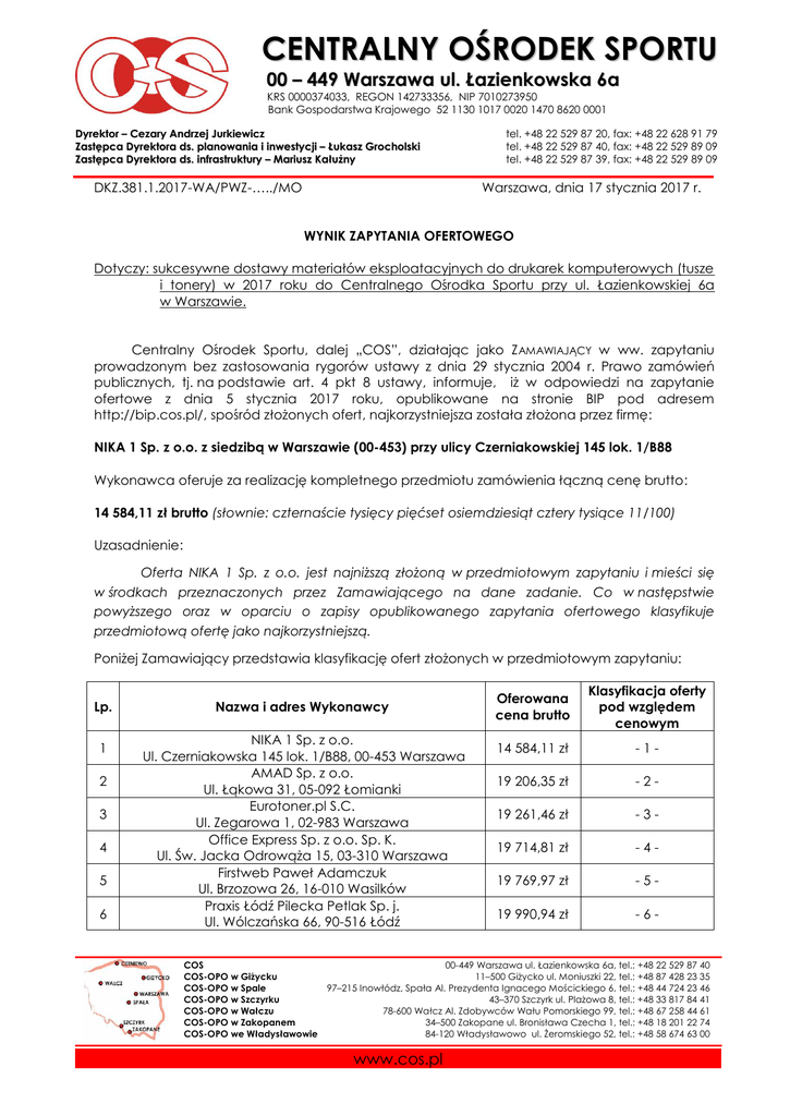 CENTRALNY OŚRODEK SPORTU 00 – 449 Warszawa ul. Łazienkowska 6a KRS 0000374033, REGON 142733356, NIP 7010273950 Bank Gospodarstwa Krajowego 52 1130 1017 0020 1470 8620 0001 Dyrektor – Cezary Andrzej Jurkiewicz Zastępca Dyrektora ds. planowania i inwestycji – Łukasz Grocholski Zastępca Dyrektora ds. infrastruktury – Mariusz Kałużny DKZ.381.1.2017-WA/PWZ-…../MO tel. +48 22 529 87 20, fax: +48 22 628 91 79 tel. +48 22 529 87 40, fax: +48 22 529 89 09 tel. +48 22 529 87 39, fax: +48 22 529 89 09 Warszawa, dnia 17 stycznia 2017 r. WYNIK ZAPYTANIA OFERTOWEGO Dotyczy: sukcesywne dostawy materiałów eksploatacyjnych do drukarek komputerowych (tusze i tonery) w 2017 roku do Centralnego Ośrodka Sportu przy ul. Łazienkowskiej 6a w Warszawie. Centralny Ośrodek Sportu, dalej „COS”, działając jako Z AMAWIAJĄCY w ww. zapytaniu prowadzonym bez zastosowania rygorów ustawy z dnia 29 stycznia 2004 r. Prawo zamówień publicznych, tj. na podstawie art. 4 pkt 8 ustawy, informuje, iż w odpowiedzi na zapytanie ofertowe z dnia 5 stycznia 2017 roku, opublikowane na stronie BIP pod adresem http://bip.cos.pl/, spośród złożonych ofert, najkorzystniejsza została złożona przez firmę: NIKA 1 Sp. z o.o. z siedzibą w Warszawie (00-453) przy ulicy Czerniakowskiej 145 lok. 1/B88 Wykonawca oferuje za realizację kompletnego przedmiotu zamówienia łączną cenę brutto: 14 584,11 zł brutto (słownie: czternaście tysięcy pięćset osiemdziesiąt cztery tysiące 11/100) Uzasadnienie: Oferta NIKA 1 Sp. z o.o. jest najniższą złożoną w przedmiotowym zapytaniu i mieści się w środkach przeznaczonych przez Zamawiającego na dane zadanie. Co w następstwie powyższego oraz w oparciu o zapisy opublikowanego zapytania ofertowego klasyfikuje przedmiotową ofertę jako najkorzystniejszą. Poniżej Zamawiający przedstawia klasyfikację ofert złożonych w przedmiotowym zapytaniu: Lp. 1 2 3 4 5 6 Nazwa i adres Wykonawcy NIKA 1 Sp. z o.o. Ul. Czerniakowska 145 lok. 1/B88, 00-453 Warszawa AMAD Sp. z o.o. Ul. Łąkowa 31, 05-092 Łomianki Eurotoner.pl S.C. Ul. Zegarowa 1, 02-983 Warszawa Office Express Sp. z o.o. Sp. K. Ul. Św. Jacka Odrowąża 15, 03-310 Warszawa Firstweb Paweł Adamczuk Ul. Brzozowa 26, 16-010 Wasilków Praxis Łódź Pilecka Petlak Sp. j. Ul. Wólczańska 66, 90-516 Łódź Oferowana cena brutto Klasyfikacja oferty pod względem cenowym 14 584,11 zł -1- 19 206,35 zł -2- 19 261,46 zł -3- 19 714,81 zł -4- 19 769,97 zł -5- 19 990,94 zł -6- COS 00-449 Warszawa ul. Łazienkowska 6a, tel.: +48 22 529 87 40 COS-OPO w Giżycku 11–500 Giżycko ul. Moniuszki 22, tel.: +48 87 428 23 35 COS-OPO w Spale 97–215 Inowłódz, Spała Al. Prezydenta Ignacego Mościckiego 6, tel.: +48 44 724 23 46 COS-OPO w Szczyrku 43–370 Szczyrk ul. Plażowa 8, tel.: +48 33 817 84 41 COS-OPO w Wałczu 78-600 Wałcz Al. Zdobywców Wału Pomorskiego 99, tel.: +48 67 258 44 61 COS-OPO w Zakopanem 34–500 Zakopane ul. Bronisława Czecha 1, tel.: +48 18 201 22 74 COS-OPO we Władysławowie 84-120 Władysławowo ul. Żeromskiego 52, tel.: +48 58 674 63 00 www.cos.pl 7 8 9 10 11 12 13 Partner XXI Sp. z o.o. Ul. Korczoka 14, 41-806 Zabrze Firma Handlowa „TONEX” Sławomir Gołąbek Ul. Kościelna 7, 47-220 Kędzierzyn-Koźle Gandolf Andrzej Kulesza Ul. Oszmiańska 7, 03-503 Warszawa Sakato S.C. M.Doroż R.Bzduch Ul. Fatimska 41A, 31-831 Kraków Ecoblack S.C. M. Szewczyk Ł. Baran Ul. Domaniówka 1E, 25-413 Kielce Firma Handlowa KOMAX 9 Sp. z o.o. Ul. Przemysłowa 2, 10-418 Olsztyn Pryzmat Warszawa Sp. z o.o. Ul. Marszałkowska 9/15, 00-626 Warszawa 20 009,20 zł -7- 20 210,13 zł -8- 20 550,84 zł -9- 21 901,38 zł - 10 - 22 477,02 zł - 11 - 23 415,03 zł - 12 - 24 809,12 zł - 13 - KIEROWNIK ZAMAWIAJĄCEGO 2
