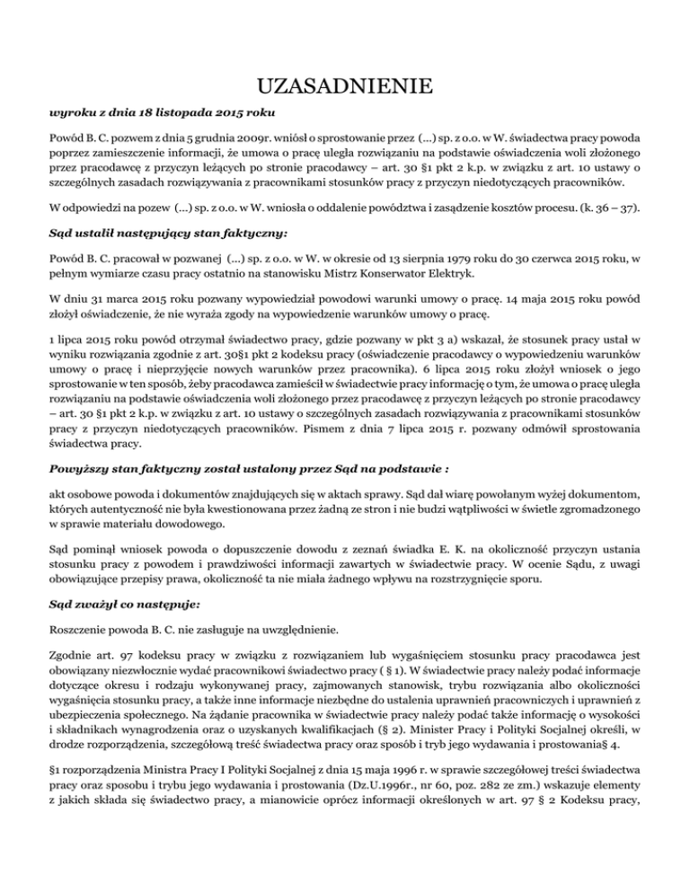 UZASADNIENIE wyroku z dnia 18 listopada 2015 roku Powód B. C. pozwem z dnia 5 grudnia 2009r. wniósł o sprostowanie przez (...) sp. z o.o. w W. świadectwa pracy powoda poprzez zamieszczenie informacji, że umowa o pracę uległa rozwiązaniu na podstawie oświadczenia woli złożonego przez pracodawcę z przyczyn leżących po stronie pracodawcy – art. 30 §1 pkt 2 k.p. w związku z art. 10 ustawy o szczególnych zasadach rozwiązywania z pracownikami stosunków pracy z przyczyn niedotyczących pracowników. W odpowiedzi na pozew (...) sp. z o.o. w W. wniosła o oddalenie powództwa i zasądzenie kosztów procesu. (k. 36 – 37). Sąd ustalił następujący stan faktyczny: Powód B. C. pracował w pozwanej (...) sp. z o.o. w W. w okresie od 13 sierpnia 1979 roku do 30 czerwca 2015 roku, w pełnym wymiarze czasu pracy ostatnio na stanowisku Mistrz Konserwator Elektryk. W dniu 31 marca 2015 roku pozwany wypowiedział powodowi warunki umowy o pracę. 14 maja 2015 roku powód złożył oświadczenie, że nie wyraża zgody na wypowiedzenie warunków umowy o pracę. 1 lipca 2015 roku powód otrzymał świadectwo pracy, gdzie pozwany w pkt 3 a) wskazał, że stosunek pracy ustał w wyniku rozwiązania zgodnie z art. 30§1 pkt 2 kodeksu pracy (oświadczenie pracodawcy o wypowiedzeniu warunków umowy o pracę i nieprzyjęcie nowych warunków przez pracownika). 6 lipca 2015 roku złożył wniosek o jego sprostowanie w ten sposób, żeby pracodawca zamieścił w świadectwie pracy informację o tym, że umowa o pracę uległa rozwiązaniu na podstawie oświadczenia woli złożonego przez pracodawcę z przyczyn leżących po stronie pracodawcy – art. 30 §1 pkt 2 k.p. w związku z art. 10 ustawy o szczególnych zasadach rozwiązywania z pracownikami stosunków pracy z przyczyn niedotyczących pracowników. Pismem z dnia 7 lipca 2015 r. pozwany odmówił sprostowania świadectwa pracy. Powyższy stan faktyczny został ustalony przez Sąd na podstawie : akt osobowe powoda i dokumentów znajdujących się w aktach sprawy. Sąd dał wiarę powołanym wyżej dokumentom, których autentyczność nie była kwestionowana przez żadną ze stron i nie budzi wątpliwości w świetle zgromadzonego w sprawie materiału dowodowego. Sąd pominął wniosek powoda o dopuszczenie dowodu z zeznań świadka E. K. na okoliczność przyczyn ustania stosunku pracy z powodem i prawdziwości informacji zawartych w świadectwie pracy. W ocenie Sądu, z uwagi obowiązujące przepisy prawa, okoliczność ta nie miała żadnego wpływu na rozstrzygnięcie sporu. Sąd zważył co następuje: Roszczenie powoda B. C. nie zasługuje na uwzględnienie. Zgodnie art. 97 kodeksu pracy w związku z rozwiązaniem lub wygaśnięciem stosunku pracy pracodawca jest obowiązany niezwłocznie wydać pracownikowi świadectwo pracy ( § 1). W świadectwie pracy należy podać informacje dotyczące okresu i rodzaju wykonywanej pracy, zajmowanych stanowisk, trybu rozwiązania albo okoliczności wygaśnięcia stosunku pracy, a także inne informacje niezbędne do ustalenia uprawnień pracowniczych i uprawnień z ubezpieczenia społecznego. Na żądanie pracownika w świadectwie pracy należy podać także informację o wysokości i składnikach wynagrodzenia oraz o uzyskanych kwalifikacjach (§ 2). Minister Pracy i Polityki Socjalnej określi, w drodze rozporządzenia, szczegółową treść świadectwa pracy oraz sposób i tryb jego wydawania i prostowania§ 4. §1 rozporządzenia Ministra Pracy I Polityki Socjalnej z dnia 15 maja 1996 r. w sprawie szczegółowej treści świadectwa pracy oraz sposobu i trybu jego wydawania i prostowania (Dz.U.1996r., nr 60, poz. 282 ze zm.) wskazuje elementy z jakich składa się świadectwo pracy, a mianowicie oprócz informacji określonych w art. 97 § 2 Kodeksu pracy, zamieszcza się informacje niezbędne do ustalenia uprawnień ze stosunku pracy i uprawnień z ubezpieczenia społecznego, dotyczące: 1)wymiaru czasu pracy pracownika w czasie trwania stosunku pracy, 1a) podstawy prawnej rozwiązania lub wygaśnięcia stosunku pracy, 2) urlopu wypoczynkowego wykorzystanego przez pracownika w roku kalendarzowym, w którym ustał stosunek pracy, 3)wykorzystania dodatkowego urlopu albo innego uprawnienia lub świadczenia, przewidzianego przepisami prawa pracy, 4)należności ze stosunku pracy uznanych i nie zaspokojonych przez pracodawcę do dnia ustania tego stosunku, z powodu braku środków finansowych, 5)okresu korzystania z urlopu bezpłatnego i podstawy prawnej jego udzielenia, 6)wykorzystanego urlopu wychowawczego, 7)liczby dni, za które pracownik otrzymał wynagrodzenie, zgodnie z art. 92 Kodeksu pracy, w roku kalendarzowym, w którym ustał stosunek pracy, 8)wykorzystania w roku kalendarzowym, w którym ustał stosunek pracy, zwolnienia od pracy przewidzianego w art. 188 Kodeksu pracy, 9) okresu, za który pracownikowi przysługuje odszkodowanie w związku ze skróceniem okresu wypowiedzenia umowy o pracę na podstawie art. 361 § 1 Kodeksu pracy, 10)okresu odbytej czynnej służby wojskowej lub jej form zastępczych, 11)okresu wykonywania pracy w szczególnych warunkach lub w szczególnym charakterze, 12)okresów nieskładkowych, przypadających w okresie zatrudnienia, którego dotyczy świadectwo pracy, uwzględnianych przy ustalaniu prawa do emerytury lub renty, 13)danych, które są zamieszczane na żądanie pracownika. W niniejszej sprawie pozwany w pkt 3 a) świadectwa pracy wskazał, że stosunek pracy ustał w wyniku rozwiązania zgodnie z art. 30 §1 pkt 2 kodeksu pracy (oświadczenie pracodawcy o wypowiedzeniu warunków umowy o pracę i nieprzyjęcie nowych warunków przez pracownika). Tym samym podał podstawę prawną rozwiązania stosunku pracy (art. art. 30 §1 pkt 2 kodeksu pracy) i tryb rozwiązania umowy o pracę (oświadczenie pracodawcy o wypowiedzeniu warunków umowy o pracę i nieprzyjęcie nowych warunków przez pracownika). Jak wynika z powyższego, żądanie powoda, nie ma