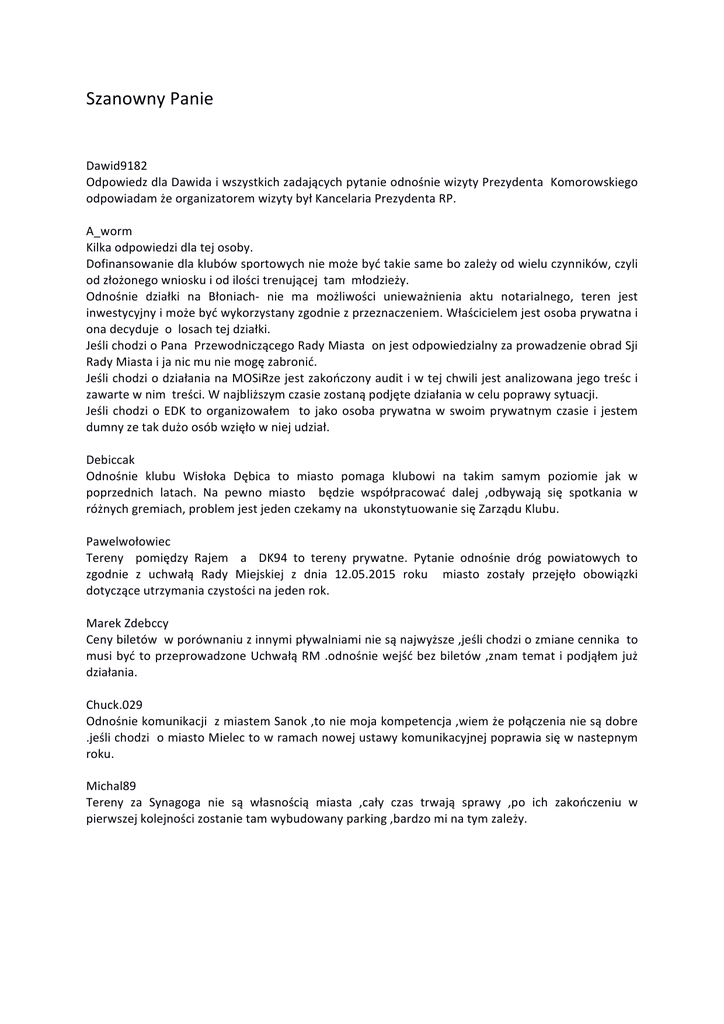 Szanowny Panie Dawid9182 Odpowiedz dla Dawida i wszystkich zadających pytanie odnośnie wizyty Prezydenta Komorowskiego odpowiadam że organizatorem wizyty był Kancelaria Prezydenta RP. A_worm Kilka odpowiedzi dla tej osoby. Dofinansowanie dla klubów sportowych nie może być takie same bo zależy od wielu czynników, czyli od złożonego wniosku i od ilości trenującej tam młodzieży. Odnośnie działki na Błoniach-‐ nie ma możliwości unieważnienia aktu notarialnego, teren jest inwestycyjny i może być wykorzystany zgodnie z przeznaczeniem. Właścicielem jest osoba prywatna i ona decyduje o losach tej działki. Jeśli chodzi o Pana Przewodniczącego Rady Miasta on jest odpowiedzialny za prowadzenie obrad Sji Rady Miasta i ja nic mu nie mogę zabronić. Jeśli chodzi o działania na MOSiRze jest zakończony audit i w tej chwili jest analizowana jego treśc i zawarte w nim treści. W najbliższym czasie zostaną podjęte działania w celu poprawy sytuacji. Jeśli chodzi o EDK to organizowałem to jako osoba prywatna w swoim prywatnym czasie i jestem dumny ze tak dużo osób wzięło w niej udział. Debiccak Odnośnie klubu Wisłoka Dębica to miasto pomaga klubowi na takim samym poziomie jak w poprzednich latach. Na pewno miasto będzie współpracować dalej ,odbywają się spotkania w różnych gremiach, problem jest jeden czekamy na ukonstytuowanie się Zarządu Klubu. Pawelwołowiec Tereny pomiędzy Rajem a DK94 to tereny prywatne. Pytanie odnośnie dróg powiatowych to zgodnie z uchwałą Rady Miejskiej z dnia 12.05.2015 roku miasto zostały przejęło obowiązki dotyczące utrzymania czystości na jeden rok. Marek Zdebccy Ceny biletów w porównaniu z innymi pływalniami nie są najwyższe ,jeśli chodzi o zmiane cennika to musi być to przeprowadzone Uchwałą RM .odnośnie wejść bez biletów ,znam temat i podjąłem już działania. Chuck.029 Odnośnie komunikacji z miastem Sanok ,to nie moja kompetencja ,wiem że połączenia nie są dobre .jeśli chodzi o miasto Mielec to w ramach nowej ustawy komunikacyjnej poprawia się w nastepnym roku. Michal89 Tereny za Synagoga nie są własnością miasta ,cały czas trwają sprawy ,po ich zakończeniu w pierwszej kolejności zostanie tam wybudowany parking ,bardzo mi na tym zależy.