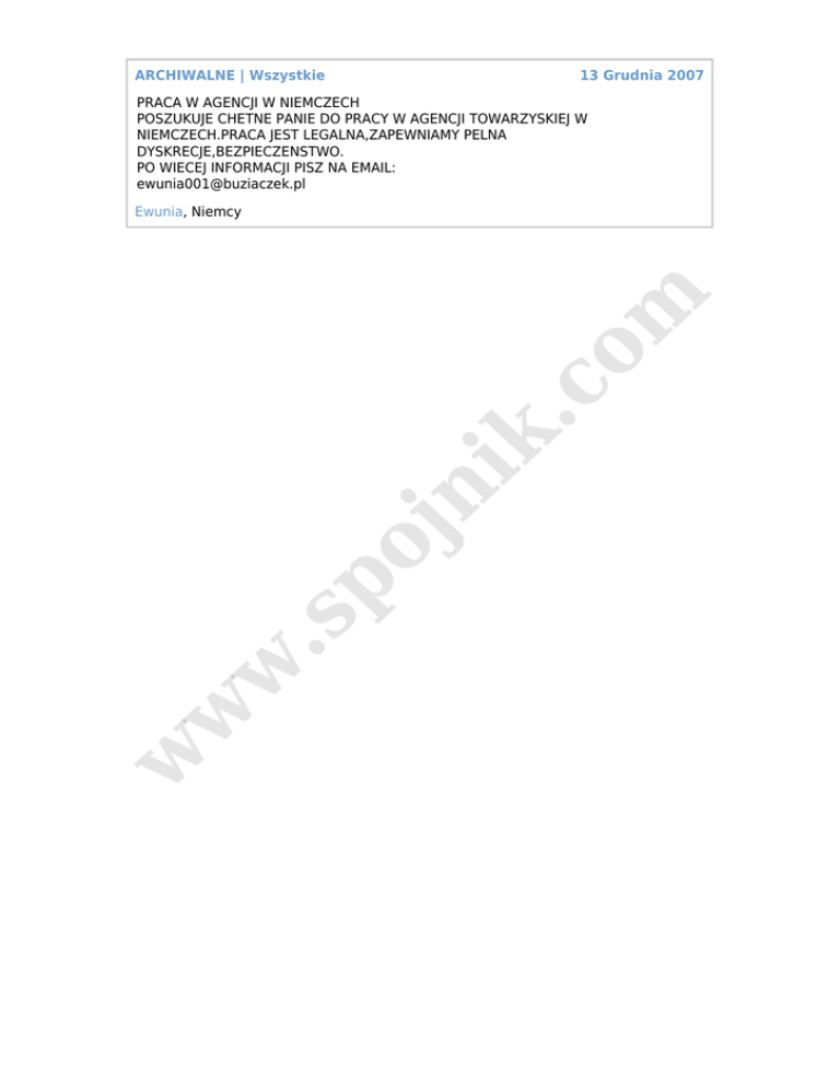 ARCHIWALNE | Wszystkie 13 Grudnia 2007 PRACA W AGENCJI W NIEMCZECH POSZUKUJE CHETNE PANIE DO PRACY W AGENCJI TOWARZYSKIEJ W NIEMCZECH.PRACA JEST LEGALNA,ZAPEWNIAMY PELNA DYSKRECJE,BEZPIECZENSTWO. PO WIECEJ INFORMACJI PISZ NA EMAIL: [email protected] w w w .s po jn ik .c o m Ewunia, Niemcy