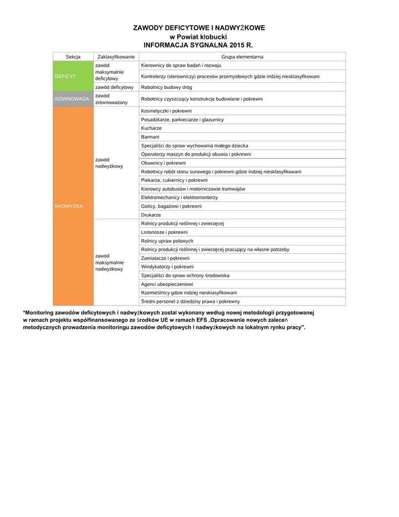 ZAWODY DEFICYTOWE I NADWYŻKOWE w Powiat kłobucki INFORMACJA SYGNALNA 2015 R. Sekcja DEFICYT RÓWNOWAGA Zaklasyfikowanie Grupa elementarna zawód maksymalnie deficytowy Kierownicy do spraw badań i rozwoju zawód deficytowy Robotnicy budowy dróg zawód zrównoważony Robotnicy czyszczący konstrukcje budowlane i pokrewni Kontrolerzy (sterowniczy) procesów przemysłowych gdzie indziej niesklasyfikowani Kosmetyczki i pokrewni Posadzkarze, parkieciarze i glazurnicy Kucharze Barmani Specjaliści do spraw wychowania małego dziecka zawód nadwyżkowy Operatorzy maszyn do produkcji obuwia i pokrewni Obuwnicy i pokrewni Robotnicy robót stanu surowego i pokrewni gdzie indziej niesklasyfikowani Piekarze, cukiernicy i pokrewni Kierowcy autobusów i motorniczowie tramwajów Elektromechanicy i elektromonterzy NADWYŻKA Gońcy, bagażowi i pokrewni Drukarze Rolnicy produkcji roślinnej i zwierzęcej Listonosze i pokrewni Rolnicy upraw polowych zawód maksymalnie nadwyżkowy Rolnicy produkcji roślinnej i zwierzęcej pracujący na własne potrzeby Zamiatacze i pokrewni Windykatorzy i pokrewni Specjaliści do spraw ochrony środowiska Agenci ubezpieczeniowi Rzemieślnicy gdzie indziej niesklasyfikowani Średni personel z dziedziny prawa i pokrewny *Monitoring zawodów deficytowych i nadwyżkowych został wykonany według nowej metodologii przygotowanej w ramach projektu współfinansowanego ze środków UE w ramach EFS „Opracowanie nowych zaleceń metodycznych prowadzenia monitoringu zawodów deficytowych i nadwyżkowych na lokalnym rynku pracy".
