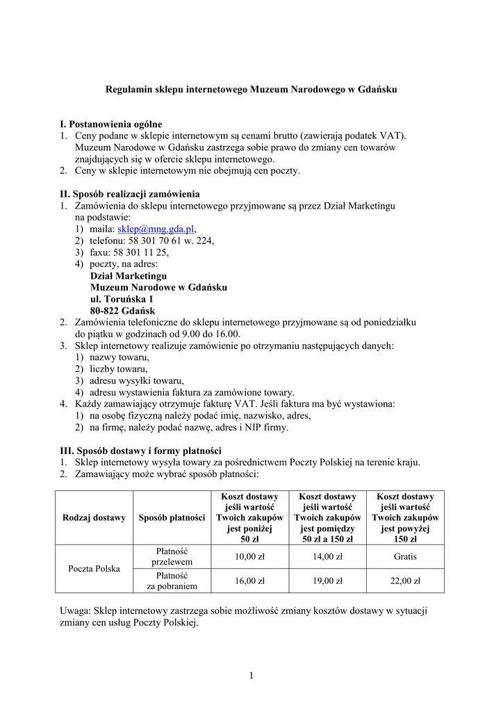 Regulamin sklepu - Muzeum Narodowe w Gdańsku