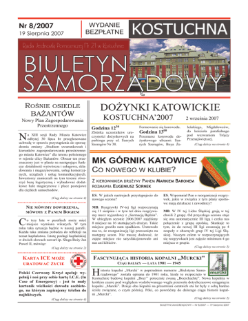 Nr 8/2007 19 Sierpnia 2007 WYDANIE BEZPŁATNE Rada Jednostki Pomocniczej Nr 21 w Kostuchnie ROŚNIE OSIEDLE BAśANTÓW Nowy Plan Zagospodarowania Przestrzennego N a XIII sesji Rady Miasta Katowice odbytej 30 lipca br przegłosowano uchwałę w sprawie przystąpienia do sporządzenia zmiany „Studium uwarunkowań i kierunków zagospodarowania przestrzennego miasta Katowice” dla terenu połoŜonego w rejonie ulicy BaŜantów. Obszar ten przeznaczony jest w planie na następujące funkcje: działalność wytwórcza i usługowa, składowania i magazynowania, usług komercyjnych, urządzeń i usług komunikacyjnych. Inwestorzy zamierzali na tym terenie stworzyć bazę logistyczną i wybudować dodatkowe hale magazynowe i place postojowe dla cięŜkich samochodów. (Ciąg dalszy na stronie 4) NIE MÓWIMY DOWIDZENIA, MÓWIMY Z PANEM BOGIEM C o trzy lata w parafiach moŜe mieć miejsce wymiana wikarych. W tym roku taka sytuacja będzie w naszej parafii. KaŜda taka zmiana pobudza do refleksji na temat kapłaństwa. Istotę posługi kapłańskiej w dwóch słowach zawarł śp. Sługa BoŜy Jan Paweł II, mówiąc: DOśYNKI KATOWICKIE KOSTUCHNA’2007 Godzina 1230 Formowanie się korowodu. Zbiórka uczestników uroczystości doŜynkowych na parkingu przy ul. Szarych Szeregów Nr 38. Przemarsz korowodu doŜynkowego ulicami: Szarych Szeregów, Boya śe- Godzina 1300 2 września 2007 leńskiego, Migdałowców, do kościoła parafialnego pod wezwaniem Trójcy Przenajświętszej. (Ciąg dalszy na stronie 4) MK GÓRNIK KATOWICE CO NOWEGO W KLUBIE? Z KIEROWNIKIEM DRUśYNY PANEM ROZMAWIA EUGENIUSZ SORNEK MARKIEM BARONEM ES. W jakich nastrojach przystępujecie do nowego sezonu? MB. Rozgrywki IV-tej ligi rozpoczynają się 11 sierpnia i w tym teŜ dniu rozgrywamy mecz wyjazdowy z „Sarmacją Będzin”. W ubiegłym sezonie 2006/2007 zajęliśmy 8 miejsce na 16 startujących druŜyn. Takie miejsce groziło nam spadkiem. Uratowało nas to, Ŝe reorganizację ligi przesunięto na następny sezon. Nie muszę dodawać, Ŝe zajęte miejsce nie satysfakcjonowało ani nas ani kibiców. ES. Wspomniał Pan o reorganizacji rozgrywek, jakie w związku z tym plany sportowe mają działacze i zawodnicy? MB. W IV tej Lidze Śląskiej grają w tej chwili 2 grupy. Od przyszłego sezonu staje się ona automatycznie III ligą i czeka nas połączenie z grupą opolską. Skutkuje to tym, Ŝe do nowej III ligi awansują po 4 zespoły z obecnych grup IV tej Ligi Śląskiej. Naszym celem w rozpoczynających się rozgrywkach jest zajęcie minimum 4 go miejsca w grupie. (Ciąg dalszy na stronie 3) (Ciąg dalszy na stronie 2) KARTA ICE MOśE FASCYNUJĄCA HISTORIA KOPALNI ,,MURCKI" URATOWAĆ śYCIE CIĄG DALSZY — LATA 1901 — 1945 Polski Czerwony KrzyŜ apeluj: wypełnij i noś przy sobie kartę I.C.E. (In Case of Emergency) - jest to mały kartonik wielkości dowodu osobistego, na którym zapisujemy telefon do najbliŜszych. (Ciąg dalszy na stronie 4) H istoria kopalni ,,Murcki’ w poprzednim numerze „Biuletynu Samorządowego” została opisana do 1901 roku, kiedy to rozpoczęto w Kostuchnie budowę kopalni ,,Boer’’ potocznie zwaną ,,Boerchachte”. Nowa kopalnia w krótkim czasie pod względem wydobywanego węgla przerosła dotychczasowe osiągnięcia kopalni ,,Murcki”. Dzieje obu kopalni na przestrzeni ostatnich stu lat były z sobą bardzo ściśle związane, o czym później. Póki, co powróćmy do dalszego ciągu historii kopalni ,,Murcki”. (Ciąg dalszy na stronie 2) BIULETYN SAMORZĄDOWY— Nr 8/2007 — 19 Sierpnia 2007 Strona 2 NIE MÓWIMY DOWIDZENIA, MÓWIMY Z PANEM BOGIEM (Ciąg dalszy ze strony 1) „ Kapłaństwo jest darem i tajemnicą”. Kapłan jest darem Pana Boga, ofiarowany człowiekowi na czas ziemskiego pielgrzymowania do niebieskiej ojczyzny. Czego my osoby świeckie oczekujemy od naszych kapłanów? W czasach, gdy wielu ludzi mówi: Pan Bóg tak, Kościół nie, oczekujemy od kapłanów jasnego, czytelnego i autentycznego przykładu, który by pokazywał jak słuŜyć Panu Bogu i drugiemu człowiekowi. Jakich przykładów dostarczali nam nasi wikarzy? Ksiądz Bogdan jest w naszej parafii od dziewięciu lat. Przez wiele lat opiekował się z ministrantami z całej archidiecezji górnośląskiej. Ilość i jakość posługi liturgicznej ministrantów w naszej FASCYNUJĄCA HISTORIA KOPALNI „MURCKI” (Ciąg dalszy ze strony 1) W 1902 roku rozpoczyna się gruntowna przebudowa i modernizacja kopalni. W miejsce dotychczasowych kilkunastu małych szybików, wybudowano nowoczesny, duŜy szyb wydobywczy ,,Maria I”, a w 1908 roku szyb ,,Maria II”. Otwarto nowe poziomy wydobywcze na głębokości 64 i 114 metrów. Zainstalowano maszynę parową na potrzeby odwodnienia pokładów. Zbudowano nową sortownię, która miała lepiej zabezpieczyć róŜnorakie potrzeby odbiorców węgla. Powstają nowe wydziały bezpośrednio związane z ruchem kopalni takie jak kotłownia i kuźnia, oraz powiększono bocznicę kolejową. Uruchamiane są zakłady ŁuŜnej związane z działalnością kopalnią takie jak cegielnia, betoniarnia, stolarnia i ogrodnictwo. W miejscu zlikwidowanych małych szybików wydobywczych urządzono park rekreacyjny, gdzie posadzono kasztany i buki, a z parku pałacowego w Pszczynie przesadzono wiele rzadkich drzew między innymi czarne brzozy, klony amerykańskie czy sosny kanadyjskie. Dziś na tym terenie utworzono rezerwat przyrody botanicznej. W 1907 roku powstaje w Murckach orkiestra górnicza, której załoŜycielem był pracownik kopalni Pan Henryk Filak. Orkiestra ta przez 100 lat przechodziła róŜne koleje rzeczy, lecz nigdy nie przestała istnieć, a jej obecnym dyrygentem od 1986 roku jest Pan Szczepan Kurzeja, który kultywuje i twórczo rozwija jej piękne tradycje. Ten okres dynamicznego rozwoju kopalni ,,Murcki” przypada, gdy władcą w parafii budzi podziw. Wiele lat ksiądz Bogdan szefował festiwalowi ,,Dziecięcej Piosenki Religijnej”, który wyszedł dalek