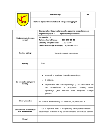 Karta Usługi Nr Referat Spraw Obywatelskich i Organizacyjnych Stanowisko: Nazwa stanowiska zgodnie z regulaminem organizacyjnym – Miejsce świadczenia usługi Sprawy Obywatelskie Nr pokoju: 3 Telefon kontaktowy: 068 375 50 38 Godziny urzędowania: 7.00-15.00 Osoba wykonująca usługę: Rodzaj usługi Opłaty Do wniosku załączyć należy Agnieszka Rusin Wydanie dowodu osobistego brak wniosek o wydanie dowodu osobistego, 2 zdjęcia. odpowiedni akt stanu cywilnego tj. akt urodzenia lub akt małżeństwa w przypadku zmiany stanu cywilnego (jeśli zawarte poza miejscem stałego pobytu). Wzór wniosku Dodatkowe informacje dla interesanta Uwagi Na stronie internetowej UG Trzebiel, w pokoju nr 2 Od 1 stycznia 2010 r. nie płacimy za wydanie dowodu osobistego. Wnioski w tej sprawie można składać za darmo.