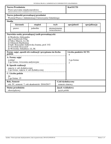 WYDZIAŁ PRAWA I ADMINISTACJI UNIWERSYTETU GDAŃSKIEGO Nazwa Przedmiotu Prawo Prawo prywatne prywatne międzynarodowe; międzynarodowe; Kod ECTS OBSZAR KSZTAŁCENIA W ZAKRESIE NAUK SPOŁECZNYCH Nazwa jednostki prowadzącej przedmiot Wydział Prawa i Administracji Uniwersytetu Gdańskiego Studia kierunek prawo prawo stopień jednolite jednolite tryb niestacjonarne (wieczorowe) niestacjonarne (wieczorowe) Nazwisko osoby prowadzącej (osób prowadzących) dr Brodecka Aleksandra mgr Czuchwicki Filip dr Glicz Marcin, LL.M. dr Gliniecki Bartłomiej dr hab. Kruczalak-Jankowska Joanna, prof. UG dr Trzciński Krzysztof dr Wowerka Arkadiusz, LL.M. Formy godzin Formy zajęć, zajęć, sposób sposób ich ich realizacji realizacji ii przypisana przypisana im im liczba liczba godzin A. Formy zajęć wykład 2-ga forma: ćwiczenia audytoryjne wykład 2-ga forma: ćwiczenia audytoryjne B. Sposób realizacji zajęcia w dydaktycznej 2-ga forma: w sali dydaktycznej zajęcia w sali salizajęcia dydaktycznej 2-ga forma: zajęcia w sali dydaktycznej specjalność specjalizacja Liczba punktów ECTS 4 2-ga forma: 2 C. Liczba godzin 30 2-ga forma: 15 30 2-ga forma: 15 Rok, Semestr rok: IV, semestr: 7, rok akademicki: 2016/2017 Cykl dydaktyczny semestr zimowy Status przedmiotu obowiązkowy Język wykładowy język polski Sylabus - Prawo prywatne międzynarodowe, data wygenerowania: 2014.03.20 08:09:16 Strona 1 z 4 WYDZIAŁ PRAWA I ADMINISTACJI UNIWERSYTETU GDAŃSKIEGO Metody dydaktyczne wykład, wykład konwersatoryjny, wykład problemowy, wykład z prezentacją multimedialną 2-ga forma: ćwiczenia audytoryjne: analiza tekstów z dyskusją, ćwiczenia audytoryjne: analiza zdarzeń krytycznych (przypadków), ćwiczenia audytoryjne: dyskusja, ćwiczenia audytoryjne: praca w grupach Forma i sposób zaliczenia oraz podstawowe kryteria oceny lub wymagania egzaminacyjne A. Sposób zaliczenia egzamin 2-ga forma: zaliczenie z oceną B. Formy zaliczenia egzamin pisemny testowy z pytaniami (zadaniami) otwartymi), egzamin pisemny: dłuzsza wypowiedź pisemna (rozwiazanie problemu), egzamin ustny, ustalenie oceny zaliczeniowej na podstawie ocen cząstkowych otrzymywanych w trakcie trwania semestru, zaliczenie kolokwium, zaliczenie ustne C. Podstawowe kryteria Warunki zdania egzaminu oraz uzyskania zaliczenia ćwiczeń odpowiadają procentowi opanowanej wiedzy oraz umiejętnościom z uwzględnieniem systemu oceniania wynikającego z par. 4 ust. 1 Regulaminu Studiów UG (Uchwała Senatu nr 4/07 z 22 lutego 2007 roku z późn. zm., tekst jednolity: a) ocena bdb - powyżej 90% wymaganej wiedzy i umiejętności, b) ocena db+ - powyżej 80% wymaganej wiedzy i umiejętności, c) ocena db - powyżej 70% wymaganej wiedzy i umiejętności, d) ocena dst+ - powyżej 60% wymaganej wiedzy i umiejętności, e) ocena dst - powyżej 50% wymaganej wiedzy i umiejętności. Określenie przedmiotów wprowadzających wraz z wymogami wstępnymi A. Wymagania formalne Zdany egzamin z prawa cywilnego i prawa handlowego. B. Wymagania wstępne Student powinien posiadać wiedzę teoretyczną z zakresu prawa cywilnego i handlowego, w szczególności jego działów - części ogólnej i zobowiązań, a także prawa spółek oraz papierów wartościowych i umów handlowych oraz posiadać umiejętność wykorzystania wiedzy zdobytej na przedmiocie wprowadzającym w praktyce (umiejętność rozwiązywania konkretnych stanów faktycznych). Cele przedmiotu Zapoznanie studentów z zagadnieniami prawa prywatnego międzynarodowego, ze szczególnym uwzględnieniem określania prawa właściwego i ustalania zakresu zastosowania tego prawa. Sylabus - Prawo prywatne międzynarodowe, data wygenerowania: 2014.03.20 08:09:16 Strona 2 z 4 WYDZIAŁ PRAWA I ADMINISTACJI UNIWERSYTETU GDAŃSKIEGO Treści programowe Część ogólna. A. Zagadnienia wprowadzające I. Pojęcie oraz funkcje zadania prawa prywatnego międzynarodowego 1. Prawo prywatne międzynarodowe w ujęciu wąskim 2. Prawo prywatne międzynarodowe w ujęciu szerokim 3. Prawo prywatne międzynarodowe a prawo międzynarodowe publiczne II. Geneza i rozwój prawa prywatnego międzynarodowego III. Źródła obowiązującego prawa międzynarodowego prywatnego 1. Źródła krajowe 2. Źródła unijne 3. Źródła konwencyjne (umowy międzynarodowe) 4. Prawo zwyczajowe 5. Wzajemny stosunek źródeł prawa prywatnego międzynarodowego IV. Charakterystyka ustawy ppm z 2011 r. B. Normy kolizyjne prawa prywatnego międzynarodowego w ujęciu wąskim 1. Budowa i rodzaje norm kolizyjnych 1.1. Budowa norm kolizyjnych 1.1.1. Hipoteza zakres 1.1.2. Dyspozycja a) nakaz stosowania prawa, b) łącznik: - określnik nominalny, - subokreślnik temporalny 1.2. Rodzaje norm kolizyjnych Normy zupełne Normy jednostronne, Niezupełne normy dwustronne, Normy kolizyjne pierwszego stopnia, Normy kolizyjne drugiego stopnia (meta normy) 2. Łącznik normy kolizyjnej 2.1. Rodzaje łączników: Obiektywne Subiektywne Personalne Przedmiotowe Ustanawiające właściwości kilku praw Ustanawiające właściwość jednego prawa 2.2. Łącznik obywatelstwa Pojęcie obywatelstwa Wady i zalety łącznika obywatelstwa Prawo właściwe w przypadku podwójnego lub wielorakiego obywatelstwa lub braku lub niemożliwości ustalenia obywatelstwa 2.3. Łącznik miejsca zamieszkania Pojęcie miejsca zamieszkania Prawo właściwe w przypadku wielorakiego miejsca zamieszkania Ustalenie miejsca zamieszkania jako kryterium jurysdykcji w rozumieniu rozporządzenia nr 44/2001 2.4. Łącznik pobytu Pobyt zwykły Pobyt prosty 2.5. Inne łączniki 2.6. Rodzaje łączników na gruncie ustawy ppm z 2011 r. 3. Wykładnia przepisów prawa prywatnego międzynarodowego 4. Zagadnienie kwalifikacji Pojęcie kwalifikacji Metody kwalifikacyjne C. Oznaczenie i stosowanie prawa właściwego I. Kwestia wstępna i II. Ustalenie prawa właściwego dla kwestii wstępnej 1. Kwestia cząstkowa 2 .Kwestia pierwotna D. Odesłanie I. Odesłanie zwrotne i dalsze II. Odesłanie pełne II
