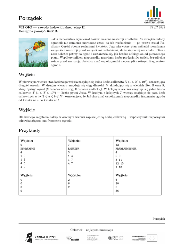 Porządek VII OIG — zawody indywidualne, etap II. Dostępna pamięć: 64 MB. 23 III 2013 Jakiś nienawistnik wymieszał Jasiowi nasiona nasturcji i rudbekii. Na szczęście młody ogrodnik nie zamierza marnować czasu na ich rozdzielanie — po prostu zasiał Podłużny Ogród oboma rodzajami kwiatów. Jego pierwotny plan zakładał posadzenie wszystkich nasturcji przed wszystkimi rudbekiami, ale to się raczej nie udało. . . Teraz nasz bohater patrzy na ogród i zastanawia się, jak bardzo odbiega on od pierwotnego planu. Współczynnikiem nieporządku nazwiemy liczbę par kwiatów takich, że rudbekia rośnie przed nasturcją. Jaś chce znać współczynniki nieporządku różnych fragmentów ogrodu. Wejście W pierwszym wierszu standardowego wejścia znajduje się jedna liczba całkowita N (1 6 N 6 106 ), oznaczająca długość ogrodu. W drugim wierszu znajduje się ciąg długości N składający się z wielkich liter N oraz R, który opisuje ogród (N oznacza nasturcję, R oznacza rudbekię). W kolejnym wierszu znajduje się jedna liczba całkowita T (1 6 T 6 105 ) — liczba pytań Jasia. W każdym z kolejnych T wierszy znajduje się para liczb całkowitych a i b (1 6 a 6 b 6 N ), oznaczająca, że Jaś chce znać współczynnik nieporządku fragmentu ogrodu od kwiatu nr a do kwiatu nr b. Wyjście Dla każdego zapytania należy w osobnym wierszu zapisać jedną liczbę całkowitą – współczynnik nieporządku odpowiadającego mu fragmentu ogrodu. Przykłady Wejście: 9 NNNRRRNNN 4 1 3 1 6 4 6 4 9 Wejście: 7 RNNRNNR 3 1 4 1 7 4 7 Wejście: 13 RRRRRRNNNNNNR 4 5 9 3 11 12 13 1 13 Wyjście: 0 0 0 9 Wyjście: 2 6 2 Wyjście: 6 20 0 36 Porządek Człowiek – najlepsza inwestycja