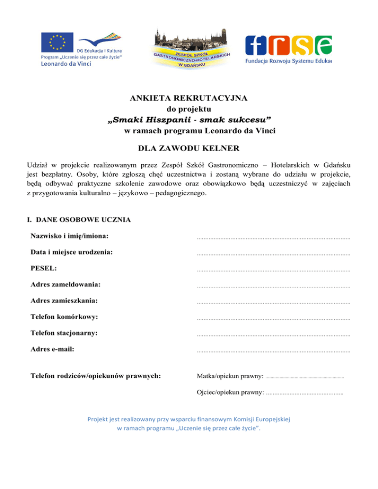 ANKIETA REKRUTACYJNA do projektu „Smaki Hiszpanii - smak sukcesu” w ramach programu Leonardo da Vinci DLA ZAWODU KELNER Udział w projekcie realizowanym przez Zespół Szkół Gastronomiczno – Hotelarskich w Gdańsku jest bezpłatny. Osoby, które zgłoszą chęć uczestnictwa i zostaną wybrane do udziału w projekcie, będą odbywać praktyczne szkolenie zawodowe oraz obowiązkowo będą uczestniczyć w zajęciach z przygotowania kulturalno – językowo – pedagogicznego. I. DANE OSOBOWE UCZNIA Nazwisko i imię/imiona: ………………………………………………………………………………. Data i miejsce urodzenia: ………………………………………………………………………………. PESEL: ………………………………………………………………………………. Adres zameldowania: ………………………………………………………………………………. Adres zamieszkania: ………………………………………………………………………………. Telefon komórkowy: ………………………………………………………………………………. Telefon stacjonarny: ………………………………………………………………………………. Adres e-mail: ………………………………………………………………………………. Telefon rodziców/opiekunów prawnych: Matka/opiekun prawny: .............................................................. Ojciec/opiekun prawny: ………………………………………. Projekt jest realizowany przy wsparciu finansowym Komisji Europejskiej w ramach programu „Uczenie się przez całe życie”. Pochodzenie (proszę podkreślić): Miasto Wieś Dochód na osobę w rodzinie (proszę podkreślić): do 350 zł 351 – 550 zł 551 – 750 zł 751 – 950 zł powyżej 951 zł II. PYTANIA ANKIETOWE 1. Jakie masz oczekiwania związane z uczestnictwem w projekcie? (Można zaznaczyć więcej niż jedną odpowiedź) Uzyskanie nowej wiedzy i umiejętności. Rozwinięcie własnych zainteresowań. Uzupełnienie braków powstałych w toku dotychczasowej nauki. Inne (jakie?) ................................................................................................................................................................................................................................... ................................................................................................................................................................................. .................................................. ................................................................................................................................................................................................................................... …………………………………………………………………………………………………………………………………………………………………………………………………………………………… …………………………………………………………………………………………………………………………………………………………………………………………………………………………… …………………………………………………………………………………………………………………………………………………………………………………………………………………………… …………………………………………………………………………………………… (data i podpis ucznia) Projekt jest realizowany przy wsparciu finansowym Komisji Europejskiej w ramach programu „Uczenie się przez całe życie”. III. WYPEŁNIA KOMISJA REKRUTACYJNA 1. Ocena z języka angielskiego (ostatni semestr): 2. Ocena z zachowania w roku szkolnym 2011/2012: …………….. Ilość punktów: ………….. …………….. Ilość punktów: …………... …………………………………………………………………………………………… (data i podpis przewodniczącego komisji) IV. OPINIA WYCHOWAWCY Nazwisko i imię wychowawcy: ……………………………………………………………………. Ilość punktów (1 – 6 pkt.)*: ………………………………. Opinia o uczniu z uwzględnieniem pracy ucznia na rzecz szkoły i środowiska (udział w konkursach, współpraca przy organizacji uroczystości szkolnych i lokalnych, zachowanie, współdziałanie w grupie, łatwość nawiązywania kontaktów, itp.): ……………………………………………………………………………………………………………………………………………………………. …………………………………………………………………………………………………………………………………………………………….. …………………………………………………………………………………………………………………………………………………………….. …………………………………………………………………………………………………………………………………………………………….. ……………………………………………………………………………………………………………………………………………………………. …………………………………………………………………………………………………………………………………………………………….. ……………………………………………………………………………………………………………………………………………………………. ……………