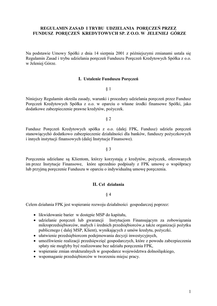 REGULAMIN ZASAD I TRYBU UDZIELANIA PORĘCZEŃ PRZEZ FUNDUSZ PORĘCZEŃ KREDYTOWYCH SP. Z O.O. W JELENIEJ GÓRZE Na podstawie Umowy Spółki z dnia 14 sierpnia 2001 z późniejszymi zmianami ustala się Regulamin Zasad i trybu udzielania poręczeń Funduszu Poręczeń Kredytowych Spółka z o.o. w Jeleniej Górze. I. Ustalenie Funduszu Poręczeń §1 Niniejszy Regulamin określa zasady, warunki i procedury udzielania poręczeń przez Fundusz Poręczeń Kredytowych Spółka z o.o. w oparciu o własne środki finansowe Spółki, jako dodatkowe zabezpieczenie prawne kredytów, pożyczek. §2 Fundusz Poręczeń Kredytowych spółka z o.o. (dalej FPK, Fundusz) udziela poręczeń stanowiącychó dodatkowo zabezpieczenie działalności dla banków, funduszy pożyczkowych i innych instytucji finansowych (dalej Instytucje Finansowe). §3 Poręczenia udzielane są Klientom, którzy korzystają z kredytów, pożyczek, oferowanych im przez Instytucje Finansowe, które uprzednio podpisały z FPK umowę o współpracy lub przyjmą poręczenie Funduszu w oparciu o indywidualną umowę poręczenia. II. Cel działania §4 Celem działania FPK jest wspieranie rozwoju działalności gospodarczej poprzez: likwidowanie barier w dostępie MSP do kapitału, udzielanie poręczeń lub gwarancji Instytucjom Finansującym za zobowiązania mikroprzedsiębiorców, małych i średnich przedsiębiorców,a także organizacji pożytku publicznego ( dalej MSP, Klient), wynikających z umów kredytu, pożyczki. ułatwienie przedsiębiorcom podejmowania decyzji inwestycyjnych, umożliwienie realizacji przedsięwzięć gospodarczych, które z powodu zabezpieczenia spłaty nie mogłyby być realizowane bez udziału poręczenia FPK, wspieranie zmian strukturalnych w gospodarce województwa dolnośląskiego, wspomaganie przedsiębiorców w tworzeniu miejsc pracy. 1 III. Zarządzanie Funduszem §5 1. Funduszem Poręczeń Kredytowych Spółka z o.o. kieruje zgodnie z Umową Spółki Zarząd Spółki, który również dysponuje jego środkami finansowymi. 2. W oparciu o zgromadzone środki finansowe zwane dalej kapitałem poręczeniowym, Zarząd Spółki podejmuje decyzje w sprawie udzielenia poręczenia, w formie pisemnej uchwały z uwzględnieniem postanowień § 10. IV. Kryteria kwalifikacyjne wniosku o udzielenie poręczenia §6 1. Beneficjentami poręczeń Funduszu mogą być wyłącznie przedsiębiorcy, którzy spełniają następujące warunki: a) są mikroprzedsiębiorcami, małymi lub średnimi przedsiębiorcami w rozumieniu określonym w załączniku nr 1do rozporządzenia z dnia 12 stycznia 2001 r. w sprawie stosowania art. 87 i 88 TWE do pomocy państwa dla małych i średnich przedsiębiorców (Dz. Urz. WE L 10 z 13.01.2001 r.) zmienionego rozporządzeniem z dnia 25 lutego 2004 r.( Dz. Urz. WE L 63 z 28.02.2004 r.) i działających zgodnie z ustawą z dnia 2 lipca 2004 r. o swobodzie działalności gospodarczej wraz z przepisami wprowadzającymi i zmieniającymi tę ustawę ( Dz.U. 173/2004, poz. 1807,1808 i Dz. U. 281/2004 poz. 2777 ), b) mają siedzibę i prowadzą działalność na terenie województwa dolnośląskiego, c) posiadają zdolność do spłaty zaciągniętego kredytu/pożyczki, d) nie znajdują się w trudnej sytuacji w rozumieniu Wytycznych Wspólnoty dotyczących pomocy państwa w celu ratowania i restrukturyzacji zagrożonych przedsiębiorstw ( Dz. Urz. WE C 244 z 01.10.2004 r.), e) spełniają wszystkie pozostałe wymogi określone w niniejszym regulaminie. 2. 3. Minimalna wysokość poręczenia wynosi 10.000,00 zł, zaś maksymalna nie może przekroczyć 70% wartości kapitału kredytu oraz 5 % sumy kapitałów funduszu. W przypadku współporęczania przez inne fundusze poręczeń, łączny udział wszystkich funduszy w poręczaniu nie może przekraczać 80 % wartości poręczanego kapitału. V. Warunki dotyczące składania wniosków §7 1. 2. Wnioski o udzielenie poręczenia – Zlecenie poręczenia, powinny być kierowane do FPK za pośrednictwem Instytucji Finansujących, współpracujących z Funduszem lub bezpośrednio do siedziby Funduszu. Wniosek-Zlecenie poręczenia składane do FPK powinno być sporządzone na odpowiednim formularzu, stanowiącym załącznik nr 1 do niniejszego regulaminu. 2 3. Instytucja Finansująca przedkłada Funduszowi potwierdzone kopie wszystkich pozostałych dokumentów złożonych przez Klienta związanych z rozpatrywanym wnioskiem, w tym także zgodę na udostępnienie FPK tych dokumentów. VI. Tryb oceny wniosków §8 Instytucja Finansująca występująca z wnioskiem o poręczenie zobowiązana jest do przeprowadzenia analizy sytuacji ekonomiczno-finansowej MSP oraz oceny zdolności MSP do spłaty zobowiązania zgodnie z warunkami zawieranej umowy. §9 1. 2. Instytucja Finansująca przedstawia FPK swoje propozycje odnośnie warunków na jakich poręczenie może być przyjęte. W uzasadnionych przypadkach FPK spółka z o.o. może zwrócić się do Instytucji Finansującej o postawienie Klientowi dodatkowych warunków. § 10 1. 2. 3. 4. Po otrzymaniu od Instytucji Finansującej Zlecenia poręczenia wraz z potwierdzonymi kopiami wszystkich dokumentów złożonych przez Klienta, merytoryczna komórka Funduszu dokonuje analizy sytuacji ekonomiczno-finansowej i sporządza ocenę wraz z końcową propozycją dla Zarządu Spółki w sprawie udzielania bądź odmowy udzielenia poręczenia. Zarząd Spółki na podstawie przedstawionych materiałów podejmuje w formie uchwały decyzję końcową w sprawie udzielenia bądź odmowy udzielenia poręczenia. W przypadku wydania opinii negatywnej przez komórkę merytoryczną Funduszu, Zarząd Spółki nie może podjąć pozytywnej decyzji o udzieleniu poręczenia. Schemat Oceny sytuacji ekonomiczno finansowej klienta stanowi załącznik nr 2 do niniejszego regulaminu jest wewnętrzną aplikacją Funduszu i nie podlega udostępnieniu klientowi. Ocena sytuacji ekonomiczno – finansowej zawiera analizę ryzyka niespłacenia zac