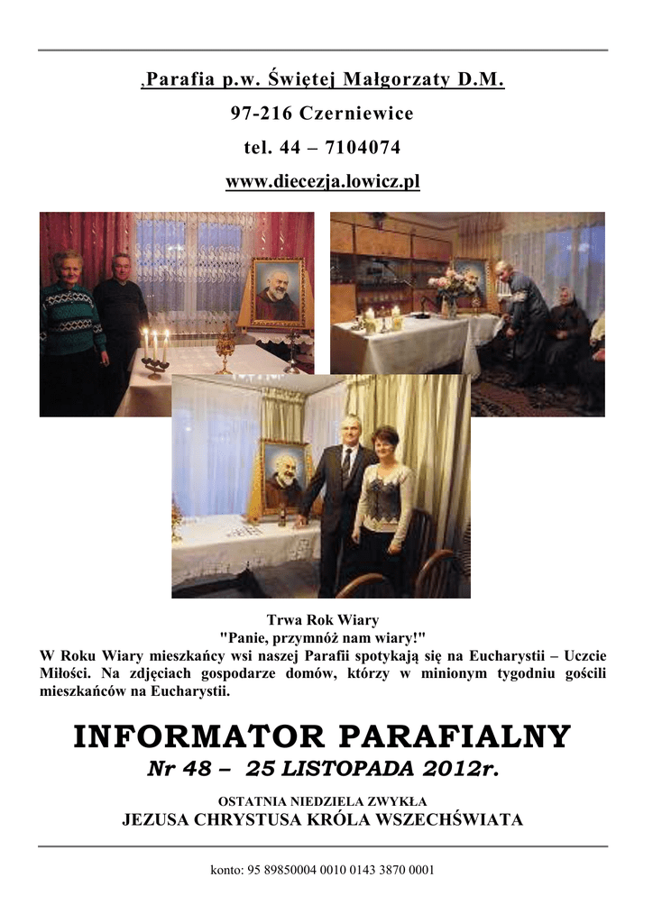 , Parafia p.w. Świętej Małgorzaty D.M. 97-216 Czerniewice tel. 44 – 7104074 www.diecezja.lowicz.pl Trwa Rok Wiary "Panie, przymnóż nam wiary!" W Roku Wiary mieszkańcy wsi naszej Parafii spotykają się na Eucharystii – Uczcie Miłości. Na zdjęciach gospodarze domów, którzy w minionym tygodniu gościli mieszkańców na Eucharystii. INFORMATOR PARAFIALNY Nr 48 – 25 LISTOPADA 2012r. OSTATNIA NIEDZIELA ZWYKŁA JEZUSA CHRYSTUSA KRÓLA WSZECHŚWIATA konto: 95 89850004 0010 0143 3870 0001 EWANGELIA NA OSTATNIĄ NIEDZIELĘ ZWYKŁĄ J 18,33b-37 Królestwo Chrystusa nie jest z tego świata. Piłat powiedział do Jezusa: Czy Ty jesteś Królem żydowskim? Jezus odpowiedział: Czy to mówisz od siebie, czy też inni powiedzieli ci o Mnie? Piłat odparł: Czy ja jestem Żydem? Naród Twój i arcykapłani wydali mi Ciebie. Coś uczynił? Odpowiedział Jezus: Królestwo moje nie jest z tego świata. Gdyby królestwo moje było z tego świata, słudzy moi biliby się, abym nie został wydany Żydom. Teraz zaś królestwo moje nie jest stąd. Piłat zatem powiedział do Niego: A więc jesteś królem? / Odpowiedział Jezus: / Tak, jestem królem. Ja się na to narodziłem i na to przyszedłem na świat, aby dać świadectwo prawdzie. Każdy, kto jest z prawdy, słucha mojego głosu. W ikonografii Chrystus Król już od starożytności przedstawiany jest jako Pantokrator, czyli Wszechwładca, zasiadający na tronie, mający ziemię za podnóżek lub trzymający glob ziemski w dłoni. Ewangelie ukazują nam właściwy wymiar królowania Chrystusa. Ci, którzy ze swojego życia uczynili bezinteresowny dar dla drugich, ostatecznie będą mieli udział w chwale Chrystusa Króla. Do budowania i współpracy w budowaniu takiego królestwa jest zaproszony każdy, kto przez chrzest, bierzmowanie i Eucharystię został wprowadzony do wspólnoty Kościoła. Osobisty wkład każdego został wkalkulowany w wielkie plany i zamiary Boże. Z bogactwem serca i umysłu, a nawet z naszą słabością i chwiejnością. Z całą oryginalnością każdego. To powód do dumy i chluby, ale i odpowiedzialność. Byśmy nie zawiedli, byśmy nie pozostali bierni, wierzący z przyzwyczajenia i tradycji. W tym dziele trzeba zachować zawsze świadomość kontynuacji i współudziału w budowaniu królestwa Bożego, potrzeby działania wspólnego, nawet z tymi, którzy dopiero w ostatniej chwili zostali zaproszeni i odkryli Prawdę Ewangelii. I jest też w tym dorodnym łanie Bożego królestwa miejsce na kąkol, który nieprzyjazny człowiek zasiał pod osłoną ciemności. Kąkol grzechu pychy, chciwości, nienawiści, pożądania, nieumiarkowania, zazdrości, gniewu, lenistwa. Ale dlaczego dostrzegać tylko ciernie i chwasty, grzech i ludzką słabość, nią się pasjonować, ciągle tylko o niej mówić, powtarzać, nawet jej szukać. Przecież, gdzie wzmógł się grzech, tam jeszcze obficiej rozlała się łaska! Każdy z nas ma być jej nośnikiem. Od ołtarza niedzielnej Eucharystii! A może zacząć od rzeczy i spraw najbardziej prozaicznych i małych. Każdy czas i miejsce są dobre, by czynić ziemię godną człowieka! Popatrzmy! Wokół nas tylu chorych, uwięzionych, spragnionych, głodnych, nagich, bezdomnych, smutnych, samotnych, bezrobotnych, zagubionych, wewnętrznie okaleczonych. Jesteśmy wezwani, by przemieniać rzeczywistość, a nie tylko oceniać działania innych. OGŁOSZENIA 1. Przypominam,że Rekolekcje Adwentowe rozpoczną się w naszej Parafii 30 listopada br. Będzie to dzień Odpustu Parafialnego i Sakramentu Pojednania. Msze św. w tym dniu będą sprawowane o godz. 9.00, 12.00 i 17.00. W sobotę Msze św. będą sprawowane również o godz. 9.00, 12.00 i 17.00. W tym dniu będzie spowiadał ks. proboszcz z Inowłodza. Zakończenie Rekolekcji w niedzielę. DO WSPÓLNOTY PARAFIALNEJ PRZYJĘLIŚMY POPRZEZ SAKRAMENT CHRZTU: Michała Haraśnego i Aleksandrę Jędrzejczyk - niech Bóg prowadzi ich przez życie drogą wiary, prawdy i miłości. UŚMIECHNIJ SIĘ LUBI SZKOŁĘ Bardzo lubi naszą szkołę Mój kolega Jasiek, I dlatego po dwa lata Siedzi w każdej klasie. /Cd/ OBRZĘDY WSTĘPNE 9. Gloria („Chwała na wysokości Bogu”) – hymn pochwalny. Powstał już na początku chrześcijaństwa. Nie można go niczym innym zastępować w liturgii. Odśpiewuję się go (można również recytować) w niedziele, uroczystości i niektóre święta. Tego hymnu nie śpiewa się w Adwencie (wyjątkiem są roraty, podczas których zawsze śpiewa się hymn) i Wielkim Poście. 10. Kolekta (oracja) – zwana również modlitwą dnia. Rozpoczyna się od wezwania kapłana „Módlmy się”, po którym powinna nastąpić chwila ciszy, podczas której wierni modlą się w milczeniu. Następnie kapłan odmawia kolektę z rozłożonymi rękami (składa je na słowa „Przez naszego Pana”, lub inne, podobne zakończenie kolekty). Po ukończeniu kolekty lud odpowiada „Amen” włączając się i potwierdzając tym samym modlitwę. „Amen” ludu kończy również obrzędy wstępne, jeżeli nie występuje hymn do Ducha Świętego /cdn./. INTENCJE PONIEDZIAŁEK 26. 11. 2012 16.00 Za +Mariana Pietrzaka /greg.3/. WTOREK 27. 11. 2012 9.00 Za +Mariana Pietrzaka /greg.4/. ŚRODA 28. 11. 2012 16.00 Nowenna do Matki Bożej Nieustającej Pomocy. Za +Czesława w 1 rocz. śmierci i Krystynę Boneckich; +Mariana Pietrzaka /greg.5/. +Stanisławę Filipczak /int. od Koła Żywego Róż. ze Studzianek/; +Krzysztofa Wysmyka /int. od wychowanków/; +Tadeusza Trzonka w 35 rocz. śm., Walerię i Kazimierza Kołodziejczyków; +Władysława i Zofię Gierach /int. od córki Elżbiety z rodziną/; +Władysława Szczurkowskiego; +Jadwigę Sołtysiak /int. od wnuczki Karoliny z mężem/; +Czesławę w 31 rocz. śmierci i Mariana Skonecznych; +Ks. Kazimierza Szczurka. CZWARTEK 29. 11. 2012 16.00 Za +Mariana Pietrzaka /greg.6/. PIĄTEK 30. 11. 2012 9.00 Za +Mariana Pietrzaka /greg.7/. 12.00 Za Parafian. 17.00 Za +Andrzeja Klimc