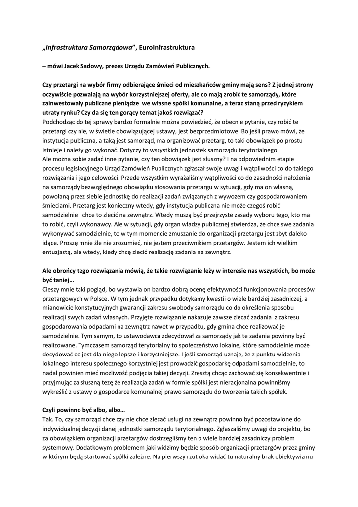 „Infrastruktura Samorządowa”, EuroInfrastruktura – mówi Jacek Sadowy, prezes Urzędu Zamówień Publicznych. Czy przetargi na wybór firmy odbierające śmieci od mieszkańców gminy mają sens? Z jednej strony oczywiście pozwalają na wybór korzystniejszej oferty, ale co mają zrobić te samorządy, które zainwestowały publiczne pieniądze we własne spółki komunalne, a teraz staną przed ryzykiem utraty rynku? Czy da się ten gorący temat jakoś rozwiązać? Podchodząc do tej sprawy bardzo formalnie można powiedzieć, że obecnie pytanie, czy robić te przetargi czy nie, w świetle obowiązującej ustawy, jest bezprzedmiotowe. Bo jeśli prawo mówi, że instytucja publiczna, a taką jest samorząd, ma organizować przetarg, to taki obowiązek po prostu istnieje i należy go wykonać. Dotyczy to wszystkich jednostek samorządu terytorialnego. Ale można sobie zadać inne pytanie, czy ten obowiązek jest słuszny? I na odpowiednim etapie procesu legislacyjnego Urząd Zamówień Publicznych zgłaszał swoje uwagi i wątpliwości co do takiego rozwiązania i jego celowości. Przede wszystkim wyrażaliśmy wątpliwości co do zasadności nałożenia na samorządy bezwzględnego obowiązku stosowania przetargu w sytuacji, gdy ma on własną, powołaną przez siebie jednostkę do realizacji zadań związanych z wywozem czy gospodarowaniem śmieciami. Przetarg jest konieczny wtedy, gdy instytucja publiczna nie może czegoś robić samodzielnie i chce to zlecić na zewnątrz. Wtedy muszą być przejrzyste zasady wyboru tego, kto ma to robić, czyli wykonawcy. Ale w sytuacji, gdy organ władzy publicznej stwierdza, że chce swe zadania wykonywać samodzielnie, to w tym momencie zmuszanie do organizacji przetargu jest zbyt daleko idące. Proszę mnie źle nie zrozumieć, nie jestem przeciwnikiem przetargów. Jestem ich wielkim entuzjastą, ale wtedy, kiedy chcę zlecić realizację zadania na zewnątrz. Ale obrońcy tego rozwiązania mówią, że takie rozwiązanie leży w interesie nas wszystkich, bo może być taniej… Cieszy mnie taki pogląd, bo wystawia on bardzo dobrą ocenę efektywności funkcjonowania procesów przetargowych w Polsce. W tym jednak przypadku dotykamy kwestii o wiele bardziej zasadniczej, a mianowicie konstytucyjnych gwarancji zakresu swobody samorządu co do określenia sposobu realizacji swych zadań własnych. Przyjęte rozwiązanie nakazuje zawsze zlecać zadania z zakresu gospodarowania odpadami na zewnątrz nawet w przypadku, gdy gmina chce realizować je samodzielnie. Tym samym, to ustawodawca zdecydował za samorządy jak te zadania powinny być realizowane. Tymczasem samorząd terytorialny to społeczeństwo lokalne, które samodzielnie może decydować co jest dla niego lepsze i korzystniejsze. I jeśli samorząd uznaje, że z punktu widzenia lokalnego interesu społecznego korzystniej jest prowadzić gospodarkę odpadami samodzielnie, to nadal powinien mieć możliwość podjęcia takiej decyzji. Zresztą chcąc zachować się konsekwentnie i przyjmując za słuszną tezę że realizacja zadań w formie spółki jest nieracjonalna powinniśmy wykreślić z ustawy o gospodarce komunalnej prawo samorządu do tworzenia takich spółek. Czyli powinno być albo, albo… Tak. To, czy samorząd chce czy nie chce zlecać usługi na zewnątrz powinno być pozostawione do indywidualnej decyzji danej jednostki samorządu terytorialnego. Zgłaszaliśmy uwagi do projektu, bo za obowiązkiem organizacji przetargów dostrzegliśmy ten o wiele bardziej zasadniczy problem systemowy. Dodatkowym problemem jaki widzimy będzie sposób organizacji przetargów przez gminy w którym będą startować spółki zależne. Na pierwszy rzut oka widać tu naturalny brak obiektywizmu organizatora przetargu, który może się skończyć określonymi do niego zarzutami. Samorządy staną przed naprawdę bardzo poważnym wyzwaniem i dylematami rozstrzygając organizowane przez siebie przetargi. Bo co się stanie, kiedy w przetargu taka gmina wybierze innego wykonawcę, co z tym przedsiębiorstwem, które zatrudnia pracowników, co z jego majątkiem i jak zapewnić dalsze funkcjonowanie tym spółkom. Samorządy staną przed dylematem podejmowania decyzji z których żadna nie będzie dobrą. Przepisy jednak obowiązują. Możemy mieć wątpliwości, czy prawo jest słuszne, ale nie możemy podważać obowiązywania samej normy prawnej. A co z samorządami, które teraz otwarcie kwestionują te zapisy? Nie mogę się zgodzić ze stwierdzeniem, że jest prawo, którego nie będziemy stosować. To komunikat groźny… Uważam, że granica niezgadzania się z prawem została przesunięta niebezpiecznie daleko, za nią kryje się bezprawie. Wiem co mówię, albowiem na gruncie przepisów ustawy Prawo zamówień publicznych każdego dnia spotykam się z próbami podważania norm zawartych w przepisach przez podmioty, dla których akurat dana norma jest niekorzystna. Przykładem jest choćby norma nakazująca wykluczyć wykonawcę z postępowania z powodu niezrealizowanego wcześniej kontraktu. Zaangażowano do tego nawet Komisję Europejską i ETS, który jednak wskazał, iż rozwiązanie kontraktu może w pewnych szczególnych sytuacjach stanowić podstawę do wykluczenia wykonawcy z postępowania. Jest prawo, które obowiązuje i wszyscy powinniśmy je stosować, czy się nam to podoba, czy nie. Chcę w tym miejscu podkreślić, że niezależnie od zgłaszanych wcześniej wątpliwości, Urząd Zamówień Publicznych też będzie to prawo respektował i dbał o to by zapewnić jego przestrzeganie przez innych. Protestujący mają zastrzeżenia do procesu konsultacji projektu. Poza tym okazało się, że ustawę w części dotyczącej sposobu określania opłat można jednak modyfikować, zwłaszcza po tym, jak premier Donald Tusk skrytykował jedno z przyjętych w tym akcie prawnym rozwiązań. To może jednak i kwestia przetargów nie jest przegrana i kontestujące je samorządy m