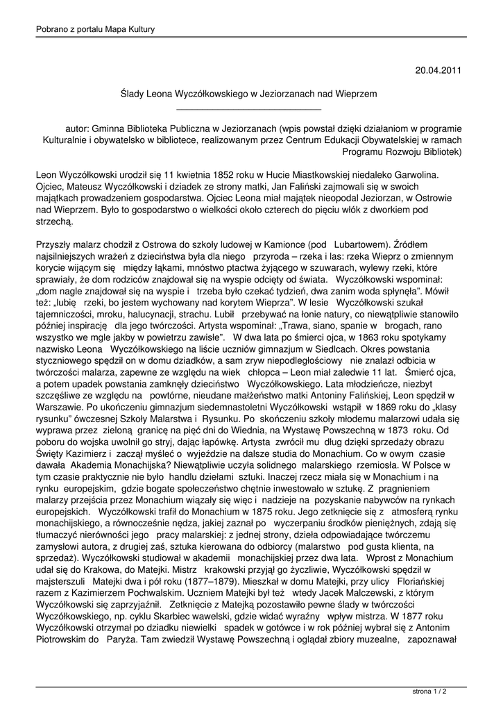 Pobrano z portalu Mapa Kultury 20.04.2011 Ślady Leona Wyczółkowskiego w Jeziorzanach nad Wieprzem ____________________________ autor: Gminna Biblioteka Publiczna w Jeziorzanach (wpis powstał dzięki działaniom w programie Kulturalnie i obywatelsko w bibliotece, realizowanym przez Centrum Edukacji Obywatelskiej w ramach Programu Rozwoju Bibliotek) Leon Wyczółkowski urodził się 11 kwietnia 1852 roku w Hucie Miastkowskiej niedaleko Garwolina. Ojciec, Mateusz Wyczółkowski i dziadek ze strony matki, Jan Faliński zajmowali się w swoich majątkach prowadzeniem gospodarstwa. Ojciec Leona miał majątek nieopodal Jeziorzan, w Ostrowie nad Wieprzem. Było to gospodarstwo o wielkości około czterech do pięciu włók z dworkiem pod strzechą. Przyszły malarz chodził z Ostrowa do szkoły ludowej w Kamionce (pod Lubartowem). Źródłem najsilniejszych wrażeń z dzieciństwa była dla niego przyroda – rzeka i las: rzeka Wieprz o zmiennym korycie wijącym się między łąkami, mnóstwo ptactwa żyjącego w szuwarach, wylewy rzeki, które sprawiały, że dom rodziców znajdował się na wyspie odcięty od świata. Wyczółkowski wspominał: „dom nagle znajdował się na wyspie i trzeba było czekać tydzień, dwa zanim woda spłynęła”. Mówił też: „lubię rzeki, bo jestem wychowany nad korytem Wieprza”. W lesie Wyczółkowski szukał tajemniczości, mroku, halucynacji, strachu. Lubił przebywać na łonie natury, co niewątpliwie stanowiło później inspirację dla jego twórczości. Artysta wspominał: „Trawa, siano, spanie w brogach, rano wszystko we mgle jakby w powietrzu zawisłe”. W dwa lata po śmierci ojca, w 1863 roku spotykamy nazwisko Leona Wyczółkowskiego na liście uczniów gimnazjum w Siedlcach. Okres powstania styczniowego spędził on w domu dziadków, a sam zryw niepodległościowy nie znalazł odbicia w twórczości malarza, zapewne ze względu na wiek chłopca – Leon miał zaledwie 11 lat. Śmierć ojca, a potem upadek powstania zamknęły dzieciństwo Wyczółkowskiego. Lata młodzieńcze, niezbyt szczęśliwe ze względu na powtórne, nieudane małżeństwo matki Antoniny Falińskiej, Leon spędził w Warszawie. Po ukończeniu gimnazjum siedemnastoletni Wyczółkowski wstąpił w 1869 roku do „klasy rysunku” ówczesnej Szkoły Malarstwa i Rysunku. Po skończeniu szkoły młodemu malarzowi udała się wyprawa przez zieloną granicę na pięć dni do Wiednia, na Wystawę Powszechną w 1873 roku. Od poboru do wojska uwolnił go stryj, dając łapówkę. Artysta zwrócił mu dług dzięki sprzedaży obrazu Święty Kazimierz i zaczął myśleć o wyjeździe na dalsze studia do Monachium. Co w owym czasie dawała Akademia Monachijska? Niewątpliwie uczyła solidnego malarskiego rzemiosła. W Polsce w tym czasie praktycznie nie było handlu dziełami sztuki. Inaczej rzecz miała się w Monachium i na rynku europejskim, gdzie bogate społeczeństwo chętnie inwestowało w sztukę. Z pragnieniem malarzy przejścia przez Monachium wiązały się więc i nadzieje na pozyskanie nabywców na rynkach europejskich. Wyczółkowski trafił do Monachium w 1875 roku. Jego zetknięcie się z atmosferą rynku monachijskiego, a równocześnie nędza, jakiej zaznał po wyczerpaniu środków pieniężnych, zdają się tłumaczyć nierówności jego pracy malarskiej: z jednej strony, dzieła odpowiadające twórczemu zamysłowi autora, z drugiej zaś, sztuka kierowana do odbiorcy (malarstwo pod gusta klienta, na sprzedaż). Wyczółkowski studiował w akademii monachijskiej przez dwa lata. Wprost z Monachium udał się do Krakowa, do Matejki. Mistrz krakowski przyjął go życzliwie, Wyczółkowski spędził w majsterszuli Matejki dwa i pół roku (1877–1879). Mieszkał w domu Matejki, przy ulicy Floriańskiej razem z Kazimierzem Pochwalskim. Uczniem Matejki był też wtedy Jacek Malczewski, z którym Wyczółkowski się zaprzyjaźnił. Zetknięcie z Matejką pozostawiło pewne ślady w twórczości Wyczółkowskiego, np. cyklu Skarbiec wawelski, gdzie widać wyraźny wpływ mistrza. W 1877 roku Wyczółkowski otrzymał po dziadku niewielki spadek w gotówce i w rok później wybrał się z Antonim Piotrowskim do Paryża. Tam zwiedził Wystawę Powszechną i oglądał zbiory muzealne, zapoznawał strona 1 / 2 Pobrano z portalu Mapa Kultury się bliżej z wielką sztuką. Lata 1879–1880 spędził we Lwowie, gdzie zaprzyjaźnił się ze starszym od siebie Adamem Chmielowskim. Chmielowski dał Wyczółkowskiemu impuls do namalowania obrazu Alina według Balladyny Słowackiego. W 1881 roku malarz powrócił do Warszawy. Ten okres jego pracy to przede wszystkim portrety i sceny salonowe. Równocześnie rozwijał swój talent kolorysty. Ukraina to kolejny kierunek czy może etap twórczości Leona Wyczółkowskiego. Temat modny wśród ówczesnych malarzy, a także literatów. Artysta malował wtedy głównie obrazy przedstawiające ludzi i przyrodę. Niemniej ludzie pojawiali się zawsze przed przyrodą. Znaczna liczba obrazów z cyklu ukraińskiego, zakupiona na wystawach zagranicznych, rozeszła się po świecie. Dużo dzieł zaginęło w czasie wojny. W 1895 roku Wyczółkowski na propozycję Fałata, nowego dyrektora Akademii Sztuk Pięknych w Krakowie, objął w niej stanowisko wykładowcy. Historyczne zabytki i pamiątki Krakowa zafascynowały byłego ucznia Matejki. Już w 1895 roku zabrał się do malowania Wawelu. Malował nie tylko Wawel jako budowlę, lecz także poszczególne przedmioty ze skarbca wawelskiego. Portrety przyjaciół ze świata artystycznego lub twórców, na których indywidualność Wyczółkowski żywo reagował uczuciowo, są uderzająco trafne, głęboko wnikliwe. I nie tylko przedstawiają różnych ludzi, ale i jako obrazy są całkowicie różne. Wielką popularność u klienteli mieszczańskiej zyskiwały „kwiaty” Wyczółkowskiego i właśnie powodzenie u tej publiczności nie pozwoliło mu w tej dziedzinie na osiągnięcie
