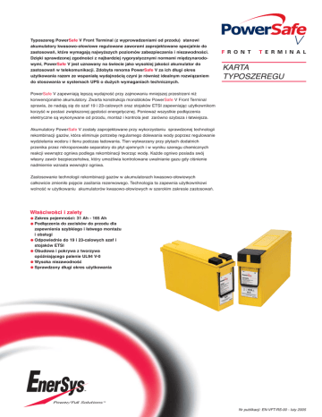 Typoszereg PowerSafe V Front Terminal (z wyprowadzeniami od przodu) stanowi akumulatory kwasowo-ołowiowe regulowane zaworami zaprojektowane specjalnie do zastosowań, które wymagają najwyższych poziomów zabezpieczenia i niezawodności. Dzięki sprawdzonej zgodności z najbardziej rygorystycznymi normami międzynarodowymi, PowerSafe V jest uznawany na świecie jako wysokiej jakości akumulator do zastosowań w telekomunikacji. Zdobyta renoma PowerSafe V za ich długi okres użytkowania razem ze wspaniałą wydajnością czyni je również idealnym rozwiązaniem do stosowania w systemach UPS o dużych wymaganiach technicznych. F R O N T T E R M I N A L KARTA TYPOSZEREGU PowerSafe V zapewniają lepszą wydajność przy zajmowaniu mniejszej przestrzeni niż konwencjonalne akumulatory. Zwarta konstrukcja monobloków PowerSafe V Front Terminal sprawia, że nadają się do szaf 19 i 23-calowych oraz stojaków ETSI zapewniając użytkownikom korzyść w postaci zwiększonej gęstości energetycznej. Ponieważ wszystkie podłączenia elektryczne są wykonywane od przodu, montaż i kontrola jest zarówno szybsza i łatwiejsza. Akumulatory PowerSafe V zostały zaprojektowane przy wykorzystaniu sprawdzonej technologii rekombinacji gazów, która eliminuje potrzebę regularnego dolewania wody poprzez regulowanie wydzielania wodoru i tlenu podczas ładowania. Tlen wytwarzany przy płytach dodatnich przenika przez mikroporowate separatory do płyt ujemnych i w wyniku szeregu chemicznych reakcji wewnątrz ogniwa podlega rekombinacji tworząc wodę. Każde ogniwo posiada swój własny zawór bezpieczeństwa, który umożliwia kontrolowane uwalnianie gazu gdy ciśnienie nadmiernie wzrasta wewnątrz ogniwa. Zastosowanie technologii rekombinacji gazów w akumulatorach kwasowo-ołowiowych całkowicie zmieniło pojęcie zasilania rezerwowego. Technologia ta zapewnia użytkownikowi wolność w użytkowaniu akumulatorów kwasowo-ołowiowych w szerokim zakresie zastosowań. Właściwości i zalety Zakres pojemności: 31 Ah - 165 Ah Podłączenia do zacisków do przodu dla zapewnienia szybkiego i łatwego montażu i obsługi Odpowiednie do 19 i 23-calowych szaf i stojaków ETSI Obudowa i pokrywa z tworzywa opóźniającego palenie UL94 V-0 Wysoka niezawodność Sprawdzony długi okres użytkowania Nr publikacji: EN-VFT-RS-00 - luty 2005 Budowa Montaż i eksploatacja Normy • Płyty dodatnie i ujemne ze stopu ołowiu, cyny i wapnia mają wszystkie typy dla pojemności od 105Ah w górę. Wszystkie pozostałe typy mają płyty ze stopu ołowiu i cyny. • Separatory z mikroporowatego włókna szklanego o niskiej rezystancji. Elektrolit jest uwięziony wewnątrz tego materiału, zapobiegając wylaniu się kwasu w razie przypadkowego uszkodzenia. • Pojemniki i pokrywy z tworzywa ABS opóźniającego palenie i o wysokiej odporności na uderzenia i wibracje. • Zaciski z wkładkami z mosiądzu dla zapewnienia maksymalnej przewodności i wysokiej jakości pierścień uszczelniający dla zapewnienia długiej żywotności. • Samoregulujące zawory bezpieczeństwa zabezpieczające przed wlotem tlenu atmosferycznego. • Typoszereg PowerSafe V Front Terminal jest zaprojektowany do montażu w szafach lub na stojakach, blisko odbiorów. Oddzielna akumulatornia nie jest wymagana. • Zaleca się, aby monobloki PowerSafe V Front Terminal były montowane na swojej podstawie. • Zalecane napięcie ładowania konserwującego: 2,280 V/ogn. w 20°C 2,265 V/ogn. w 25°C. • Dopuszczalny okres składowania: 6 miesięcy w temperaturze 20°C • Ograniczone obsluga: brak konieczności uzupełniania wody. • Zgodne z normą międzynarodową EC 60896-2. • Sklasyfikowane jako 'long life' według Przewodnika EUROBAT. • Zaprojektowane, aby spełnić wymagania normy Telcordia SR-4228. • Certyfikowane przez laboratoria UL (UL Standard 1989). • Zatwierdzone do transportu na statkach i samolotami jako ładunek bezpieczny zgodnie z wymaganiami IMDG (Międzynarodowego Kodu Morskiego dla Towarów Niebezpie-cznych) i OICA (Organizacji Między-narodowego Lotnictwa Cywilnego). • Produkowane w fabrykach EnerSys posiadających certyfikat IS0 9001:2000. Dane techniczne Typ Ilość ogniw Napięcie znamionowe (V) Pojemność znamionowa (Ah) Wymiary znamionowe 10-godz. do napięcia końcowego 1,80V/ogn. w 20°C Długość Szerokość Całkowita wysokość mm mm mm Waga Kg Prąd Rezystancja zwarciowy wewnętrzna Ω) (mΩ Zaciski 12V30F 6 12 31 280 97 159 10,8 1327 9,87 gwint wew.M8 12V38F 6 12 38 280 97 184 12,5 1500 8,53 gwint wew.M8 12V62F 6 12 62 280 97 264 19,7 2100 5,87 gwint wew.M8 12V92F* 6 12 92 395 105 264 28,0 2500 5,05 gwint wew.M8 12V105F* 6 12 105 561 125 235 46,0 3500 3,60 gwint wew.M8 12V125F* 6 12 125 561 105 316 56,0 3818 3,30 gwint wew.M8 12V155FS* 6 12 150 561 125 283 57,0 3435 3,20 gwint wew.M8 12V165F* 6 12 165 561 125 316 67,0 4500 2,80 gwint wew.M8 * Z uchwytami z linki. W W L L H 12V155FS www.enersysinc.com H Globalne główne siedziby P.O. Box 14145 Reading, PA 196212-4145 USA Tel: +1-610-208-1991 +1-800-538-3627 Fax: +1-610-372-8613 EnerSys EMEA Brussels, Belgium Tel: +32 (0)2 247 94 47 EnerSys Asia Guangdong, China Tel: +86-755-2689 3639 EnerSys Limited Rake Lane, Clifton Junction, Swinton, Manchester M27 8LR, UK Tel: +44(0)161 794 4611 Fax: +44 (0)161 727 3809 Kontakt: 12V92F