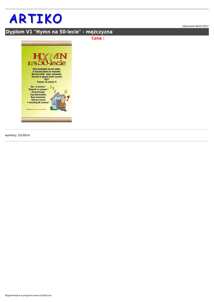Utworzono 08-03-2017 Dyplom V1 "Hymn na 50-lecie" - mężczyzna Cena : wymiary: 22x30cm Wygenerowano w programie www.oscGold.com