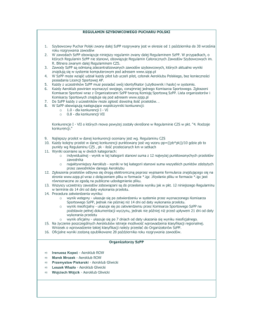 REGULAMIN SZYBOWCOWEGO PUCHARU POLSKI 1. 2. 3. 4. 5. 6. 7. 8. Szybowcowy Puchar Polski zwany dalej SzPP rozgrywany jest w okresie od 1 października do 30 września roku rozgrywania zawodów W zawodach SzPP obowiązuje niniejszy regulamin zwany dalej Regulaminem SzPP. W przypadkach, o których Regulamin SzPP nie stanowi, obowiązuje Regulamin Całorocznych Zawodów Szybowcowych im. R. Bitnera zwanym dalej Regulaminem CZS. Zawody SzPP są odmianą zdecentralizowanych zawodów szybowcowych, których aktualne wyniki znajdują się w systemie komputerowym pod adresem www.szpp.pl W SzPP moŜe wziąść udział kaŜdy pilot lub uczeń pilot, członek Aeroklubu Polskiego, bez konieczności posiadania Licencji Sportowej AP. KaŜdy z uczestników SzPP musi posiadać swój identyfikator (uŜytkownik i hasło) w systemie. KaŜdy Aeroklub powinien wyznaczyć swojego, conajmniej jednego Komisarza Sportowego. Zgłoszeni Komisarze Sportowi wraz z Organizatorami SzPP tworzą Komisję Sportową SzPP. Lista organizatorów i Komisarzy Sportowych znajduje się pod adresem www.szpp.pl Do SzPP kaŜdy z uczestników moŜe zgłosić dowolną ilość przelotów. . W SzPP obowiązują następujące współczynniki konkurencji: o 1.0 - dla konkurencji I - VI o 0.8 - dla konkurencji VII Konkurencje I - VII o których mowa powyŜej zostały określone w Regulaminie CZS w pkt. "4. Rodzaje konkurencji." 9. Najlepszy przelot w danej konkurencji oceniany jest wg. Regulaminu CZS 10. KaŜdy kolejny przelot w danej konkurencji punktowany jest wg wzoru pp=((pb*pk))/10 gdzie pb to punkty wg Regulaminu CZS , pk - ilość przelecianych km w setkach 11. Wyniki oceniane są w dwóch kategoriach: o indywidualnej - wynik w tej kategorii stanowi suma z 12 najwyŜej punktowanychych przelotów zawodnika o najaktywniejszy Aeroklub - wyniki w tej kategorii stanowi suma wszystkich punktów zdobytych przez zawodników danego Aeroklubu 12. Zgłoszenia przelotów odbywa się drogą elektroniczną poprzez wypisanie formularza znajdującego się na stronie www.szpp.pl wraz z dołączeniem pliku w formacie *.igc .Wysłanie pliku w formacie *.igc jest równoznaczne ze zgodą na publiczne udostępnienie pliku. 13. Wszyscy uczestnicy zawodów zobowiązani są do przesłania wyniku jak w pkt. 12 niniejszego Regulaminu w terminie do 14 dni od daty wykonania przelotu. 14. Procedura zatwierdzenia wyniku: o wynik wstępny - ukazuje się po zatwierdzeniu w systemie przez wyznaczonego Komisarza Sportowego SzPP, jednak nie póŜniej niŜ 14 dni od daty wykonania przelotu. o wynik nieoficjalny - ukazuje się po zatwierdzeniu przez Komisarza Sportowego SzPP na podstawie pełnej dokumentacji wyczynu, jednak nie później niŜ przed upływem 21 dni od daty wykonania przelotu o wynik oficjalny - ukazuje się po 7 dniach od daty ukazania się wyniku nieoficjalnego. 15. Na Ŝyczenie poszczególnych Aeroklubów istnieje moŜliwość wprowadzenia klasyfikacji regionalnej. Wniosek o wprowadzenie takiej klasyfikacji naleŜy przesłać do Organizatorów SzPP. 16. Oficjalne wyniki zostaną opublikowane 28 października roku rozgrywania zawodów. Organizatorzy SzPP • • • • • Irenuesz Kopeć - Aeroklub ROW Marek Mrozek - Aeroklub ROW Przemysław Piekarski - Aeroklub Gliwicki Leszek Wlazło - Aeroklub Gliwicki Wojciech Wójcik - Aeroklub Gliwicki Komisarze Sportowi SZPP w poszczególnych Aeroklubach • • • • • • • • • • • • • • • • • • • • • • • • • • • • • • • • • • • • • • • • • • • • • Arek *Arski* Chimiuk - Aeroklub Lubelski Andrzej Augustynek - Aeroklub Krakowski Marcin Bierawski - Aeroklub Gdański Krzysztof Borkowski - Aeroklub Nowy Targ Maciej Całka - Aeroklub Ostrowski Witold Czarnik - Aeroklub Rzeszowski Piotr Dąbrowski - Aeroklub Podkarpacki Jacek Flis - Aeroklub Ziemi Zamojskiej Aleksander Fórmanowski - Aeroklub Leszczyński Sebastian Grzywa - Aeroklub Białostocki Mirosław Hercog - Aeroklub Poznański Wojciech Izdebski - Aeroklub Gdański Bernard Jakubowski - Aeroklub PLL LOT Jakub Jankowiak - Aeroklub Nadwiślański Maciej Jaśkiewicz - Aeroklub Z. Piotrkowskiej Paweł Juszczak - Aeroklub Ostrowski Marek Kalinowski - Aeroklub Lubelski Arkadiusz Kamiński - Aeroklub Kielecki Piotr Kasprzyk - Aeroklub Wrocławski Łukasz Kołodziej - Aeroklub Podhalański Paweł Krzywicki - Aeroklub Suwalski Michał Lewczuk - Aeroklub Warszawski Zbigniew Meller - Aeroklub Poznański Szymon Mistur - Aeroklub Leszczyński Krzysztof Miziołek - Aeroklub Kielecki Przemysław Ochal - Aeroklub Bielsko-Bialski Maciej Oleksiewicz - Aeroklub Warszawski Sławomir Panasiuk - Aeroklub Wrocławski Krzysztof Pankowski - Aeroklub Z. Mazowieckiej Ryszard Pawlus - Aeroklub Kielecki Grzegorz Remlein - Aeroklub Orląt Dęblin Artur Rutkowski - Aeroklub Śląski Rafal Siankowski - Aeroklub Radomski Krzysztof Sobiecki - Aeroklub Bydgoski Bartosz Sobik - Aeroklub ROW Mateusz Szyguła - Aeroklub Śląski Łukasz Szymaniak - Aeroklub Łódzki Tomasz Techmanski - Aeroklub Białostocki Jarosław Urban - Aeroklub Stalowowolski Zenon Wajda - Aeroklub Ziemi Jarosławskiej Leszek Wlazło - Aeroklub Gliwicki Januard Wojtak - Aeroklub Częstochowski Łukasz Wójcik - Aeroklub Włocławski Krzysztof Łuniewski - Aeroklub Warmińsko-Mazurski Robert Ślęczkowski - Aeroklub Z. Lubuskiej