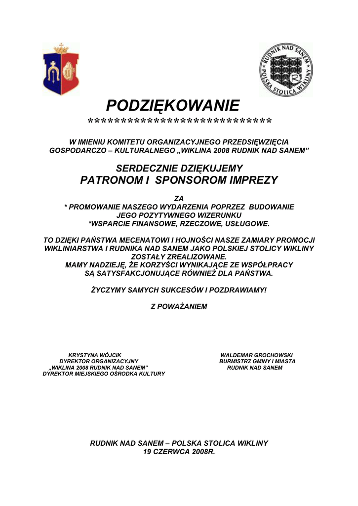 Podziękowanie "Wiklina 2008 Rudnik nad Sanem"
