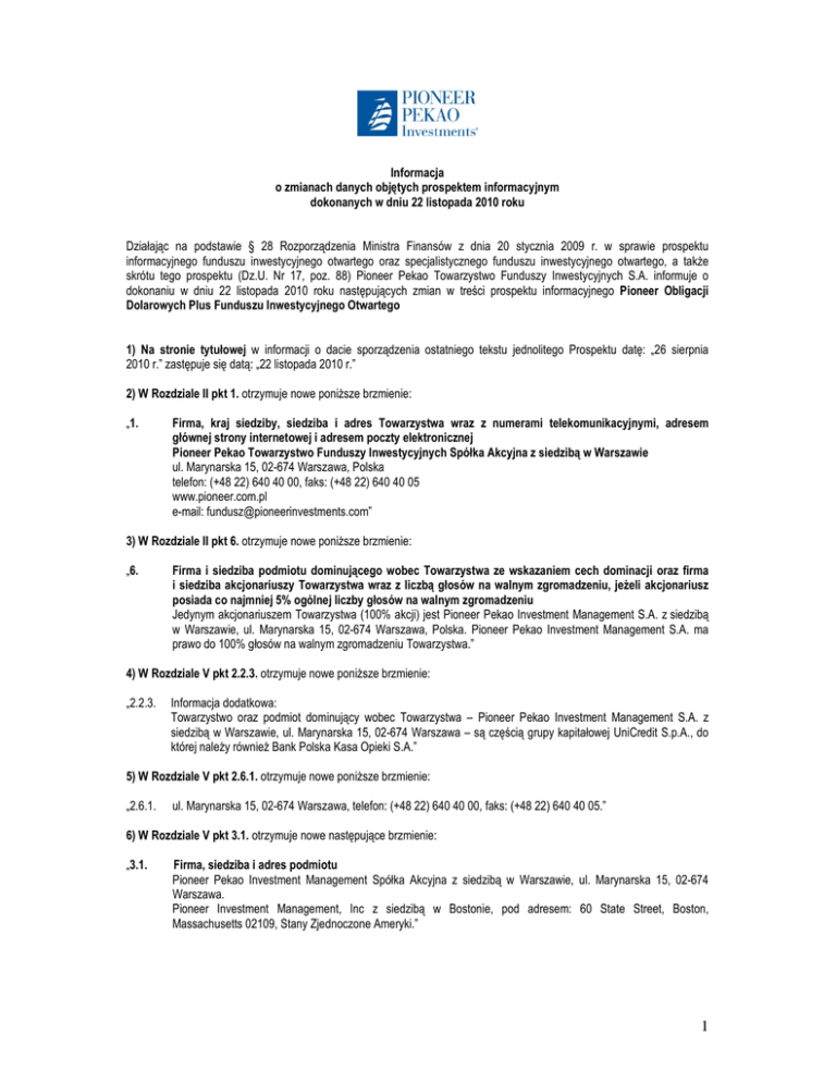 Informacja o zmianach danych objętych prospektem informacyjnym dokonanych w dniu 22 listopada 2010 roku Działając na podstawie § 28 Rozporządzenia Ministra Finansów z dnia 20 stycznia 2009 r. w sprawie prospektu informacyjnego funduszu inwestycyjnego otwartego oraz specjalistycznego funduszu inwestycyjnego otwartego, a także skrótu tego prospektu (Dz.U. Nr 17, poz. 88) Pioneer Pekao Towarzystwo Funduszy Inwestycyjnych S.A. informuje o dokonaniu w dniu 22 listopada 2010 roku następujących zmian w treści prospektu informacyjnego Pioneer Obligacji Dolarowych Plus Funduszu Inwestycyjnego Otwartego 1) Na stronie tytułowej w informacji o dacie sporządzenia ostatniego tekstu jednolitego Prospektu datę: „26 sierpnia 2010 r.” zastępuje się datą: „22 listopada 2010 r.” 2) W Rozdziale II pkt 1. otrzymuje nowe poniższe brzmienie: „1. Firma, kraj siedziby, siedziba i adres Towarzystwa wraz z numerami telekomunikacyjnymi, adresem głównej strony internetowej i adresem poczty elektronicznej Pioneer Pekao Towarzystwo Funduszy Inwestycyjnych Spółka Akcyjna z siedzibą w Warszawie ul. Marynarska 15, 02-674 Warszawa, Polska telefon: (+48 22) 640 40 00, faks: (+48 22) 640 40 05 www.pioneer.com.pl e-mail: [email protected]” 3) W Rozdziale II pkt 6. otrzymuje nowe poniższe brzmienie: „6. Firma i siedziba podmiotu dominującego wobec Towarzystwa ze wskazaniem cech dominacji oraz firma i siedziba akcjonariuszy Towarzystwa wraz z liczbą głosów na walnym zgromadzeniu, jeżeli akcjonariusz posiada co najmniej 5% ogólnej liczby głosów na walnym zgromadzeniu Jedynym akcjonariuszem Towarzystwa (100% akcji) jest Pioneer Pekao Investment Management S.A. z siedzibą w Warszawie, ul. Marynarska 15, 02-674 Warszawa, Polska. Pioneer Pekao Investment Management S.A. ma prawo do 100% głosów na walnym zgromadzeniu Towarzystwa.” 4) W Rozdziale V pkt 2.2.3. otrzymuje nowe poniższe brzmienie: „2.2.3. Informacja dodatkowa: Towarzystwo oraz podmiot dominujący wobec Towarzystwa – Pioneer Pekao Investment Management S.A. z siedzibą w Warszawie, ul. Marynarska 15, 02-674 Warszawa – są częścią grupy kapitałowej UniCredit S.p.A., do której należy również Bank Polska Kasa Opieki S.A.” 5) W Rozdziale V pkt 2.6.1. otrzymuje nowe poniższe brzmienie: „2.6.1. ul. Marynarska 15, 02-674 Warszawa, telefon: (+48 22) 640 40 00, faks: (+48 22) 640 40 05.” 6) W Rozdziale V pkt 3.1. otrzymuje nowe następujące brzmienie: „3.1. Firma, siedziba i adres podmiotu Pioneer Pekao Investment Management Spółka Akcyjna z siedzibą w Warszawie, ul. Marynarska 15, 02-674 Warszawa. Pioneer Investment Management, Inc z siedzibą w Bostonie, pod adresem: 60 State Street, Boston, Massachusetts 02109, Stany Zjednoczone Ameryki.” 1 7) W Rozdziale V pkt 5. otrzymuje nowe następujące brzmienie: „5. Dane o podmiocie uprawnionym do badania sprawozdań finansowych Funduszu KPMG Audyt Spółka z ograniczoną odpowiedzialnością sp. k. z siedzibą w Warszawie ul. Chłodna 51, 00-867 Warszawa. Spółka jest wpisana na listę podmiotów uprawnionych do badania sprawozdań finansowych prowadzoną przez Krajową Izbę Biegłych Rewidentów pod numerem 3546.” 8) W Rozdziale VI pkt 2. otrzymuje nowe poniższe brzmienie: „2. Miejsca, w których dostępny jest Prospekt, roczne i półroczne sprawozdania finansowe Funduszu − Internet: www.pioneer.com.pl − Centrum Obsługi Klienta Pekao Financial Services Sp. z o.o. mieszczące się pod adresem: ul. Postępu 21, 02-676 Warszawa − Siedziba Towarzystwa: ul. Marynarska 15, 02-674 Warszawa” 9) W Rozdziale VII w pkt. 2. w treści statutu Pioneer Obligacji Dolarowych Plus Funduszu Inwestycyjnego Otwartego dokonuje się następujących zmian: I. W art. 3 § 2 otrzymuje nowe poniższe brzmienie: „§ 2. Organem Funduszu jest Pioneer Pekao Towarzystwo Funduszy Inwestycyjnych Spółka Akcyjna z siedzibą w Warszawie pod adresem: 02-674 Warszawa, ul. Marynarska 15, zwane dalej „Towarzystwem”.” II. W art. 5 § 2 otrzymuje nowe poniższe brzmienie: „§ 2. Towarzystwo zawarło umowę o zarządzanie portfelem inwestycyjnym Funduszu ze spółką Pioneer Pekao Investment Management Spółka Akcyjna, z siedzibą w Warszawie pod adresem: 02-674 Warszawa, ul. Marynarska 15, z zastrzeżeniem, że zawarcie takiej umowy nie zwalnia Towarzystwa z określonej w Ustawie odpowiedzialności wobec Uczestników za szkody spowodowane niewykonaniem lub nienależytym wykonaniem obowiązków w zakresie zarządzania Funduszem.” Warszawa, 22 listopada 2010 r. 2