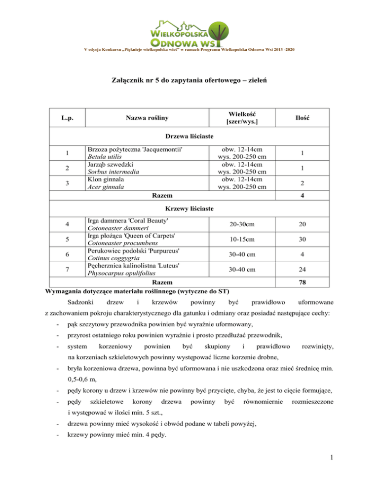 V edycja Konkursu „Pięknieje wielkopolska wieś” w ramach Programu Wielkopolska Odnowa Wsi 2013 -2020 Załącznik nr 5 do zapytania ofertowego – zieleń Wielkość [szer/wys.] Nazwa rośliny L.p. Ilość Drzewa liściaste 1 2 3 Brzoza pożyteczna 'Jacquemontii' Betula utilis Jarząb szwedzki Sorbus intermedia Klon ginnala Acer ginnala Razem obw. 12-14cm wys. 200-250 cm obw. 12-14cm wys. 200-250 cm obw. 12-14cm wys. 200-250 cm 1 1 2 4 Krzewy liściaste Irga dammera 'Coral Beauty' 20-30cm Cotoneaster dammeri Irga płożąca 'Queen of Carpets' 5 10-15cm Cotoneaster procumbens Perukowiec podolski 'Purpureus' 6 30-40 cm Cotinus coggygria Pęcherznica kalinolistna 'Luteus' 7 30-40 cm Physocarpus opulifolius Razem Wymagania dotyczące materiału roślinnego (wytyczne do ST) 4 Sadzonki drzew i krzewów powinny być 20 30 4 24 78 prawidłowo uformowane z zachowaniem pokroju charakterystycznego dla gatunku i odmiany oraz posiadać następujące cechy: - pąk szczytowy przewodnika powinien być wyraźnie uformowany, - przyrost ostatniego roku powinien wyraźnie i prosto przedłużać przewodnik, - system korzeniowy powinien być skupiony i prawidłowo rozwinięty, na korzeniach szkieletowych powinny występować liczne korzenie drobne, - bryła korzeniowa drzewa, powinna być uformowana i nie uszkodzona oraz mieć średnicę min. 0,5-0,6 m, - pędy korony u drzew i krzewów nie powinny być przycięte, chyba, że jest to cięcie formujące, - pędy szkieletowe korony drzewa powinny być równomiernie rozmieszczone i występować w ilości min. 5 szt., - drzewa powinny mieć wysokość i obwód podane w tabeli powyżej, - krzewy powinny mieć min. 4 pędy. 1 V edycja Konkursu „Pięknieje wielkopolska wieś” w ramach Programu Wielkopolska Odnowa Wsi 2013 -2020 Wady niedopuszczalne: - silne uszkodzenia mechaniczne roślin, - odrosty podkładki poniżej miejsca szczepienia, - ślady żerowania szkodników, - oznaki chorobowe, - zwiędnięcie i pomarszczenie kory na korzeniach i częściach nadziemnych, - martwice i pęknięcia kory, - uszkodzenie pąka szczytowego przewodnika, - dwupędowe korony drzew formy piennej, - uszkodzenie lub przesuszenie bryły korzeniowej, - złe zrośnięcie odmiany szczepionej z podkładką. Rośliny powinny być dostarczone w skrzynkach lub doniczkach. Rośliny w postaci rozsady powinny być wyjęte z ziemi na okres możliwie jak najkrótszy, najlepiej bezpośrednio przed sadzeniem. Do czasu wysadzenia rośliny powinny być ocienione, osłonięte od wiatru i zabezpieczone przed wyschnięciem. 2