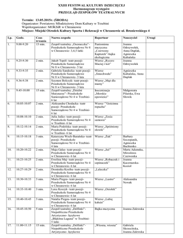 XXIII FESTIWAL KULTURY DZIECIĘCEJ Harmonogram występów PRZEGLĄD ZESPOŁÓW TEATRALNYCH Termin: 13.05.2015r. (ŚRODA) Organizator: Powiatowy Młodzieżowy Dom Kultury w Trzebini Współorganizator: MOKSiR w Chrzanowie Miejsce: Miejski Ośrodek Kultury Sportu i Rekreacji w Chrzanowie ul. Broniewskiego 4 Nazwa zespołu Repertuar Nauczyciel 9.00-9.20 Czas trwania 15 min. Zespół teatralny „Ósemeczka”Przedszkole Samorządowe Nr 8 w Chrzanowie- 3,4,5 latki 2. 9.25-9.30 2 min. Joanna Odrzywołek, Anna Duplak, Agnieszka Kubańska Joanna Odrzywołek 3. 9.33-9.35 2 min. Wiersz „Smochwała” Agnieszka Kubańska, Anna Duplak 4. 9.36-9.38 2 min. 5. 9.45-10.00 15 min. 6. 10.05-10.07 2 min. 7. 10.08-10.10 2 min. 8. 10.12-10.14 2 min. 9. 10.15-10.18 3 min. 10. 10.20-10.22 2 min. 11. 10.23-10.25 2 min. 12. 10.27-10.29 2 min. 13. 10.30-10.33 3 min. 14. 10.35-10.40 3 min. 15. 10.40-10.45 3 min. 16. 10.45-10.50 5 min 17. 11.00-11.15 15 min. Jakub Topól- teatr poezjiPrzedszkole Samorządowe Nr 8 w Chrzanowie- 5 lat Gabriela Sandecka- teatr poezjiPrzedszkole Samorządowe Nr 8 w Chrzanowie- 3 lata Szymon Bolczyk- teatr poezjiPrzedszkole Samorządowe Nr 8 w Chrzanowie- 3 lata Zespół teatralny „Dzielni Marynarze”- Przedszkole Samorządowe Nr 4 w Trzebini6 lat Aleksandra Chodacka- teatr poezji- Przedszkole Samorządowe Nr 4 w Trzebini6 lat Julia Jaśko- teatr poezjiPrzedszkole Samorządowe Nr 4 w Trzebini- 6 lat Maria Podolska- teatr poezjiPrzedszkole Samorządowe Nr 4 w Trzebini- 6 lat Katarzyna Woch-Barańska- teatr poezji- Przedszkole Samorządowe Nr 4 w Trzebini4 lata Maja Galas- teatr poezjiPrzedszkole Samorządowe Nr 4 w Chrzanowie- 6 lat Ewelina Maj- teatr poezjiPrzedszkole Samorządowe Nr 4 w Chrzanowie- 6 lat Dominika Kosiba- teatr poezjiPrzedszkole Samorządowe Nr 4 w Chrzanowie- 6 lat Maria Piegza- teatr poezjiPrzedszkole Samorządowe Nr 4 w Chrzanowie- 6 lat Lena Koszyk- teatr poezjiPrzedszkole Samorządowe Nr 4 w Chrzanowie- 6 lat Natalia Piegza- teatr poezjiPrzedszkole Samorządowe Nr 4 w Chrzanowie- 6 lat Zespół teatralny „Delfinki”Niepubliczne Przedszkole Artystyczno- Językowe „Błękitna Laguna” w Trzebini5 latki Zespół teatralny „Delfinki”Niepubliczne Przedszkole Artystyczno- Językowe Pantomima muzyczna „Czerwony Kapturek”-bajka ekologiczna Wiersz „Rycerz Maciej i kot” Lp. Godz. 1. Wiersz „Mąż dla mamy” Inscenizacja „Morskie opowieści” Małgorzata Pilarska, Ewa Słowik Wiersz ‘”Gościnna ropucha” Wiersz „Zosia samosia” Wiersz „Spóźniony słowik” Wiersz „Żuk” Wiersz „Jeż” Wiersz „Robaczek i szpinaczek” Barbary Szczepanik, Agnieszka Bachtenko Marta Adamska, Mirosława Czerwonka Joanna KaczmarskaKozioł „Laleczka” Wiersz „Lustro” Aleksandra Nowak Wiersz „Osiołek” Wiersz „Lubię kałuże” Bajka muzyczna Joanna Zalewska „Wiosna, wiosna” Gabriela Skrzecińska, Joanna Zalewska Uwagi 18. 11.25-11.45 20 min. 19. 11.55-12.15 20 min. „Błękitna Laguna” w Trzebini5,6 latki Zespół teatralny „Żabki i Tygryski”- Oddział Przedszkolny przy SP Nr 3 w Trzebini-5,6 latki Zespół teatralny „Koniczynki”Przedszkole Samorządowe Nr 7 w Chrzanowie- 5 latki Przedstawienie „Księżniczka na ziarnku grochu” Pantomima „Przygoda Syrenki” Edyta Wielgosz, Elżbieta Poźniak Halina Dudek UWAGA! Prosimy o zgłaszanie się zespołów u organizatora 15 minut przed planowanym występem. Ze względu na ograniczony czas korzystania z sali kinowej prosimy nauczycieli o przestrzeganie czasu 10 minut na przygotowanie się do występu ( dekoracja, ustawianie rekwizytów itp.). Równocześnie zachęcamy do oglądania pozostałych spektakli prezentowanych w ramach Przeglądu Form Teatralnych.