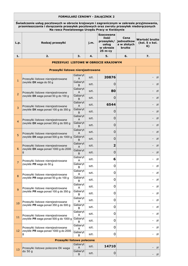 FORMULARZ CENOWY - ZAŁĄCZNIK 2 Świadczenie usług pocztowych w obrocie krajowym i zagranicznym w zakresie przyjmowania, przemieszczania i doręczania przesyłek pocztowych oraz zwrotu przesyłek niedoręczonych Na rzecz Powiatowego Urzędu Pracy w Kwidzynie L.p. 1. Rodzaj przesyłki 2. j.m. 3. Szacowana ilość Cena Wartość brutto przesyłek/ jednostkow (kol. 5 x kol. usług a w złotych 6) w okresie brutto 25 m-cy 4. 5. 6. 7. PRZESYŁKI LISTOWE W OBROCIE KRAJOWYM Przesyłki listowe nierejestrowane 1 2 3 4 5 6 7 8 9 10 11 12 Przesyłki listowe nierejestrowane zwykłe EK waga do 50 g Przesyłki listowe nierejestrowane zwykłe EK waga ponad 50 g do 100 g Przesyłki listowe nierejestrowane zwykłe EK waga ponad 100 g do 350 g Przesyłki listowe nierejestrowane zwykłe EK waga ponad 350 g do 500 g Przesyłki listowe nierejestrowane zwykłe EK waga ponad 500 g do 1000 g Przesyłki listowe nierejestrowane zwykłe EK waga ponad 1000 g do 2000 g Przesyłki listowe nierejestrowane zwykłe PR waga do 50 g Przesyłki listowe nierejestrowane zwykłe PR waga ponad 50 g do 100 g Przesyłki listowe nierejestrowane zwykłe PR waga ponad 100 g do 350 g Przesyłki listowe nierejestrowane zwykłe PR waga ponad 350 g do 500 g Przesyłki listowe nierejestrowane zwykłe PR waga ponad 500 g do 1000 g Przesyłki listowe nierejestrowane zwykłe PR waga ponad 1000 g do 2000 g Gabaryt A Gabaryt B Gabaryt A Gabaryt B Gabaryt A Gabaryt B Gabaryt A Gabaryt B Gabaryt A Gabaryt B Gabaryt A Gabaryt B Gabaryt A Gabaryt B Gabaryt A Gabaryt B Gabaryt A Gabaryt B Gabaryt A Gabaryt B Gabaryt A Gabaryt B Gabaryt A Gabaryt B szt. 20876 - zł szt. 0 - zł szt. 80 - zł szt. 0 - zł szt. 6544 - zł szt. 0 - zł szt. 0 - zł szt. 0 - zł szt. 0 - zł szt. 0 - zł szt. 2 - zł szt. 0 - zł szt. 6 - zł szt. 0 - zł szt. 0 - zł szt. 0 - zł szt. 0 - zł szt. 0 - zł szt. 0 - zł szt. 0 - zł szt. 0 - zł szt. 0 - zł szt. 0 - zł szt. 0 - zł szt. 14710 - zł szt. 0 - zł Przesyłki listowe polecone 13 Przesyłki listowe polecone EK waga do 50 g Gabaryt A Gabaryt B 14 15 16 17 18 19 20 21 22 23 24 25 26 27 28 29 30 31 Gabaryt A zwrot - Przesyłki listowe polecone EK Gabaryt waga do 50 g B Gabaryt Przesyłki listowe polecone EK waga A do 50 g - usługa potwierdzenia Gabaryt odbioru B Gabaryt zwrot - Przesyłki listowe polecone EK A waga do 50 g - usługa potwierdzenia Gabaryt odbioru B Gabaryt A Przesyłki listowe polecone EK waga Gabaryt ponad 50 g do 100 g B Gabaryt A zwrot - Przesyłki listowe polecone EK Gabaryt waga ponad 50 g do 100 g B Gabaryt Przesyłki listowe polecone EK waga A ponad 50 g do 100 g - usługa Gabaryt potwierdzenia odbioru B Gabaryt zwrot - Przesyłki listowe polecone EK A waga ponad 50 g do 100 g - usługa Gabaryt potwierdzenia odbioru B Gabaryt A Przesyłki listowe polecone EK waga Gabaryt ponad 100 g do 350 g B Gabaryt A zwrot - Przesyłki listowe polecone EK Gabaryt waga ponad 100 g do 350 g B Gabaryt Przesyłki listowe polecone EK waga A ponad 100 g do 350 g - usługa Gabaryt potwierdzenia odbioru B Gabaryt zwrot - Przesyłki listowe polecone EK A waga ponad 100 g do 350 g - usługa Gabaryt potwierdzenia odbioru B Gabaryt A Przesyłki listowe polecone EK waga Gabaryt ponad 350 g do 500 g B Gabaryt A zwrot - Przesyłki listowe polecone EK Gabaryt waga ponad 350 g do 500 g B Gabaryt Przesyłki listowe polecone EK waga A ponad 350 g do 500 g - usługa Gabaryt potwierdzenia odbioru B Gabaryt zwrot - Przesyłki listowe polecone EK A waga ponad 350 g do 500 g - usługa Gabaryt potwierdzenia odbioru B Gabaryt A Przesyłki listowe polecone EK waga Gabaryt ponad 500 g do 1000 g B Gabaryt A zwrot - Przesyłki listowe polecone EK Gabaryt waga ponad 500 g do 1000 g B Gabaryt Przesyłki listowe polecone EK waga A ponad 500 g do 1000 g - usługa Gabaryt potwierdzenia odbioru B szt. 1020 - zł szt. 0 - zł szt. 14600 - zł szt. 0 - zł szt. 1 - zł szt. 0 - zł szt. 24 - zł szt. 8 - zł szt. 0 - zł szt. 0 - zł szt. 22 - zł szt. 8 - zł szt. 0 - zł szt. 0 - zł szt. 13230 - zł szt. 58 - zł szt. 918 - zł szt. 0 - zł szt. 13194 - zł szt. 58 - zł szt. 1 - zł szt. 0 - zł szt. 2 - zł szt. 0 - zł szt. 0 - zł szt. 0 - zł szt. 2 - zł szt. 0 - zł szt. 0 - zł szt. 0 - zł szt. 0 - zł szt. 2 - zł szt. 0 - zł szt. 0 - zł szt. 0 - zł szt. 2 - zł 32 33 34 35 36 37 38 39 40 41 42 43 44 45 46 47 48 49 Gabaryt zwrot - Przesyłki listowe polecone EK A waga ponad 500 g do 1000 g Gabaryt usługa potwierdzenia odbioru B Gabaryt A Przesyłki listowe polecone EK waga Gabaryt ponad 1000 g do 2000 g B Gabaryt A zwrot - Przesyłki listowe polecone EK Gabaryt waga ponad 1000 g do 2000 g B Gabaryt Przesyłki listowe polecone EK waga A ponad 1000 g do 2000 g - usługa Gabaryt potwierdzenia odbioru B Gabaryt zwrot - Przesyłki listowe polecone EK A waga ponad 1000 g do 2000 g Gabaryt usługa potwierdzenia odbioru B Gabaryt A Przesyłki listowe polecone PR waga Gabaryt do 50 g B Gabaryt A zwrot - Przesyłki listowe polecone PR Gabaryt waga do 50 g B Gabaryt Przesyłki listowe polecone PR waga A do 50 g - usługa potwierdzenia Gabaryt odbioru B Gabaryt zwrot - Przesyłki listowe polecone PR A waga do 50 g - usługa potwierdzenia Gabaryt odbioru B Gabaryt A Przesyłki listowe polecone PR waga Gabaryt ponad 50 g do 100 g B Gabaryt A zwrot - Przesyłki listowe polecone PR Gabaryt waga ponad 50 g do 100 g B Gabaryt Przesyłki listowe polecone PR waga A ponad 50 g do 100 g - usługa Gabaryt potwierdzenia odbioru B Gabaryt zwrot - Przesyłki listowe polecone PR A waga ponad 50 g do 100 g - usługa Gabaryt potwierdzenia odbioru B Gabaryt A Przesyłki listowe polecone PR waga Gabaryt ponad 100 g do 350 g B Gabaryt A zwrot - Przesyłki listowe polecone PR Gabaryt waga ponad 100 g do 350 g B Gabaryt Przesyłki listowe polecone PR waga A ponad 100 g do 350 g - usługa Gabaryt potwierdzenia odbioru B Gabaryt zwrot - Przesyłki listowe polecone PR A waga ponad 100 g do 350 g - usługa Gabaryt potwierdzenia odbioru B Gabaryt A Przesy