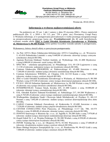 Powiatowy Urząd Pracy w Wieluniu Centrum Aktywizacji Zawodowej 98-300 Wieluń, ul. Sieradzka 56a tel. (043) 843-47-33, (043) 886-05-18 bip-pup.powiat.wielun.pl e-mail: [email protected] Wieluń dn. 09.02.2012r. Informacja o wyborze najkorzystniejszej oferty Na podstawie art. 92 ust. 1 pkt 1 ustawy z dnia 29 stycznia 2004 r. Prawo zamówień publicznych (Dz. U. z 2010 r. Nr 113, poz. 759 z późn. zm.) Powiatowy Urząd Pracy w Wieluniu informuje, iŜ w postępowaniu prowadzonym w trybie przetargu nieograniczonego na przeprowadzenie grupowego kursu pn.: Przedsiębiorczość dla 40 osób bezrobotnych, wybrana została oferta ZDZ w Łodzi Ośrodek Kształcenia Zawodowego w Wieluniu, ul. Mickiewicza 9, 98-300 Wieluń, która spełnia wszystkie warunki udziału w postępowaniu. Wykonawcy, którzy złoŜyli oferty w powyŜszym postępowaniu: 1. Au Pair ANYA Biuro Edukacyjno-Informacyjne ANYA Consulting s.c., ul. Wrzosowa 5, 62-010 Pobiedziska Letnisko z ceną 9.440,00 zł (słownie: dziewięć tysięcy czterysta czterdzieści złotych 00/100), 2. Agencja Rozwoju Edukacji Norbert Jasiński, ul. Wybickiego 144, 41-400 Mysłowice z ceną 6.000,00 zł (słownie: sześć tysięcy 00/100), 3. SPECTRA – szkolenia specjalistyczne, ul. Piłsudskiego 31A, 05-120 Legionowo z ceną 11.130 zł (słownie: jedenaście tysięcy sto trzydzieści złotych 00/100), 4. Centrum Edukacyjne PROGRESS, ul. Paderewskiego 43, 43-600 Jaworzno z ceną 7.260,00 zł (słownie: siedem tysięcy dwieście sześćdziesiąt złotych 00/100), 5. Centrum Szkoleniowe WIEDZA, ul. Chopina 21H, 62-510 Konin z ceną 7.600,00 zł (słownie: siedem tysięcy sześćset złotych 00/100), 6. ZDZ w Łodzi Ośrodek Kształcenia Zawodowego w Wieluniu, ul. Mickiewicza 9, 98-300 Wieluń z ceną 4.915,00 zł (słownie: cztery tysiące dziewięćset piętnaście złotych 00/100), 7. P.P.H.U. SWAN Sebastian Spaleniak, ul. Mickiewicza 1a, 98-300 Wieluń z ceną 3.240,00 zł (słownie: trzy tysiące dwieście czterdzieści złotych 00/100), 8. INTERPRETIS.EU Tomasz Smyk, Krynka 245, 21-400 Łuków z ceną 10.080,00 zł (słownie: dziesięć tysięcy osiemdziesiąt złotych 00/100), 9. O.K. Ośrodek Kursów Edmund Kwidziński, ul. Sobieskiego 217, 84-200 Wejherowo z ceną 4.765,00 zł (słownie: cztery tysiące siedemset sześćdziesiąt pięć złotych 00/100), 10. Wielkopolska Akademia Nauki i Rozwoju Jakub Michałowski, ul. Przełęcz 51, 60-115 Poznań z ceną 7.692,00 zł (słownie: siedem tysięcy sześćset dziewięćdziesiąt dwa złote 00/100), 11. CARGO Centrum Edukacji Zawodowej, ul. Krakowska 9, 43-600 Jaworzno z ceną 7.520,00 zł (słownie: siedem tysięcy pięćset dwadzieścia złotych 00/100), 12. CENTER CONSULTING Piotr Piaseczny, ul. Piłsudskiego 11/17 lok. 700, 10-575 Olsztyn z ceną 10.400,00 zł (słownie: dziesięć tysięcy czterysta złotych 00/100), 13. INNOVO Innowacje w Biznesie Sp. z o.o., ul. Jagiełły 8, 38-200 Jasło z ceną 7.979,00 zł (słownie: siedem tysięcy dziewięćset siedemdziesiąt dziewięć złotych 00/100), 14. Zespół Szkół Nr 1, ul. Wojska Polskiego 32, 98-300 Wieluń z ceną 4.930,00 zł (słownie: cztery tysiące dziewięćset trzydzieści złotych 00/100), 15. INFOR Training Sp. z o.o., ul. Okopowa 58/72, 01-042 Warszawa z ceną 27.600,00 zł (słownie: dwadzieścia siedem tysięcy sześćset złotych 00/100), 16. Biuro Obsługi Inicjatyw Europejskich Sp. z o.o., ul. Piotrkowska 99, 90-425 Łódź z ceną 7.800,00 zł (słownie: siedem tysięcy osiemset złotych 00/100), 17. SALOMON Centrum Szkoleniowo-Doradcze, ul. Dworcowa 1, 74-500 Chojna z ceną 8.950,00 (słownie: osiem tysięcy dziewięćset pięćdziesiąt złotych 00/100), 18. AB AUTO-SZKOŁA Dagmara Mróz, ul. Piotrkowska 134, 90-062 Łódź z ceną 6.390,00 zł (słownie: sześć tysięcy trzysta dziewięćdziesiąt złotych 00/100). Streszczenie oceny i porównanie złoŜonych ofert: Nr oferty Nazwa i adres Wykonawcy Liczba punktów w kryterium: koszt kursu 40% Liczba punktów w kryterium: program szkolenia oraz warunki jego realizacji 20% Liczba punktów w kryterium: kwalifikacj e kadry dydaktyczn ej 20% Liczba punktów w kryterium: warunki lokalowe i wyposaŜenie techniczno – dydaktyczne 15% Liczba punktów w kryterium: działalność promocyjna na rzecz absolwentów kursu 5% Łączna punktacja I Au Pair ANYA ul. Wrzosowa 5 62-010 Pobiedziska Letnisko 6,24 4,8 5,6 3,9 0,15 20,69 II Agencja Rozwoju Edukacji ul. Wybickiego 144 41-400 Mysłowice 9,84 4,4 5,8 3,6 0,15 23,79 8,16 4,6 5,4 3,45 0,15 21,76 7,8 4,6 5,4 3,6 0,15 21,55 12 6 3,4 3,15 0,15 24,7 7,68 5,4 4,8 2,7 0,15 20,73 7,8 5,4 4,8 4,05 0,15 22,2 5,64 4 5 3,15 0,15 17,94 IV V VI X XI XII Centrum Edukacyjne PROGRESS ul. Paderewskiego 43 43-600 Jaworzno Centrum Szkoleniowe WIEDZA ul. Chopina 21 H 62-510 Konin ZDZ w Łodzi Ośrodek Kształcenia Zawodowego w Wieluniu ul. Mickiewicza 9 98-300 Wieluń Wielkopolska Akademia Nauki i Rozwoju ul. Przełęcz 51 60-115 Poznań CARGO Centrum Edukacji Zawodowej ul. Krakowska 9 43-600 Jaworzno CENTER CONSULTING Piotr Piaseczny ul. Piłsudskiego 11/17 l.700 10-575 Olsztyn XIII XVI XVIII INNOVO Innowacje w Biznesie Sp. z o.o. ul. Jagiełły 8 38-200 Jasło Biuro Obsługi Inicjatyw Europejskich Sp. z o.o. ul. Piotrkowska 99 90-425 Łódź AB AUTO-SZKOŁA Dagmara Mróz ul. Piotrkowska 134 90-062 Łódź 7,44 6 6 3,9 0,15 23,49 7,56 6 6 3,9 0,15 23,61 9,24 3,6 4,8 4,5 0,15 22,29 Informacja o odrzuceniu ofert Na podstawie art. 92 ust. 1 pkt 2 ustawy z dnia 29 stycznia 2004 r. Prawo zamówień publicznych (Dz. U. z 2010 r. Nr 113, poz. 759 z późn. zm.) Powiatowy Urząd Pracy w Wieluniu informuje, Ŝe poniŜsze oferty złoŜone w postępowaniu o udzielenia zamówienia publicznego na przeprowadzenie grupowego kursu pn.: Przedsiębiorczość dla 40 osób bezrobotnych, zostały odrzucone przez Komisję Przetargową. Nr oferty III VII Nazwa i adres Wykonawcy SPECTRA- szkolenia specjalistyczne ul. Piłsudskiego 31 A 05-120 Legionowo P.P.H.U. SWAN S