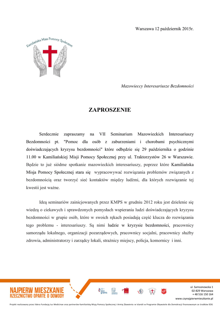 Warszawa 12 październik 2015r. Mazowieccy Interesariusze Bezdomności ZAPROSZENIE Serdecznie Bezdomności pt. zapraszamy "Pomoc dla na VII osób z Seminarium zaburzeniami Mazowieckich i chorobami Interesariuszy psychicznymi doświadczających kryzysu bezdomności" które odbędzie się 29 października o godzinie 11.00 w Kamiliańskiej Misji Pomocy Społecznej przy ul. Traktorzystów 26 w Warszawie. Będzie to już siódme spotkanie mazowieckich interesariuszy, poprzez które Kamiliańska Misja Pomocy Społecznej stara się wypracowywać rozwiązania problemów związanych z bezdomnością oraz tworzyć sieć kontaktów między ludźmi, dla których rozwiązanie tej kwestii jest ważne. Ideą seminariów zainicjowanych przez KMPS w grudniu 2012 roku jest dzielenie się wiedzą o ciekawych i sprawdzonych pomysłach wspierania ludzi doświadczających kryzysu bezdomności w grupie osób, które w swoich rękach posiadają część klucza do rozwiązania tego problemu - interesariuszy. Są nimi ludzie w kryzysie bezdomności, pracownicy samorządu lokalnego, organizacji pozarządowych, pracownicy socjalni, pracownicy służby zdrowia, administratorzy i zarządcy lokali, strażnicy miejscy, policja, komornicy i inni. ul. Samsonowska 1 02-829 Warszawa + 48 516 150 164 www.czynajpierwmieszkanie.pl Projekt realizowany przez lidera Fundację Ius Medicinae oraz partnerów Kamiliańską Misję Pomocy Społecznej i Armię Zbawienia w Islandii w Programie Obywatele dla Demokracji finansowanym ze środków EOG Prelegenci to doświadczeni praktycy i teoretycy. Postarają się opowiedzieć Państwu o swojej codziennej pracy, osiągnięciach oraz wyzwaniach. Seminarium podzielone będzie na dwie części. Pierwsza z nich dotyczyć będzie aktualnie oferowanej pomocy osobom z chorobami i zaburzeniami psychicznymi, które znajdują się w kryzysie bezdomności. W drugiej przedstawione zostaną propozycje programu „Najpierw Mieszkanie”. Wiedza będzie punktem wyjścia do dyskusji. Więcej informacji na www.czynajpierwmieszkanie.pl. Z poważaniem Adriana Porowska Dyrektor Kamiliańskiej Misji Pomocy Społecznej W załączeniu: Program Seminarium ul. Samsonowska 1 02-829 Warszawa + 48 516 150 164 www.czynajpierwmieszkanie.pl Projekt realizowany przez lidera Fundację Ius Medicinae oraz partnerów Kamiliańską Misję Pomocy Społecznej i Armię Zbawienia w Islandii w Programie Obywatele dla Demokracji finansowanym ze środków EOG Seminarium organizowane jest przez Kamiliańską Misję Pomocy Społecznej, która od 2012 r. jest zaangażowana w budowę sieci współpracy Mazowieckich Interesariuszy Bezdomności na rzecz efektywnego zapobiegania bezdomności w regionie. Wydarzenie jest elementem projektu Fundacji Ius Medicinae pt. „Najpierw mieszkanie - rzecznictwo oparte o dowody" finansowanego w programie "Obywatele dla Demokracji" ze środków EOG. Celem projektu jest zgromadzenie argumentów na rzecz wprowadzenia w Polsce efektywnych kosztowo i skutecznych programów kończących bezdomność ul. Samsonowska 1 02-829 Warszawa + 48 516 150 164 www.czynajpierwmieszkanie.pl Projekt realizowany przez lidera Fundację Ius Medicinae oraz partnerów Kamiliańską Misję Pomocy Społecznej i Armię Zbawienia w Islandii w Programie Obywatele dla Demokracji finansowanym ze środków EOG