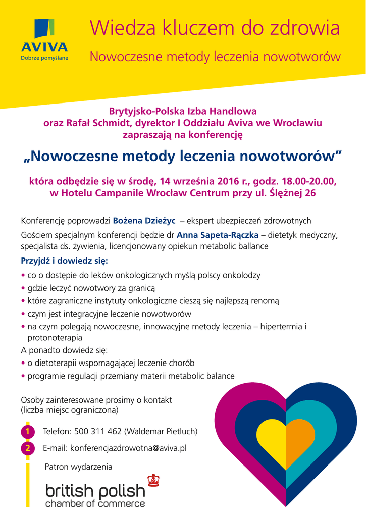 Wiedza kluczem do zdrowia Dobrze pomyślane Nowoczesne metody leczenia nowotworów Brytyjsko-Polska Izba Handlowa oraz Rafał Schmidt, dyrektor I Oddziału Aviva we Wrocławiu zapraszają na konferencję „Nowoczesne metody leczenia nowotworów” która odbędzie się w środę, 14 września 2016 r., godz. 18.00-20.00, w Hotelu Campanile Wrocław Centrum przy ul. Ślężnej 26 Konferencję poprowadzi Bożena Dzieżyc – ekspert ubezpieczeń zdrowotnych Gościem specjalnym konferencji będzie dr Anna Sapeta-Rączka – dietetyk medyczny, specjalista ds. żywienia, licencjonowany opiekun metabolic ballance Przyjdź i dowiedz się: • co o dostępie do leków onkologicznych myślą polscy onkolodzy • gdzie leczyć nowotwory za granicą • które zagraniczne instytuty onkologiczne cieszą się najlepszą renomą • czym jest integracyjne leczenie nowotworów • na czym polegają nowoczesne, innowacyjne metody leczenia – hipertermia i protonoterapia A ponadto dowiedz się: • o dietoterapii wspomagającej leczenie chorób • programie regulacji przemiany materii metabolic balance Osoby zainteresowane prosimy o kontakt (liczba miejsc ograniczona) 1 Telefon: 500 311 462 (Waldemar Pietluch) 2 E-mail: [email protected] Patron wydarzenia