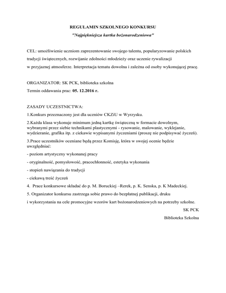 REGULAMIN SZKOLNEGO KONKURSU "Najpiękniejsza kartka bożonarodzeniowa" CEL: umożliwienie uczniom zaprezentowanie swojego talentu, popularyzowanie polskich tradycji świątecznych, rozwijanie zdolności młodzieży oraz uczenie rywalizacji w przyjaznej atmosferze. Interpretacja tematu dowolna i zależna od osoby wykonującej pracę. ORGANIZATOR: SK PCK, biblioteka szkolna Termin oddawania prac: 05. 12.2016 r. ZASADY UCZESTNICTWA: 1.Konkurs przeznaczony jest dla uczniów CKZiU w Wyrzysku. 2.Każda klasa wykonuje minimum jedną kartkę świąteczną w formacie dowolnym, wybranymi przez siebie technikami plastycznymi - rysowanie, malowanie, wyklejanie, wydzieranie, grafika itp. z ciekawie wypisanymi życzeniami (proszę nie podpisywać życzeń). 3.Prace uczestników oceniane będą przez Komisję, która w swojej ocenie będzie uwzględniać: - poziom artystyczny wykonanej pracy - oryginalność, pomysłowość, pracochłonność, estetyka wykonania - stopień nawiązania do tradycji - ciekawą treść życzeń 4. Prace konkursowe składać do p. M. Boruckiej –Rerek, p. K. Senska, p. K Madeckiej. 5. Organizator konkursu zastrzega sobie prawo do bezpłatnej publikacji, druku i wykorzystania na cele promocyjne wzorów kart bożonarodzeniowych na potrzeby szkolne. SK PCK Biblioteka Szkolna