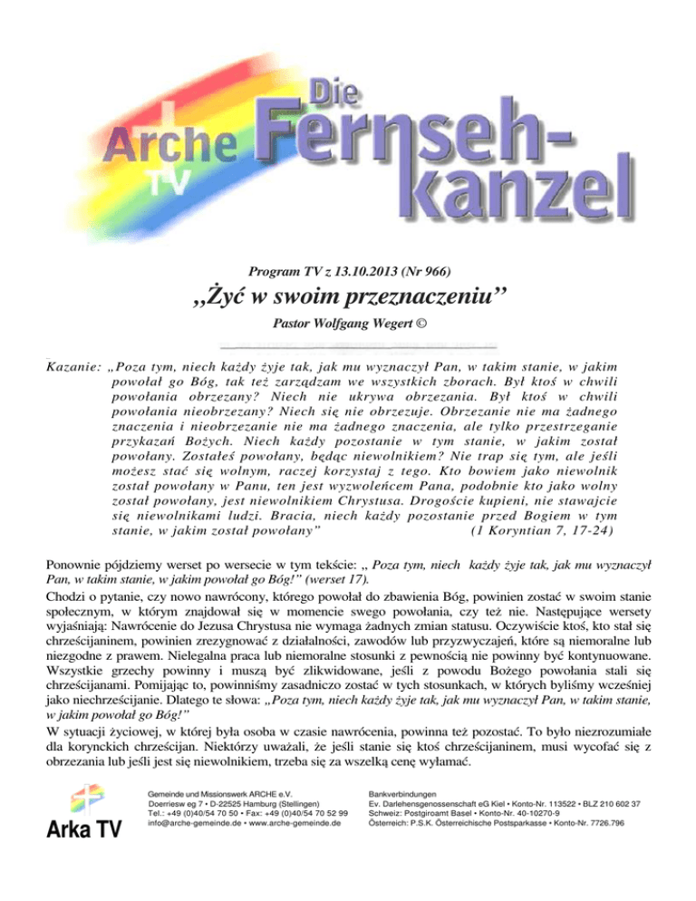Program TV z 13.10.2013 (Nr 966) „Żyć w swoim przeznaczeniu” Pastor Wolfgang Wegert © Christian Kazanie: „Poza tym, niech każdy żyje tak, jak mu wyznaczył Pan, w takim stanie, w jakim powołał go Bóg, tak też zarządzam we wszystkich zborach. Był ktoś w chwili powołania obrzezany? Niech nie ukrywa obrzezania. Był ktoś w chwili powołania nieobrzezany? Niech się nie obrzezuje. Obrzezanie nie ma żadnego znaczenia i nieobrzezanie nie ma żadnego znaczenia, ale tylko przestrzeganie przykazań Bożych. Niech każdy pozostanie w tym stanie, w jakim został powołany. Zostałeś powołany, będąc niewolnikiem? Nie trap się tym, ale jeśli możesz stać się wolnym, raczej korzystaj z tego. Kto bowiem jako niewolnik został powołany w Panu, ten jest wyzwoleńcem Pana, podobnie kto jako wolny został powołany, jest niewolnikiem Chrystusa. Drogoście kupieni, nie stawajcie się niewolnikami ludzi. Bracia, niech każdy pozostanie przed Bogiem w tym stanie, w jakim został powołany” (1 Koryntian 7, 17-24) Ponownie pójdziemy werset po wersecie w tym tekście: „ Poza tym, niech każdy żyje tak, jak mu wyznaczył Pan, w takim stanie, w jakim powołał go Bóg!” (werset 17). Chodzi o pytanie, czy nowo nawrócony, którego powołał do zbawienia Bóg, powinien zostać w swoim stanie społecznym, w którym znajdował się w momencie swego powołania, czy też nie. Następujące wersety wyjaśniają: Nawrócenie do Jezusa Chrystusa nie wymaga żadnych zmian statusu. Oczywiście ktoś, kto stał się chrześcijaninem, powinien zrezygnować z działalności, zawodów lub przyzwyczajeń, które są niemoralne lub niezgodne z prawem. Nielegalna praca lub niemoralne stosunki z pewnością nie powinny być kontynuowane. Wszystkie grzechy powinny i muszą być zlikwidowane, jeśli z powodu Bożego powołania stali się chrześcijanami. Pomijając to, powinniśmy zasadniczo zostać w tych stosunkach, w których byliśmy wcześniej jako niechrześcijanie. Dlatego te słowa: „Poza tym, niech każdy żyje tak, jak mu wyznaczył Pan, w takim stanie, w jakim powołał go Bóg!” W sytuacji życiowej, w której była osoba w czasie nawrócenia, powinna też pozostać. To było niezrozumiałe dla korynckich chrześcijan. Niektórzy uważali, że jeśli stanie się ktoś chrześcijaninem, musi wycofać się z obrzezania lub jeśli jest się niewolnikiem, trzeba się za wszelką cenę wyłamać. Arka TV Gemeinde und Missionswerk ARCHE e.V. Doerriesw eg 7 • D-22525 Hamburg (Stellingen) Tel.: +49 (0)40/54 70 50 • Fax: +49 (0)40/54 70 52 99 [email protected] • www.arche-gemeinde.de Bankverbindungen Ev. Darlehensgenossenschaft eG Kiel • Konto-Nr. 113522 • BLZ 210 602 37 Schweiz: Postgiroamt Basel • Konto-Nr. 40-10270-9 Österreich: P.S.K. Österreichische Postsparkasse • Konto-Nr. 7726.796 Strona 2 -Program TV nr 966 /„Żyć w swoim przeznaczeniu” Inni byli zdania, że natychmiast muszą zmienić stan małżeński, ponieważ nie mogą żyć z niewierzącym współmałżonkiem. Paweł teraz wyjaśnia te i podobne poglądy. Obrzezanie Byli Żydzi, którzy wzięli swoje chrześcijańskie powołanie tak poważnie, że chcieli dać się obrzezać. Historyczne książki mówią o Żydach, którzy dokonywali tego za pomocą chirurgicznego zabiegu. I wydaje się, że Paweł jak gdyby to określił, pisząc: „Był ktoś w chwili powołania obrzezany? Niech nie ukrywa obrzezania. Był ktoś w chwili powołania nieobrzezany? Niech się nie obrzezuje” (werset 18). Niektórzy, Żydzi, którzy stali się wierzącymi chcieli zmienić coś zewnętrznie, aby być dobrymi chrześcijanami. Ale przesłanie Ewangelii brzmi: To nie ma znaczenia, co jest zewnętrzne, ale to kim jesteś wewnętrznie. Nie musisz rezygnować z żydowskiej tożsamości, aby być uczniem Jezusa. I ty, jako poganin, nie musisz próbować, być jak Żyd, aby w ten sposób być prawdziwym chrześcijaninem. Ponieważ: „Obrzezanie nie ma żadnego znaczenia i nieobrzezanie nie ma żadnego znaczenia, ale tylko przestrzeganie przykazań Bożych” (werset 19). Ogrom prawdziwej wiary chrześcijańskiej jest tajemnicą, która może być wszędzie przeżywana możesz być poganinem lub Żydem. Nie ma formy zewnętrznej, która was oddziela i która uniemożliwia razem wielbić swojego Pana i Zbawiciela Jezusa Chrystusa. Nie powinniśmy oceniać zewnętrznie, gdy ludzie przychodzą do Chrystusa. Pozwólcie niech przyjdą jako Żydzi czy poganie albo wyznawcy jakiejkolwiek religii lub w ogóle nie należący do żadnej religii. Wiara w Chrystusa może i powinna być przeżywana w każdym kontekście tak, że Żyd może być Żydem, Grek, Grekiem. Obrzezani i nieobrzezani też powinni opowiadać o Jezusie swoim znajomym, również jeśli mają tatuaże swojej byłej grupy rockowej. W Arce pośród nas mamy ponad 30 różnych narodowości. Nasze różne pochodzenie, cechy, kultura lub język nam nie przeszkadzają w naszym wspólnym wielbieniu Pana w duchu i w prawdzie. Nie muszą być ubrani i uczesani jak Niemcy lub jeść kiszoną kapustę i wędzone mięso, zanim będziemy mogli być z nimi jednymi w wierze. Nie, ponieważ „obrzezanie nie ma żadnego znaczenia i nierzezanie nie ma żadnego znaczenia, ale tylko przestrzeganie przykazań Bożych!” Zewnętrznie mamy tysiąckrotne różnice, ale w jednym jesteśmy tacy sami - mianowicie przez moc odnowionego serca i przez pomoc Ducha Świętego przestrzegamy Boże przykazania. To oznacza, Dziesięć Przykazań prawa moralności i interpretowanie Biblii. Kim też jesteśmy, skąd też pochodzimy - nas łączy pragnienie świętego życia w Jezusie Chrystusie. Status Następnie zajął się tekstem do nowonawróconych niewolników: „Niech każdy pozostanie w tym stanie, w jakim został powołany. Zostałeś powołany, będąc niewolnikiem? Nie trap się tym” (werset 20-21). W Imperium Rzymskim około 50% ludności stanowili niewolnicy. Jednak w przeciwieństwie do ca