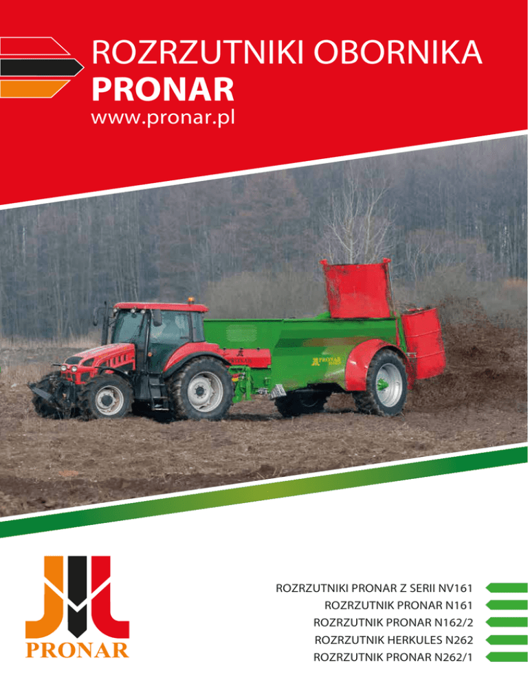 ROZRZUTNIKI OBORNIKA PRONAR www.pronar.pl ROZRZUTNIKI PRONAR Z SERII NV161 ROZRZUTNIK PRONAR N161 ROZRZUTNIK PRONAR N162/2 ROZRZUTNIK HERKULES N262 ROZRZUTNIK PRONAR N262/1 ROZRZUTNIKI ROZRZUTNIKI OBORNIKA OBORNIKA PRONAR PRONAR Z SERIIZNV161 SERII NV161 RozrzutnikiRozrzutniki obornika PRONAR obornikaprzeznaczone PRONAR przeznaczone są do precyzyjnego są do precyzyjnego i równomiernego i równomie rozrzucaniarozrzucania obornika, torfu, obornika, kompostu. torfu, kompostu. Rozrzutniki Rozrzutniki obornika PRONAR obornikatoPRONAR wydajne,to wy solidne i wytrzymałe solidne i wytrzymałe urządzenia,urządzenia, których zastosowanie których zastosowanie zapewnia idealne zapewnia i skuteczne idealne i sku 3 3 nawożenie. nawożenie. Mają optymalną Mają pojemność optymalną pojemność od 9,1 m od 9,1 m 3 3 rozrzutniki czemu rozrzutniki obornika obornika do 14,9 mdodzięki 14,9 czemu m dzięki PRONAR toPRONAR doskonałe to rozwiązanie doskonałe rozwiązanie zarówno dlazarówno dla małych jak imałych dużychjak gospodarstw i dużych gospodarstw rolnych. rolnych. NV161/1 (6 ton)NV161/1 (6 ton) Dane techniczne: Dane techniczne: NV161/1 NV161/1 NV161/2 NV161/2 NV161/3 NV161/3 NV161/4 NV161/5 NV161/4 Dopuszczalna masa całkowita: Dopuszczalna masa całkowita:10500 10500 12300 12300 14200 14200 17200 19900 17200 [kg]19900 Ładowność: Ładowność: 6750 6750 8490 8490 10240 10240 12290 14690 12290 [kg]14690 Masa własna: Masa własna: 3750 3750 3810 3810 3960 3960 4910 5210 4910 [kg] 5210 Pojemność ładunkowa: Pojemność ładunkowa: 9,1 9,1 10,7 10,7 11,8 11,8 13,1 14,9 13,1 [m3] 14,9 Powierzchnia ładunkowa: Powierzchnia ładunkowa: 6,7 6,7 6,7 6,76,7 6,77,5 7,58,5 [m2] 8,5 2250 2250 2500 2500 2430 2430 2600 2700 2600 [mm]2700 7250/2540/2560 7250/2540/2610 7250/2540/2610 7330/2760/2700 7330/2760/2700 7900/3090/2720 8580/2950/2800 7900/3090/2720 Wysokość załadunku Wysokość załadunku Wymiary gabarytowe (dł./szer./wys.): Wymiary gabarytowe (dł./szer./wys.): 7250/2540/2560 NV161/5 [mm] 8580/2950/2800 [mm] Wymiary skrzyni (dł./szer.(góra-dół)/wys.): Wymiary skrzyni (dł./szer.(góra-dół)/wys.): 5680/2000-1500/1500 5680/2000-1500/1500 4500/2000-1500/1160 4500/2000-1500/1160 4500/2000-1500/1360 4500/2000-1500/1360 4500/2000-1500/1500 4500/2000-1500/1500 5000/2000-1500/1500 5000/2000-1500/1500 Grubość blachy (podłoga/ściany): Grubość blachy (podłoga/ściany): 4/4 4/4 4/4 4/4 4/4 4/4 4/4 4/4 4/4 [mm] 4/4 Rozstaw kół: Rozstaw kół: 2050 2050 2050 2170 2170 2340 2320 2340 [mm]2320 Zawieszenie: Zawieszenie: 2050 Jednoosiowe,sztywne sztywne Jednoosiowe, sztywne Jednoosiowe, sztywne Jednoosiowe, Jednoosiowe,sztywne sztywne Jednoosiowe, sztywne Jednoosiowe, sztywne Jednoosiowe, sztywne Jednoosiowe, sztywne Jednoosiowe, Obciążenie oka dyszla: Obciążenie oka dyszla: Rozmiar ogumienia: Rozmiar ogumienia: 2000 2000 2500 2500 3000 3000 3000 4000 3000 650/75R32 750/65R26 (28.1R26) 18,4-34 18,4-34 18,4-38 18,4-38 23.1-26 Prędkość konstrukcyjna:Prędkość konstrukcyjna: 30 3030 3030 3030 3030 Zapotrzebowanie mocy:Zapotrzebowanie mocy: 70-80 70-80 75-90 75-90 80-100 80-100 100-115 120-130 100-115 23.1-26(28.1R26) 750/65R26 Obroty WOM: Obroty WOM: 540 540 540 540 1000 1000 1000 1000 1000 Typ adaptera: Typ adaptera: Pionowy 2-walcowy Pionowy Pionowy2-walcowy 2-walcowy Pionowy 2-walcowy Pionowy 2-walcowy Pionowy 2-walcowy Pionowy 2-walcowy Pionowy2-walcowy 2-walcowy Pionowy 8-12 8-12 8-12 8-12 8-12 8-12 8-12 8-12 Max. szerokość rozrzutu:Max. szerokość rozrzutu: 8-12 Wyposażenie standardowe Wyposażenie standardowe ROZRZUTNIKÓW ROZRZUTNIKÓW PRONAR NV161: PRONAR NV161: [kg] 4000 650/75R32 [km/h] 30 [KM]120-130 [obr./min.] 1000 Pionowy 2-walcowy [m] 8-12 Wyposażenie dodatkowe Wyposażenie dodatkowe ROZRZUTNIKÓW PRONAR ROZRZUTNIKÓW NV161: PRONAR NV161: Skorupowa, samonośna Skorupowa, skrzynia ładunkowa samonośna skrzynia ładunkowa Instalacja hamulcowaInstalacja pneumatyczna hamulcowa jednoprzewodowa pneumatyczna - NV161/1, jednoprzewodowa NV161/2, - NV161/1 Zawieszenie sztywne Zawieszenie jednoosiowesztywne z osią sztywną jednoosiowe z osią sztywną NV161/3, NV161/4 NV161/3, NV161/4 Adapter rozrzucający Adapter pionowyrozrzucający 2-walcowy opionowy wysokości 2-walcowy 1600mmo- wysokości NV161/1, 1600mm Instalacja - NV161/1,hamulcowaInstalacja hydrauliczna hamulcowa hydrauliczna NV161/2 NV161/2 Hydraulicznie otwierana, Hydraulicznie dwuskrzydłowa otwierana, osłona dwuskrzydłowa tylna umożliwiająca osłona tylna umożliwiając Adapter rozrzucający Adapter pionowyrozrzucający 2-walcowy opionowy wysokości 2-walcowy 1800mmo- wysokości NV161/3, 1800mm ograniczenie - NV161/3, kierunkuograniczenie rozrzutu obornika kierunku rozrzutu obornika NV161/4, NV161/5 NV161/4, NV161/5 Hydraulicznie podnoszona Hydraulicznie zasuwa podnoszona zasuwa Przenośnik łańcuchowy Przenośnik z dwomałańcuchowy łańcuchami zodwoma grubości łańcuchami 14mm o grubości 14mm Dyszel amortyzowanyDyszel do łączenia amortyzowany z górnym do zaczepem łączeniaciągnika z górnym zaczepem ciągnika z wysokogatunkowej zstali, wysokogatunkowej z napędem hydraulicznym, stali, z napędem z bezstopniową hydraulicznym, regulacją z bezstopniową Zaczepregulacją dyszla: sztywny, Zaczep z okiem dyszla: 40mm sztywny, - NV161/1, z okiem NV161/2, 40mmNV161/3 - NV161/1, NV161/2, NV161 prędkości przesuwu, prędkości przesuwu, Zaczep dyszla: sztywny, Zaczep kulowy dyszla: K80mm sztywny, kulowy K80mm Dyszel amortyzowanyDyszel do łączenia amortyzowany z dolnym do zaczepem łączeniaciągnika z dolnym zaczepem ciągnika Wał przegubowo teleskopowy Wał przegubowo – zwykłyteleskopowy – zwykły Zaczep dyszla, obrotowy Zaczep z okiem dyszla, 50mm obrotowy z okiem 50mm Wał przegubowo teleskopowy Wał przegubowo – szerokokątny teleskopowy – szerokokątny Podpora dyszla: prosta, Podpora mechaniczna, dyszla: prosta, teleskopowa mechaniczna, teleskopowa Błotniki metalowe Błotn