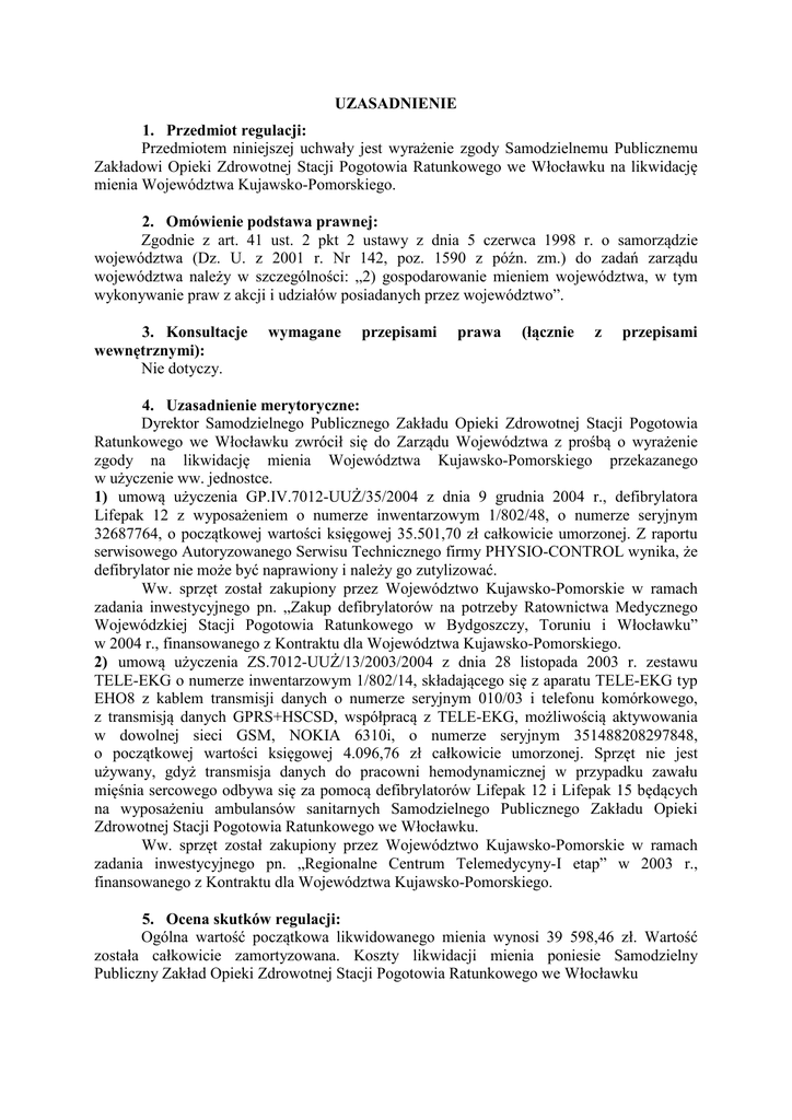 UZASADNIENIE 1. Przedmiot regulacji: Przedmiotem niniejszej uchwały jest wyrażenie zgody Samodzielnemu Publicznemu Zakładowi Opieki Zdrowotnej Stacji Pogotowia Ratunkowego we Włocławku na likwidację mienia Województwa Kujawsko-Pomorskiego. 2. Omówienie podstawa prawnej: Zgodnie z art. 41 ust. 2 pkt 2 ustawy z dnia 5 czerwca 1998 r. o samorządzie województwa (Dz. U. z 2001 r. Nr 142, poz. 1590 z późn. zm.) do zadań zarządu województwa należy w szczególności: „2) gospodarowanie mieniem województwa, w tym wykonywanie praw z akcji i udziałów posiadanych przez województwo”. 3. Konsultacje wewnętrznymi): Nie dotyczy. wymagane przepisami prawa (łącznie z przepisami 4. Uzasadnienie merytoryczne: Dyrektor Samodzielnego Publicznego Zakładu Opieki Zdrowotnej Stacji Pogotowia Ratunkowego we Włocławku zwrócił się do Zarządu Województwa z prośbą o wyrażenie zgody na likwidację mienia Województwa Kujawsko-Pomorskiego przekazanego w użyczenie ww. jednostce. 1) umową użyczenia GP.IV.7012-UUŻ/35/2004 z dnia 9 grudnia 2004 r., defibrylatora Lifepak 12 z wyposażeniem o numerze inwentarzowym 1/802/48, o numerze seryjnym 32687764, o początkowej wartości księgowej 35.501,70 zł całkowicie umorzonej. Z raportu serwisowego Autoryzowanego Serwisu Technicznego firmy PHYSIO-CONTROL wynika, że defibrylator nie może być naprawiony i należy go zutylizować. Ww. sprzęt został zakupiony przez Województwo Kujawsko-Pomorskie w ramach zadania inwestycyjnego pn. „Zakup defibrylatorów na potrzeby Ratownictwa Medycznego Wojewódzkiej Stacji Pogotowia Ratunkowego w Bydgoszczy, Toruniu i Włocławku” w 2004 r., finansowanego z Kontraktu dla Województwa Kujawsko-Pomorskiego. 2) umową użyczenia ZS.7012-UUŻ/13/2003/2004 z dnia 28 listopada 2003 r. zestawu TELE-EKG o numerze inwentarzowym 1/802/14, składającego się z aparatu TELE-EKG typ EHO8 z kablem transmisji danych o numerze seryjnym 010/03 i telefonu komórkowego, z transmisją danych GPRS+HSCSD, współpracą z TELE-EKG, możliwością aktywowania w dowolnej sieci GSM, NOKIA 6310i, o numerze seryjnym 351488208297848, o początkowej wartości księgowej 4.096,76 zł całkowicie umorzonej. Sprzęt nie jest używany, gdyż transmisja danych do pracowni hemodynamicznej w przypadku zawału mięśnia sercowego odbywa się za pomocą defibrylatorów Lifepak 12 i Lifepak 15 będących na wyposażeniu ambulansów sanitarnych Samodzielnego Publicznego Zakładu Opieki Zdrowotnej Stacji Pogotowia Ratunkowego we Włocławku. Ww. sprzęt został zakupiony przez Województwo Kujawsko-Pomorskie w ramach zadania inwestycyjnego pn. „Regionalne Centrum Telemedycyny-I etap” w 2003 r., finansowanego z Kontraktu dla Województwa Kujawsko-Pomorskiego. 5. Ocena skutków regulacji: Ogólna wartość początkowa likwidowanego mienia wynosi 39 598,46 zł. Wartość została całkowicie zamortyzowana. Koszty likwidacji mienia poniesie Samodzielny Publiczny Zakład Opieki Zdrowotnej Stacji Pogotowia Ratunkowego we Włocławku