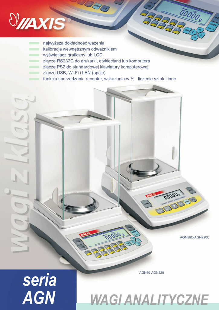 najwy¿sza dok³adnoœæ wa¿enia kalibracja wewnêtrznym odwa¿nikiem wyœwietlacz graficzny lub LCD z³¹cze RS232C do drukarki, etykieciarki lub komputera z³¹cze PS2 do standardowej klawiatury komputerowej z³¹cza USB, Wi-Fi i LAN (opcje) funkcja sporz¹dzania receptur, wskazania w %, liczenie sztuk i inne AGN50C-AGN220C seria AGN AGN50-AGN220 WAGI ANALITYCZNE ISO M 9001:2000 WAGI ANALITYCZNE seria AGN i AGN/C Wagi analityczne serii AGN i AGN/C przeznaczone s¹ do stosowania w laboratoriach, aptekach, zak³adach jubilerskich i instytutach badawczych, gdzie wymagana jest bardzo wysoka dok³adnoœæ pomiaru. Wagi posiadaj¹ uk³ad kalibracji wewnêtrznym odwa¿nikiem, który zapewnia utrzymanie dok³adnoœci pomiarów wagi w czasie eksploatacji bez potrzeby ingerencji u¿ytkownika. Sprawdzone rozwi¹zanie konstrukcyjne mechanizmów wag zapewnia im wieloletni¹ eksploatacjê. Opcje na zamówienie: Obszerna, zamykana przesuwanymi szybkami z trzech stron, komora wa¿enia umo¿liwia wygodn¹ i efektywn¹ pracê w pomieszczeniach, gdzie niemo¿liwe jest wyeliminowanie ruchów powietrza. W wagach serii AGN du¿y, podœwietlony wyœwietlacz graficzny pozwala na ³atwe odczytywanie wyników wa¿enia, a przejrzyste menu i podpowiedzi tekstowe sprawiaj¹, ¿e obs³uga wagi jest ³atwa i szybka. Wagi serii AGN/C wyposa¿ono w podœwietlony wyœwietlacz cyfrowy LCD i podstawowy zestaw klawiszy wystarczaj¹cy do standardowych zastosowañ wag. Wszystkie wagi otrzymuj¹ pe³ny zestaw funkcji specjalnych: Zestaw Hydro AGN liczenie sztuk jednakowych detali, wyliczanie zmian masy w procentach, sporz¹dzanie receptur, zmiana jednostek pomiarowych (ct, lb, oz, ozt) i inne. A B Z³¹cze RS232C pozwala na pod³¹czenie drukarki, etykieciarki lub komputera w celu 1 Masa [g] 2 10,2010 drukowania kwitów, raportów lub archiwizacji wyników wa¿enia. Drukowane raporty 9,9061 3 s¹ zgodne z wymaganiami procedur GLP. Program komputerowy Procell umo¿liwia 4 10,1054 bezpoœrednie umieszczanie wyników wa¿enia w arkuszu kalkulacyjnym Excel. 5 10,5554 9,8005 6 Wszystkie wagi spe³niaj¹ wymagania przepisów Unii Europejskiej, o czym informuje 7 10,3201 znak CE na tabliczce firmowej. Na zamówienie wszystkie wagi mog¹ byæ wzorcowane, typy wag wskazane w tabeli mog¹ byæ poddane legalizacji WE. Eksport wyników Wagi legalizowane dodatkowo otrzymuj¹ oznakowanie metrologiczne M . do arkusza Excel Opcje na zamówienie: zestaw Hydro AGN do pomiaru gêstoœci cia³ sta³ych i cieczy Interfejsy USB, LAN lub Wi-Fi, z³¹cze PS2 do klawiatury komputerowej z³¹cze RS232C do wprowadzania danych za pomoc¹ skanera zegar wewnêtrzny, wyjœcie transoptorowe do selekcji progowej Dane techniczne AGN50(C) AGN100(C) AGN200(C) AGN220(C) 50g 100g 200g 220g 0,1mg 0,1mg 0,1mg 0,1mg Dzia³ka legalizacyjna (e) 1mg 1mg 1mg 1mg Zakres tarowania Klasa dok³adnoœci -50g -100g -200g -220g Obci¹¿enie (Max) Dzia³ka odczytowa (d) I +18 ÷ +33°C Temperatura pracy Czas wa¿enia <6s Wymiar szalki Gabaryty Interfejsy f 90mm 215(z nó¿kami 235)x345x350mm w standardzie: RS232C, PS2 (tylko AGN), opcje: USB, LAN lub Wi-Fi Wymiary komory wa¿enia Zasilanie 175x140x230mm ~230V 50Hz 6VA / =12V 1,2A Masa wagi Zalecany odwa¿nik kalibracyjny (OIML) Mo¿liwoœæ legalizacji WE 6,5kg E2 50g E2 100g E2 200g M M M E2 200g - AXIS Sp. z o.o. 80-125 Gdañsk, ul.Kartuska 375B, tel. +48 58 320 63 01...03, fax 320 63 00 www.axis.pl e-mail: [email protected] 2013-02 Typ wagi