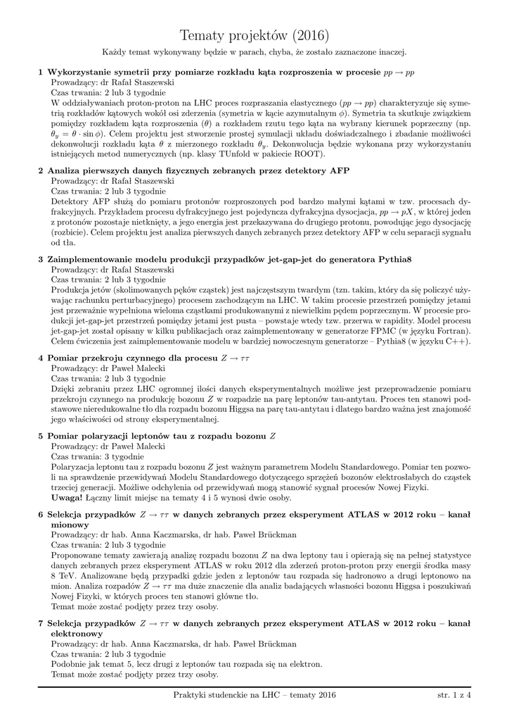 Tematy projektów (2016) Każdy temat wykonywany będzie w parach, chyba, że zostało zaznaczone inaczej. 1 Wykorzystanie symetrii przy pomiarze rozkładu kąta rozproszenia w procesie pp → pp Prowadzący: dr Rafał Staszewski Czas trwania: 2 lub 3 tygodnie W oddziaływaniach proton-proton na LHC proces rozpraszania elastycznego (pp → pp) charakteryzuje się symetrią rozkładów kątowych wokół osi zderzenia (symetria w kącie azymutalnym φ). Symetria ta skutkuje związkiem pomiędzy rozkładem kąta rozproszenia (θ) a rozkładem rzutu tego kąta na wybrany kierunek poprzeczny (np. θy = θ · sin φ). Celem projektu jest stworzenie prostej symulacji układu doświadczalnego i zbadanie możliwości dekonwolucji rozkładu kąta θ z mierzonego rozkładu θy . Dekonwolucja będzie wykonana przy wykorzystaniu istniejących metod numerycznych (np. klasy TUnfold w pakiecie ROOT). 2 Analiza pierwszych danych fizycznych zebranych przez detektory AFP Prowadzący: dr Rafał Staszewski Czas trwania: 2 lub 3 tygodnie Detektory AFP służą do pomiaru protonów rozproszonych pod bardzo małymi kątami w tzw. procesach dyfrakcyjnych. Przykładem procesu dyfrakcyjnego jest pojedyncza dyfrakcyjna dysocjacja, pp → pX, w której jeden z protonów pozostaje nietknięty, a jego energia jest przekazywana do drugiego protonu, powodując jego dysocjację (rozbicie). Celem projektu jest analiza pierwszych danych zebranych przez detektory AFP w celu separacji sygnału od tła. 3 Zaimplementowanie modelu produkcji przypadków jet-gap-jet do generatora Pythia8 Prowadzący: dr Rafał Staszewski Czas trwania: 2 lub 3 tygodnie Produkcja jetów (skolimowanych pęków cząstek) jest najczęstszym twardym (tzn. takim, który da się policzyć używając rachunku perturbacyjnego) procesem zachodzącym na LHC. W takim procesie przestrzeń pomiędzy jetami jest przeważnie wypełniona wieloma cząstkami produkowanymi z niewielkim pędem poprzecznym. W procesie produkcji jet-gap-jet przestrzeń pomiędzy jetami jest pusta – powstaje wtedy tzw. przerwa w rapidity. Model procesu jet-gap-jet został opisany w kilku publikacjach oraz zaimplementowany w generatorze FPMC (w języku Fortran). Celem ćwiczenia jest zaimplementowanie modelu w bardziej nowoczesnym generatorze – Pythia8 (w języku C++). 4 Pomiar przekroju czynnego dla procesu Z → τ τ Prowadzący: dr Paweł Malecki Czas trwania: 2 lub 3 tygodnie Dzięki zebraniu przez LHC ogromnej ilości danych eksperymentalnych możliwe jest przeprowadzenie pomiaru przekroju czynnego na produkcję bozonu Z w rozpadzie na parę leptonów tau-antytau. Proces ten stanowi podstawowe nieredukowalne tło dla rozpadu bozonu Higgsa na parę tau-antytau i dlatego bardzo ważna jest znajomość jego właściwości od strony eksperymentalnej. 5 Pomiar polaryzacji leptonów tau z rozpadu bozonu Z Prowadzący: dr Paweł Malecki Czas trwania: 3 tygodnie Polaryzacja leptonu tau z rozpadu bozonu Z jest ważnym parametrem Modelu Standardowego. Pomiar ten pozwoli na sprawdzenie przewidywań Modelu Standardowego dotyczącego sprzężeń bozonów elektrosłabych do cząstek trzeciej generacji. Możliwe odchylenia od przewidywań mogą stanowić sygnał procesów Nowej Fizyki. Uwaga! Łączny limit miejsc na tematy 4 i 5 wynosi dwie osoby. 6 Selekcja przypadków Z → τ τ w danych zebranych przez eksperyment ATLAS w 2012 roku – kanał mionowy Prowadzący: dr hab. Anna Kaczmarska, dr hab. Paweł Brückman Czas trwania: 2 lub 3 tygodnie Proponowane tematy zawierają analizę rozpadu bozonu Z na dwa leptony tau i opierają się na pełnej statystyce danych zebranych przez eksperyment ATLAS w roku 2012 dla zderzeń proton-proton przy energii środka masy 8 TeV. Analizowane będą przypadki gdzie jeden z leptonów tau rozpada się hadronowo a drugi leptonowo na mion. Analiza rozpadów Z → τ τ ma duże znaczenie dla analiz badających własności bozonu Higgsa i poszukiwań Nowej Fizyki, w których proces ten stanowi główne tło. Temat może zostać podjęty przez trzy osoby. 7 Selekcja przypadków Z → τ τ w danych zebranych przez eksperyment ATLAS w 2012 roku – kanał elektronowy Prowadzący: dr hab. Anna Kaczmarska, dr hab. Paweł Brückman Czas trwania: 2 lub 3 tygodnie Podobnie jak temat 5, lecz drugi z leptonów tau rozpada się na elektron. Temat może zostać podjęty przez trzy osoby. Praktyki studenckie na LHC – tematy 2016 str. 1 z 4 8 Optymalizacja kryteriów selekcji dla rozpadu Λc → pµµ za pomocą wielowymiarowej analizy danych Prowadzący: prof. dr hab. Mariusz Witek Czas trwania: 2 lub 3 tygodnie Poszukiwany rozpad barionu Λc → pµµ jest rozpadem rzadkim (stosunek rozpadu rzędu 10−8 ). Zaobserwowanie tego rozpadu z wyższym od przewidywanego stosunkiem rozpadu mogłoby być wskazówką efektów spoza Modelu Standardowego. Analiza polegała będzie na przeprowadzeniu optymalizacji selekcji za pomocą pakietu do wielowymiarowej analizy danych TMVA. W tym celu wykorzystane zostaną dane z eksperymentu LHCb zebrane w latach 2011–2012 w formie NTupli. Po zdefiniowaniu szerokiej listy parametrów nastąpi trening TMVA w celu zawężenia zestawu parametrów. Zaobserwowany zostanie rozpad Λc → pφ. Jednym z ubocznych wyników analizy będzie prawdopodobnie obserwacja nowego niezmierzonego jeszcze rozpadu Λc → pΩ. 9 Optymalizacja parametrów analizy wielu zmiennych dla separacji tła w rozpadach bozonu Higgsa na dwa kwarki piękne Prowadzący: dr hab. inż. Marcin Kucharczyk Czas trwania: 2 lub 3 tygodnie Główną trudnością przy poszukiwaniu bozonu Higgsa jest ogromne tło od znacznie silniejszych procesów zachodzących podczas nieelastycznych zderzeń proton-proton. Analiza polegała będzie na przeprowadzeniu optymalizacji selekcji za pomocą pakietu do wielowymiarowej analizy danych TMVA w celu zmaksymalizowania redukcji tła przy zachowaniu odpowiednio wysokiej wydajności dla poszukiwanego sygnału. W tym celu wykorzystane zostaną dan