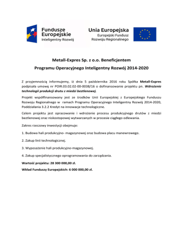 Metall-Expres Sp. z o.o. Beneficjentem Programu Operacyjnego Inteligentny Rozwój 2014-2020 Z przyjemnością informujemy, iż dnia 5 października 2016 roku Spółka Metall-Expres podpisała umowę nr POIR.03.02.02-00-0038/16 o dofinansowanie projektu pn. Wdrożenie technologii produkcji drutu z miedzi beztlenowej. Projekt współfinansowany jest ze środków Unii Europejskiej z Europejskiego Funduszu Rozwoju Regionalnego w ramach Programu Operacyjnego Inteligentny Rozwój 2014-2020, Poddziałania 3.2.2 Kredyt na innowacje technologiczne. Celem projektu jest opracowanie i wdrożenie procesu produkcyjnego drutów z miedzi beztlenowej oraz niskostopowej wytwarzanych w procesie ciągłego odlewania. Zakres rzeczowy inwestycji obejmuje: 1. Budowa hali produkcyjno- magazynowej oraz budowa placu manewrowego. 2. Zakup linii technologicznej. 3. Wyposażenie hali produkcyjno-magazynowej. 4. Zakup specjalistycznego oprogramowania do zarządzania. Wartość projektu: 28 300 000,00 zł. Wkład Funduszy Europejskich: 6 000 000,00 zł.