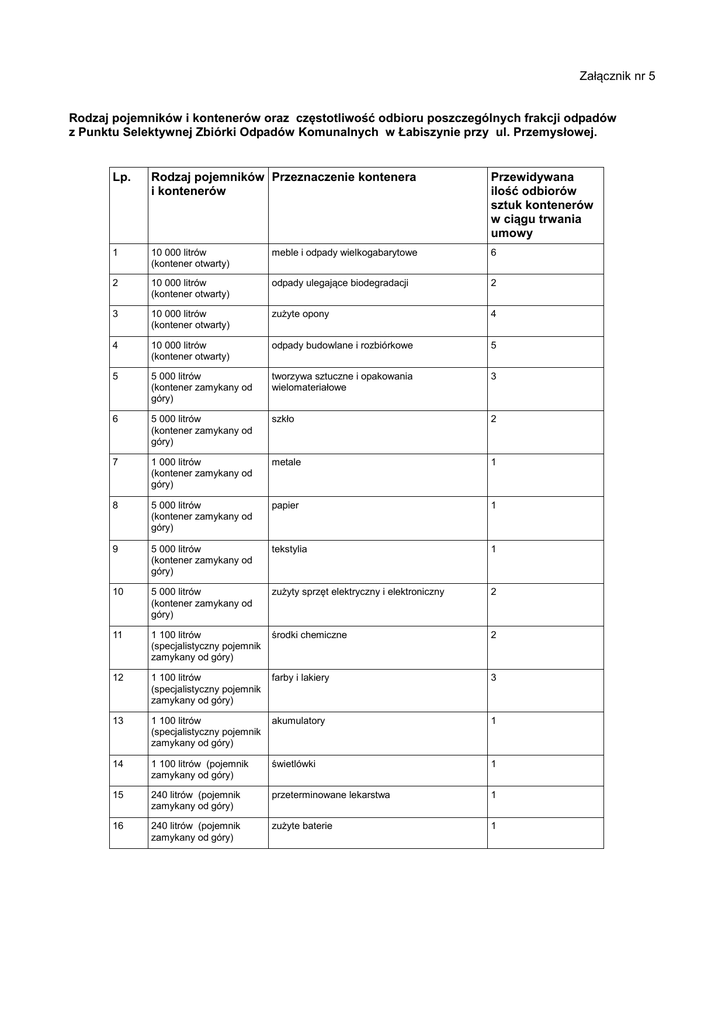 Załącznik nr 5 Rodzaj pojemników i kontenerów oraz częstotliwość odbioru poszczególnych frakcji odpadów z Punktu Selektywnej Zbiórki Odpadów Komunalnych w Łabiszynie przy ul. Przemysłowej. Lp. Rodzaj pojemników Przeznaczenie kontenera i kontenerów Przewidywana ilość odbiorów sztuk kontenerów w ciągu trwania umowy 1 10 000 litrów (kontener otwarty) meble i odpady wielkogabarytowe 6 2 10 000 litrów (kontener otwarty) odpady ulegające biodegradacji 2 3 10 000 litrów (kontener otwarty) zużyte opony 4 4 10 000 litrów (kontener otwarty) odpady budowlane i rozbiórkowe 5 5 5 000 litrów (kontener zamykany od góry) tworzywa sztuczne i opakowania wielomateriałowe 3 6 5 000 litrów (kontener zamykany od góry) szkło 2 7 1 000 litrów (kontener zamykany od góry) metale 1 8 5 000 litrów (kontener zamykany od góry) papier 1 9 5 000 litrów (kontener zamykany od góry) tekstylia 1 10 5 000 litrów (kontener zamykany od góry) zużyty sprzęt elektryczny i elektroniczny 2 11 1 100 litrów (specjalistyczny pojemnik zamykany od góry) środki chemiczne 2 12 1 100 litrów (specjalistyczny pojemnik zamykany od góry) farby i lakiery 3 13 1 100 litrów (specjalistyczny pojemnik zamykany od góry) akumulatory 1 14 1 100 litrów (pojemnik zamykany od góry) świetlówki 1 15 240 litrów (pojemnik zamykany od góry) przeterminowane lekarstwa 1 16 240 litrów (pojemnik zamykany od góry) zużyte baterie 1
