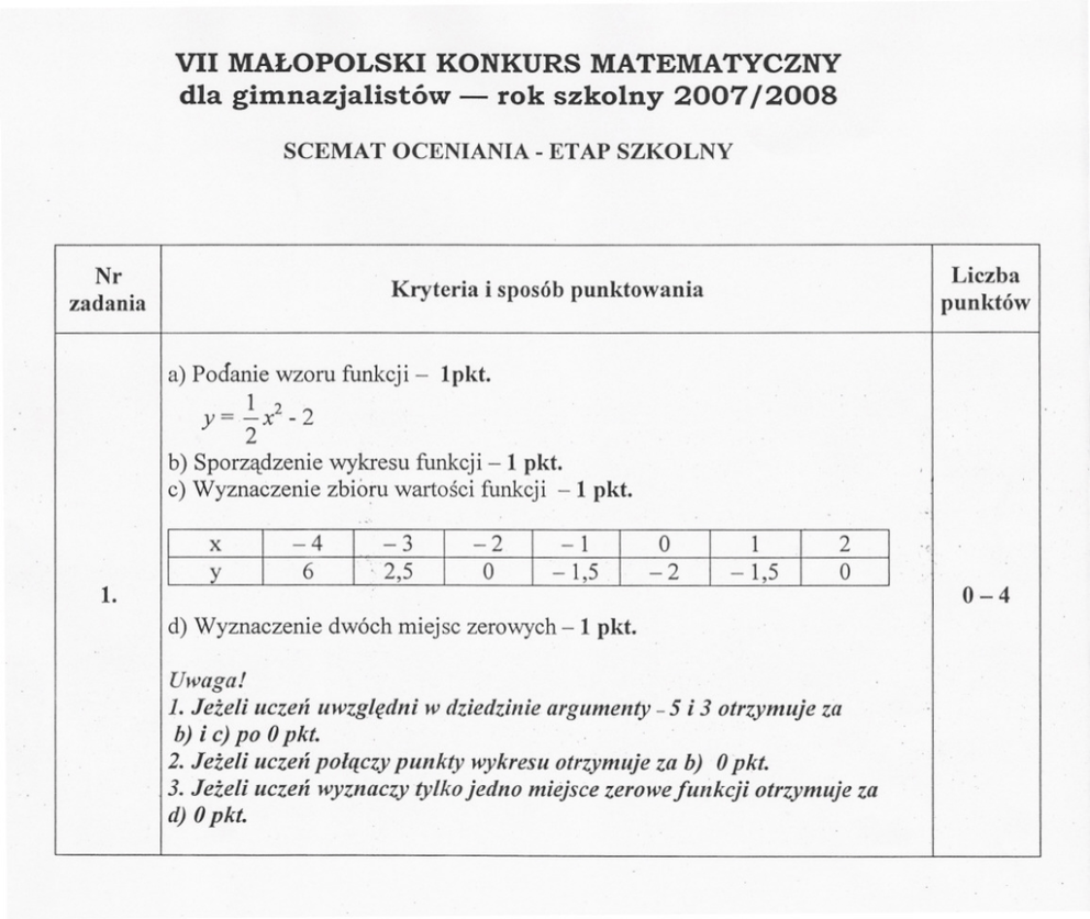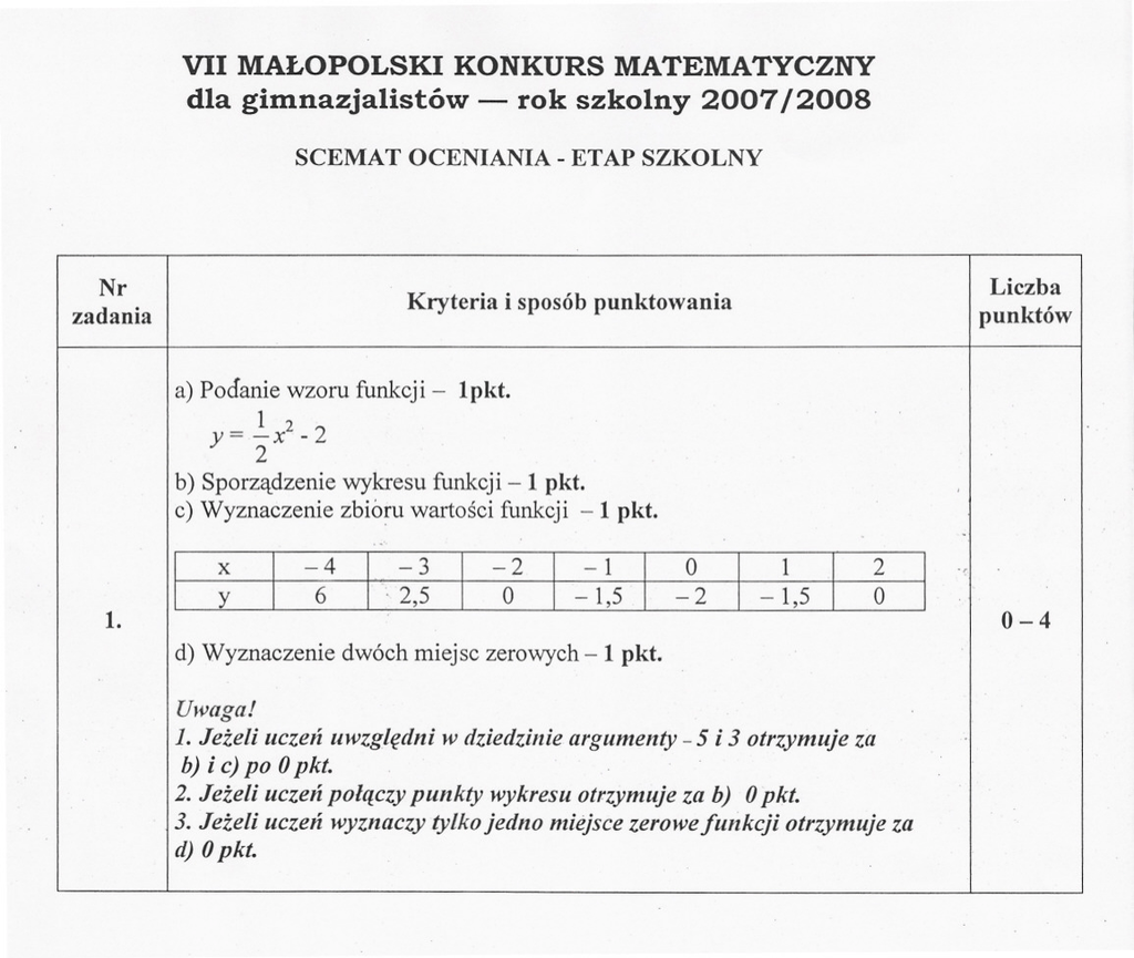 VII MALOPOLSKI KONKURS MATEMATYCZNY dla gimnazjalistów - rok szkolny 2007/2008 SCEMAT OCENIANIA Nr zadania -ETAP SZKOLNY Liczba punktów Kryteria i sposób punktowania a) Podanie wzoru funkcji - lpkt. 1 Y = -x 2 2 -2 b) Sporzadzeniewykresufunkcji- 1 pkt. c) Wyznaczenie zbió~ wartosci funkcji - 1 pkt. o -2 l. 1 - 1,5 d) Wyznaczenie dwóch miejsc zerowych - 1 pkt. Uwaga! 1. Jezeli uczen uwzgledni w dziedzinie argumenty - 5 i 3 otrzymuje za b) i c) po Opkt. 2. Jezeli uczen polaczy punkty wykresu otrzymuje za b) Opkt. 3. Jezeli uczen wyznaczy tylko jedno miejsce zerowefunkcji otrzymuje za d) Opkt. 0-4 x : cena towaru, k: szukany procent obnizki Wyznaczenie ceny towaru po drugiej obnizce: (x -1tJ1ox) -1tJ1o(x-1tJ1ox) l pkt Zapisanie równania opisujacego warunki zadania (x -1tJ1o x) -1tJ1o(x -1tJ1o x) = 0,64 x l pkt. Poprawne rozwiazanie równania: 2 pkt x(1 - 1tJ1o) - xltJlo(1 - 1tJ1o)= 0,64 x /: X=t:O / Rozwiazanie równania z jednym bledem / l pkt (1 - 1tJ1o)- 1tJ1o(1- 1tJ1o)= 0,64 (1 - 1tJ1o)(1- 1tJ1o)= 2. 0,64 (1 - 1tJ1o)2 = 0,64 i 1 - ItJIo> Oczyli k 8 1- = -stad k=20 100 10 Sprawdzenie otrzymanego wyniku z warunkami zadania 0-5 l pkt Uwaga! 1. Jezeli uczenprzyjmie konkretna cene towarunp. x =100zl i stosujacdla tej ceny poprawna metode, wyznaczy szukany procent obnizki oraz sprawdZI uzyskany wynik Z warunkami zadania otrzymuje za rozwiazanie zadania maksymalnie 3 pkt .I rozpatrzenie szczególnego przypadku / 2. Jezeli uczen stosuje bledna metode / zle zapisuje lub oblicza ceny towaru' po kolejnych obnizkach, blednie zapisuje równanie I, to bez wzgledu na poprawnosc prowadzonych obliczen, otrzymuje Opkt. 3. Wybórpoprawnejmetodyrozwiazaniazadania- l pkt. Wykonanie przeksztalcen zgodnych z wybrana metoda - 1 pkt. Wskazanie odpowiednich ulamków /2- i ~ / i sprawdzenie odpowiedzi 16 20 z warunkami zadania - 1 pkt. 4. Poprawnie wykonanie wszystkich przeksztalcen prowadzacych do równania typu: ax = b - 2 pkt. Wykonanie przeksztalcen prowadzacych do równania typu: ax = b z jednym bledem rachunkowym i prowadzenie rozumowania z konsekwencja tego bledu -1 pkt. Wyznaczenie x z równania otrzymanego w wyniku wykonanych przeksztalcen - l pkt. 0-3 0-3 Sporzadzenie rysunku z wykorzystaniem danych z zadania i dostrzezenie, ze : 1 IADI= IDEI = -IEBI- l pkt. 2 C A D E B Poprowadzenie z punktu E wysokosci EF w trójkacie BCE - 1 pkt. 5. C I ~ A D I E O- 6 B Dostrzezenie, ze trójkaty: ACD, CDE, CEF sa przystajace -1 pkt. Wyznaczeniemiarykata EBF (30°) - l pkt. Zapisanie równania z niewiadoma a , opisujacego sume katów w trójkacie ABC - l pkt. (90° a) + 3 a + 30° = 180° ..Wyznaczenie miary kata ACB ( 90° ) - l pkt. - Poprawne wyznaczenie wszystkich wymiarów wewnetrznych skrzyni - 3 pkt. dlugosc skrzyni: 45 cm - 2 x 1,5 cm = 42 cm 6. szerokosc skrzyni: 36 cm - 2 x 1,5 cm = 33 cm wysokosc skrzyni: 27 cm -1,5 cm = 25,5 cm Obliczenie pojemnosci wnetrza skrzyni (zgodnie z wyznaczonymi wymiarami) - l pkt. V = 35343 cm3 1. Za prawidlowe rozwiazanie kazdego z zadan inna metoda, zgodna z poleceniem, od przedstawionej w schemacie przyznajemy maksymalna liczbe punktów. Za czesciowe rozwiazanie liczba punktów powinna byc proporcjonalna do wykonanych czynnosci. 2. Za udzielenie nawet poprawnej odpowiedzi do zadania bez wykonanych obliczen i uzasadnien przyznajemy Opunktów. 0-4