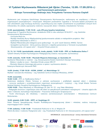 VI Tydzień Wychowania Miłosierni jak Ojciec (Tarnów, 12.09.-17.09.2016 r.) pod honorowym patronatem Biskupa Tarnowskiego Andrzeja Jeża, Prezydenta Tarnowa Romana Ciepieli Wydarzenie jest inicjatywą Katolickiego Stowarzyszenia Wychowawców, realizowaną we współpracy z kilkoma organizacjami pozarządowymi i instytucjami. Motywem przewodnim Tygodnia w Tarnowie będzie pochylenie się nad człowiekiem, jego kondycją duchową i psychofizyczną oraz mądre uwrażliwianie na przykładach różnych form miłosierdzia. Do udziału zapraszamy rodziców, nauczycieli, dzieci i młodzież, mieszkańców Tarnowa. 12.09. (poniedziałek), 17.00-19.30 – aula JPII przy bazylice katedralnej Inauguracja VI Tygodnia Wychowania i działalności KSW w roku szkolnym 2016/2017 – org. Katolickie Stowarzyszenie Wychowawców: - Uroczysta Msza św. - Występ młodzieży Bursy Międzyszkolnej (podsumowanie udziału w małopolskim projekcie Mieć wyobraźnię miłosierdzia w 2016 r.) - Wykład Miłosierdzie jako kategoria życia społecznego - ks. prof. Jacek Siewiora, MWSE, Tarnów - Szczególne wychowanie – formy pomocy dzieciom z niepełną sprawnością w Tarnowie na przykładzie Stowarzyszenia „Ich Lepsze Jutro” – Krzysztof Drwal, prezes ILJ 12, 13, 14 i 16.09. (poniedziałek, wtorek, środa, piątek), 14.00-16.00 – PPP, ul. Nadbrzeżna Dolna 7 Tydzień Otwarty Poradni Psychologiczno-Pedagogicznej (rodzice, nauczyciele, wychowawcy) 13.09. (wtorek), 16.00-18.00 – Placówki Wsparcia Dziennego, ul. Gumniska 25 Spotkanie Miłosierdzie w rodzinie – org. Stowarzyszenie Rodzin Katolickich Diecezji Tarnowskiej: - Wybacz i zaufaj na nowo – Stanisław Klimek, prezes SRK DT - Placówka Wsparcia Dziennego jako pomoc w opiece i wychowaniu dziecka – Katarzyna Maziarczyk, kierownik PWD 14.09. (środa), 17.00-18.30 – KCEM „KANA”, ul. Mościckiego 12 Wykład i warsztat dla młodzieży – org. Katolickie Centrum Edukacji Młodzieży „KANA”. 15.09. (czwartek), 10.00-12.00 – PPP, ul. Nadbrzeżna Dolna 7 Systemowe działania Miasta Tarnowa w zakresie wychowania i profilaktyki zagrożeń dzieci i młodzieży – coroczne spotkanie z przedstawicielami organizacji pozarządowych i instytucji – org. Urząd Miasta Tarnowa Wydział Edukacji, Poradnia Psychologiczno-Pedagogiczna 14.00-16.00 – Pałac Młodzieży ul. Piłsudskiego 24, sale 19 i 10 - org. Pałac Młodzieży: - Pedagogika lecznicza i organizacja czasu dla dzieci ze specyficznymi potrzebami rozwojowymi – otwarte zajęcia dla dzieci i rodziców, konsultacje indywidualne – Pracownia relaksacyjno-terapeutyczna - Punkt informacyjny dla młodzieży i rodziców zainteresowanych wolontariatem – Młodzieżowe Centrum Wolontariatu 16.09. (piątek), 8.00-15.00 – SPPT, ul. Szujskiego 25 Dzień Otwarty Specjalistycznej Poradni Profilaktyczno-Terapeutycznej (dzieci i młodzież, rodzice, instytucje wspomagające dom i szkołę) 17.09. (sobota), 11.00-15.00 – Przedszkole Publiczne nr 34, ul. Wiejska 29 Piknik dla dzieci i rodziców Pożegnanie Lata – org. Przedszkole Publiczne nr 34 i Stowarzyszenie „Ich Lepsze Jutro” INFORMACJE : www.tarnow.ksw.pl i strony internetowe Partnerów