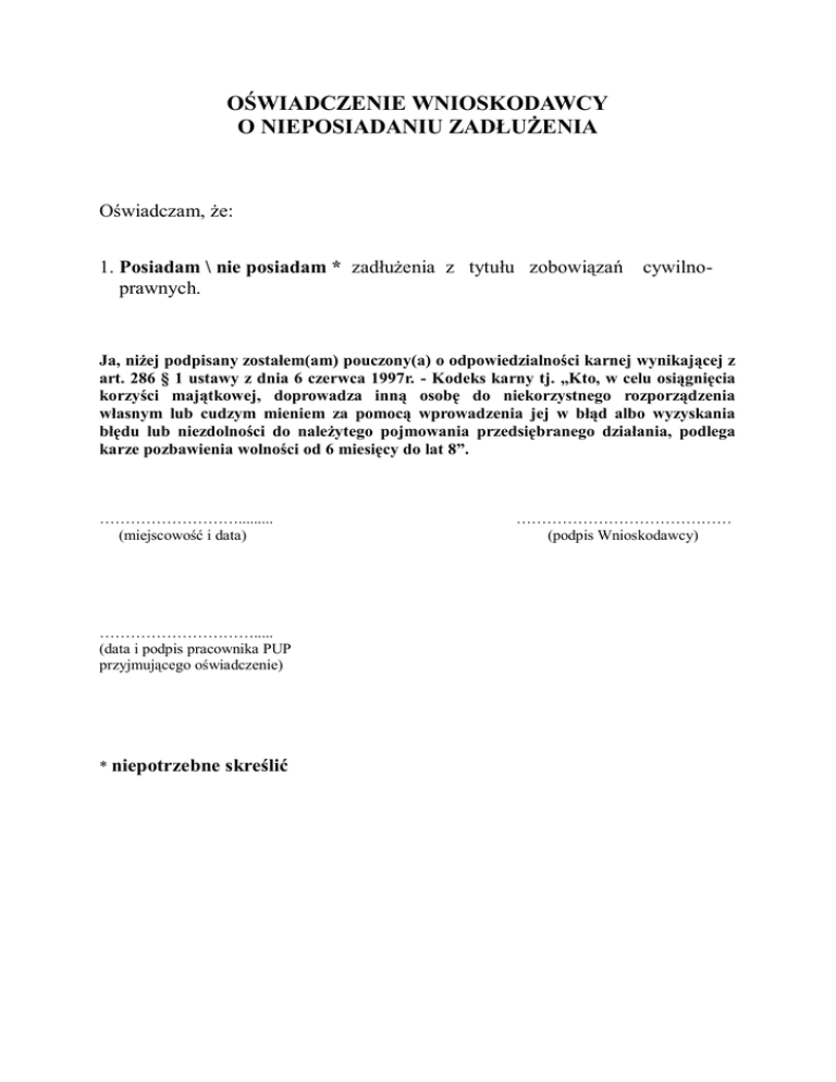 OŚWIADCZENIE WNIOSKODAWCY O NIEPOSIADANIU ZADŁUŻENIA Oświadczam, że: 1. Posiadam \ nie posiadam * zadłużenia z tytułu zobowiązań prawnych. cywilno- Ja, niżej podpisany zostałem(am) pouczony(a) o odpowiedzialności karnej wynikającej z art. 286 § 1 ustawy z dnia 6 czerwca 1997r. - Kodeks karny tj. „Kto, w celu osiągnięcia korzyści majątkowej, doprowadza inną osobę do niekorzystnego rozporządzenia własnym lub cudzym mieniem za pomocą wprowadzenia jej w błąd albo wyzyskania błędu lub niezdolności do należytego pojmowania przedsiębranego działania, podlega karze pozbawienia wolności od 6 miesięcy do lat 8”. ………………………......... (miejscowość i data) …………………………..... (data i podpis pracownika PUP przyjmującego oświadczenie) * niepotrzebne skreślić …………………………………… (podpis Wnioskodawcy)